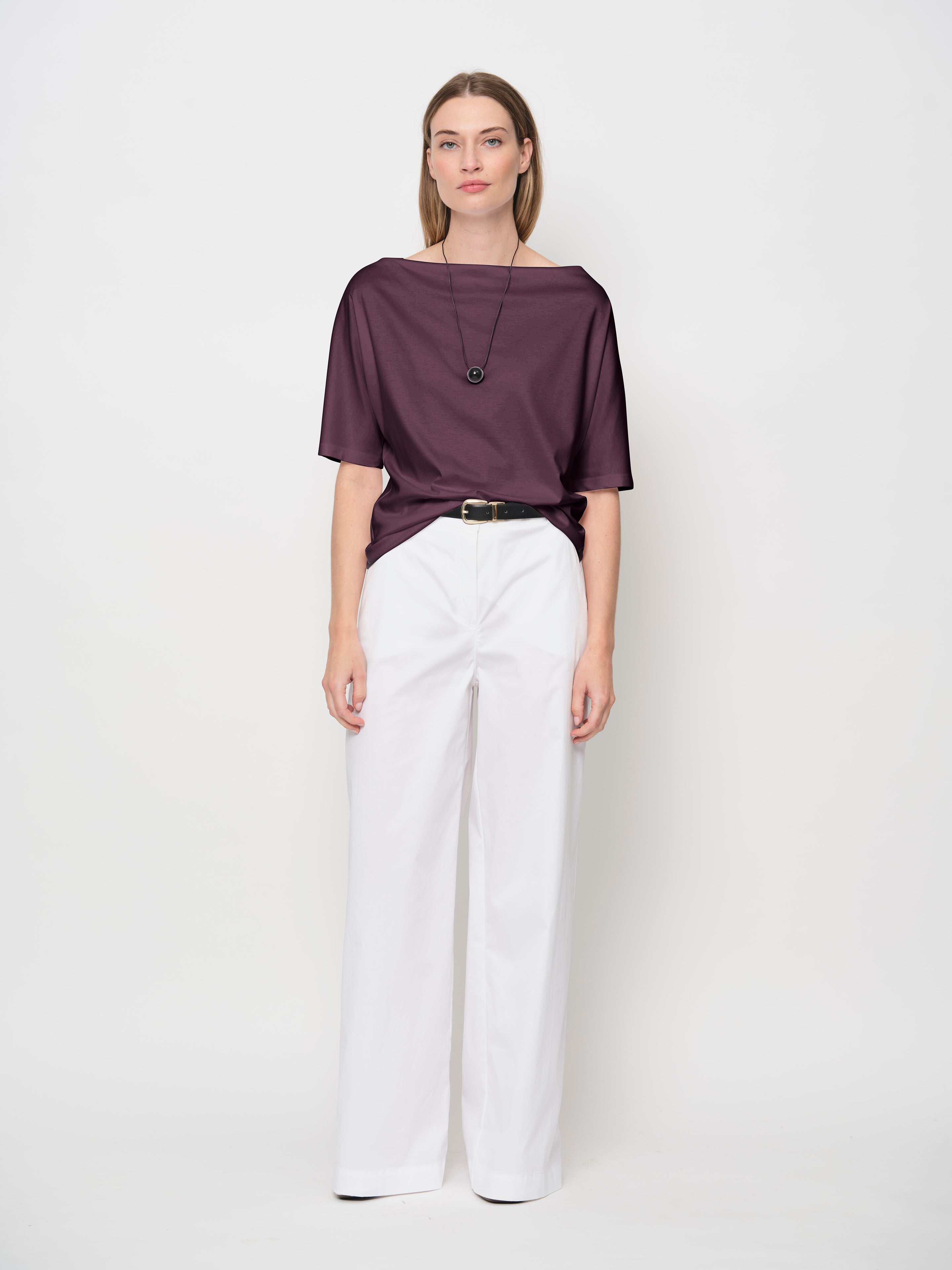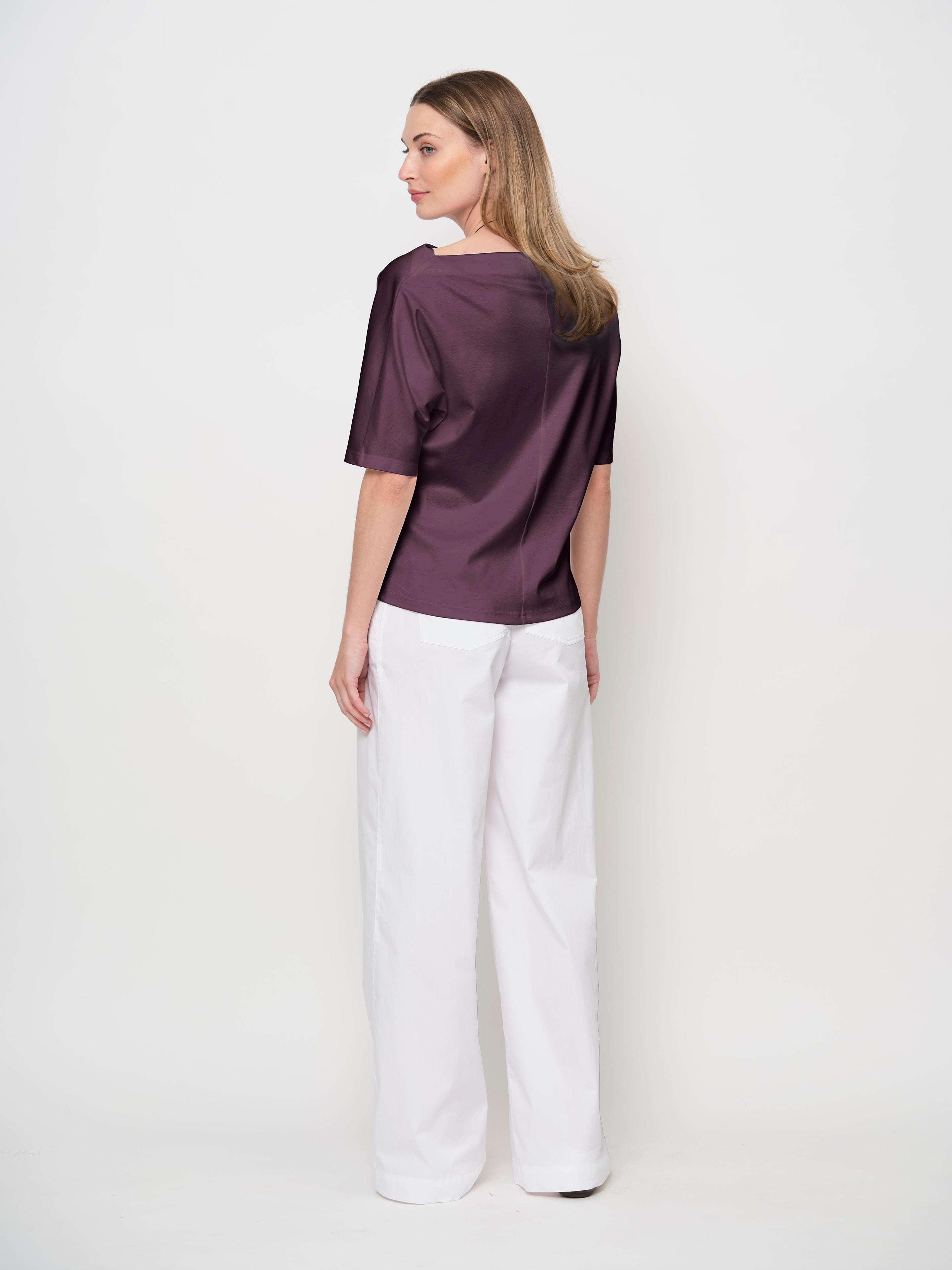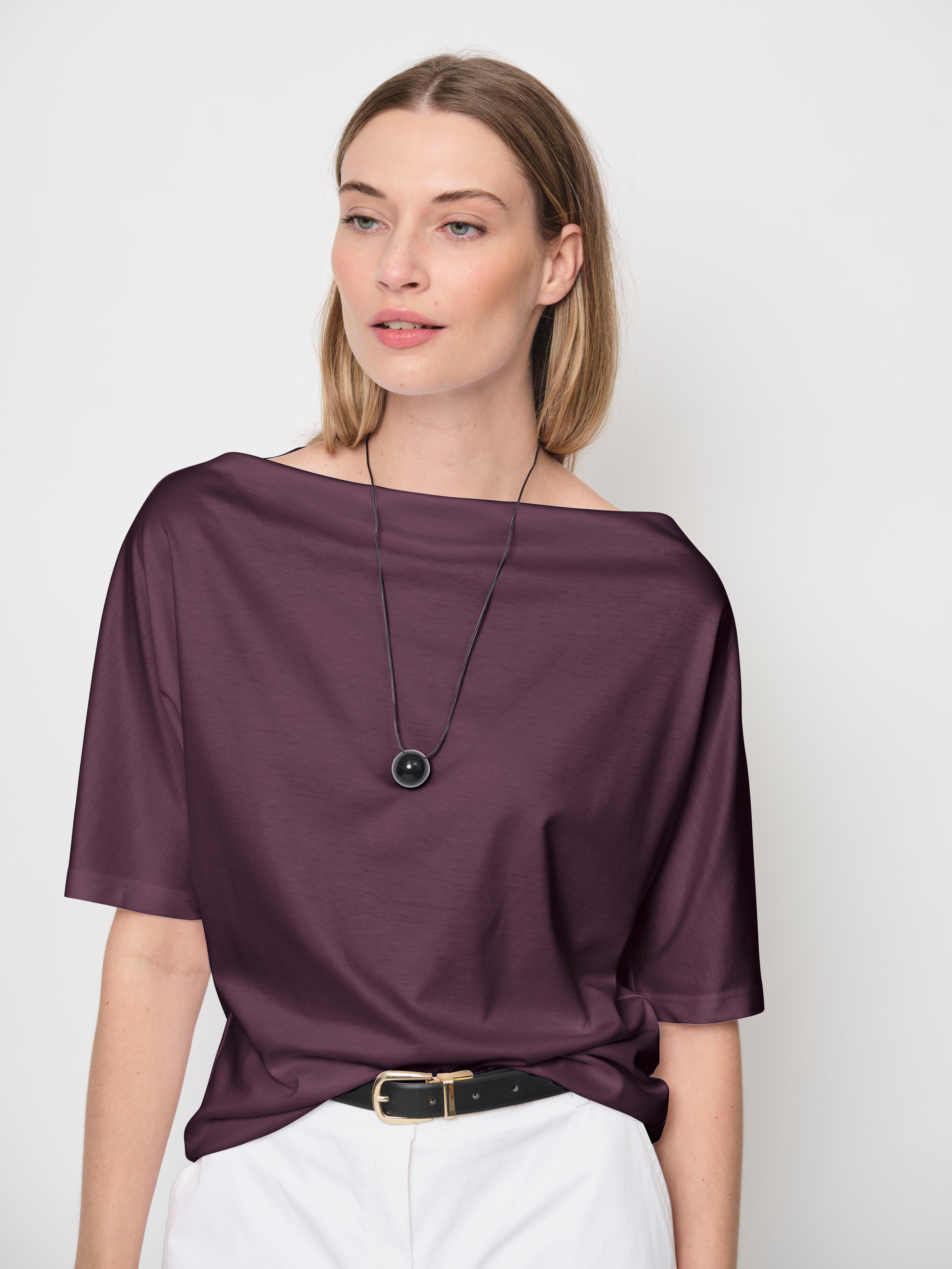 An elevated basic crafted from a TENCEL™ Lyocell jersey. This fabric is soft, silky, breathable, and slightly stretchy, providing all-day comfort. Featuring a raised boat neckline and elbow-length sleeves.
