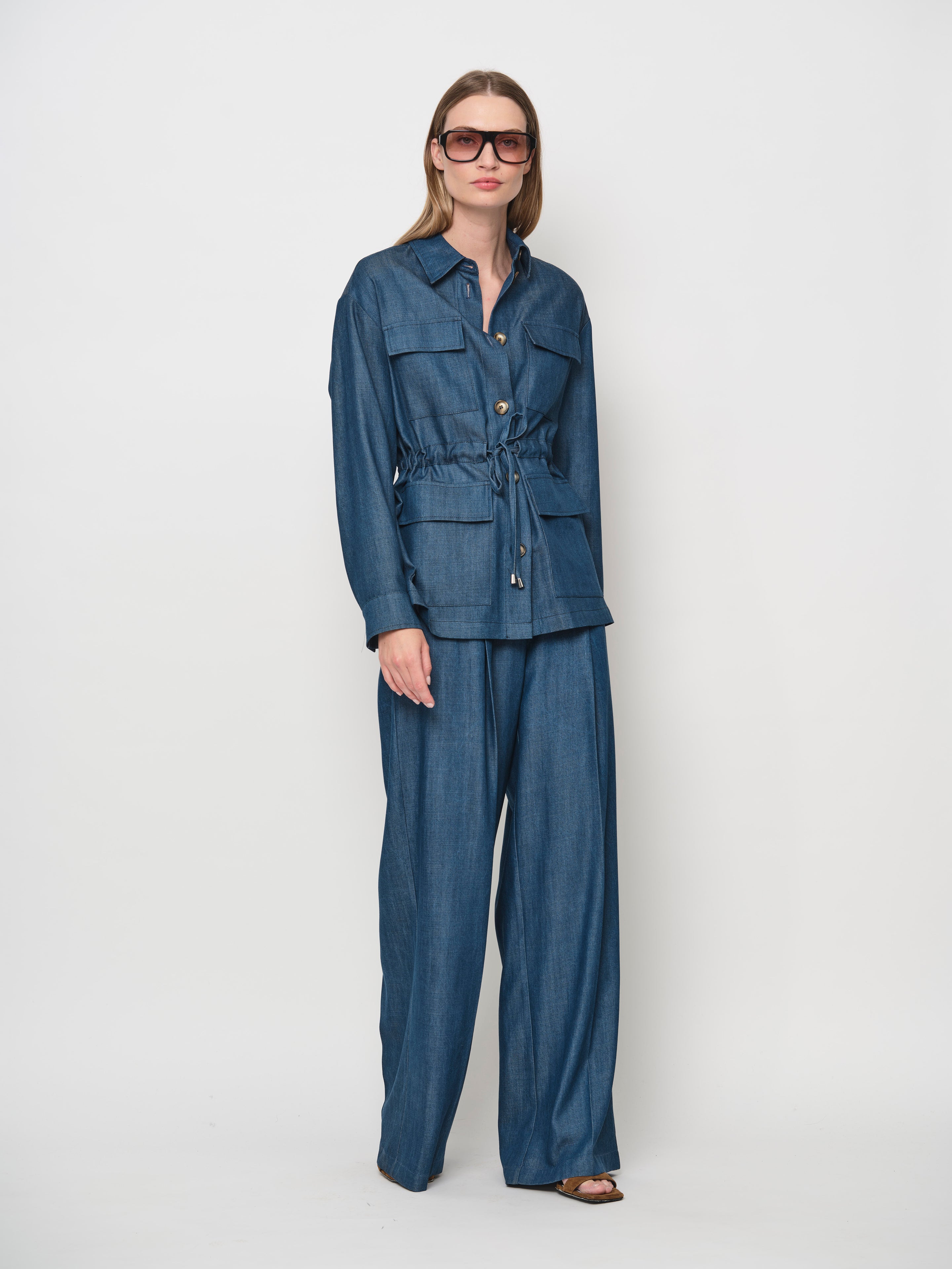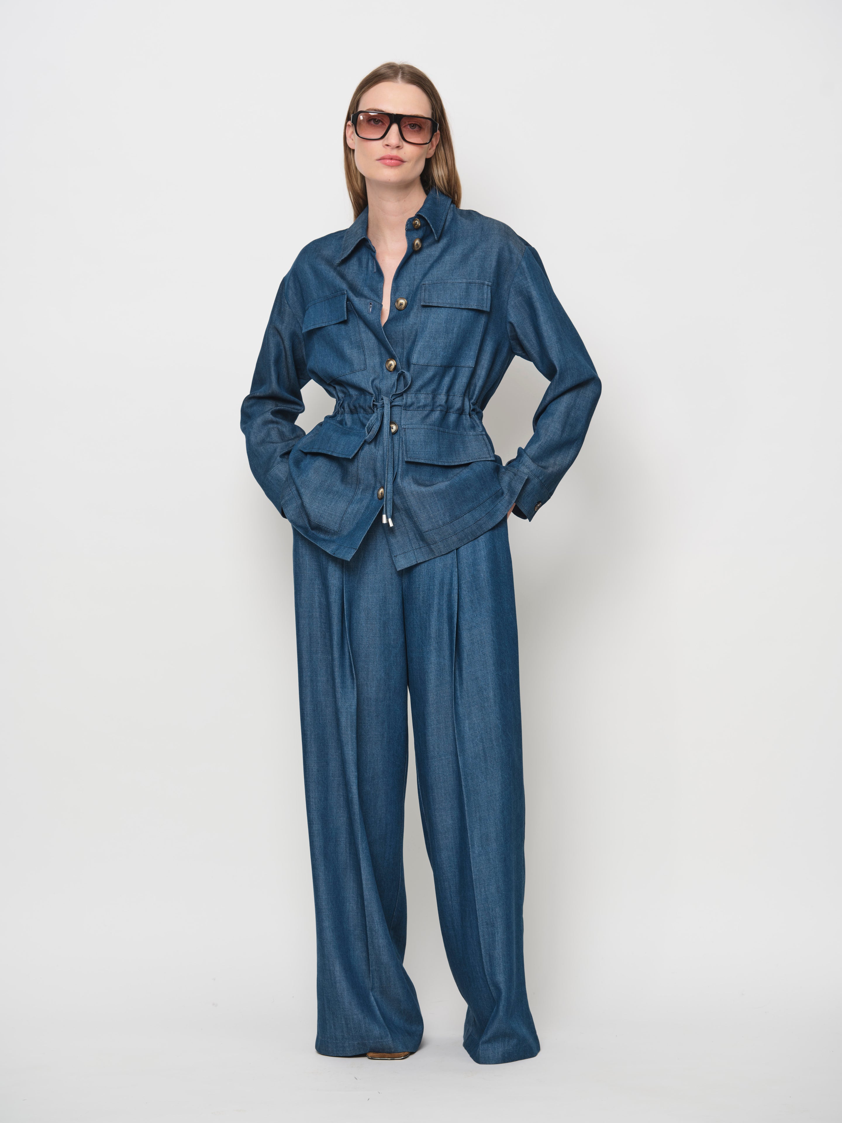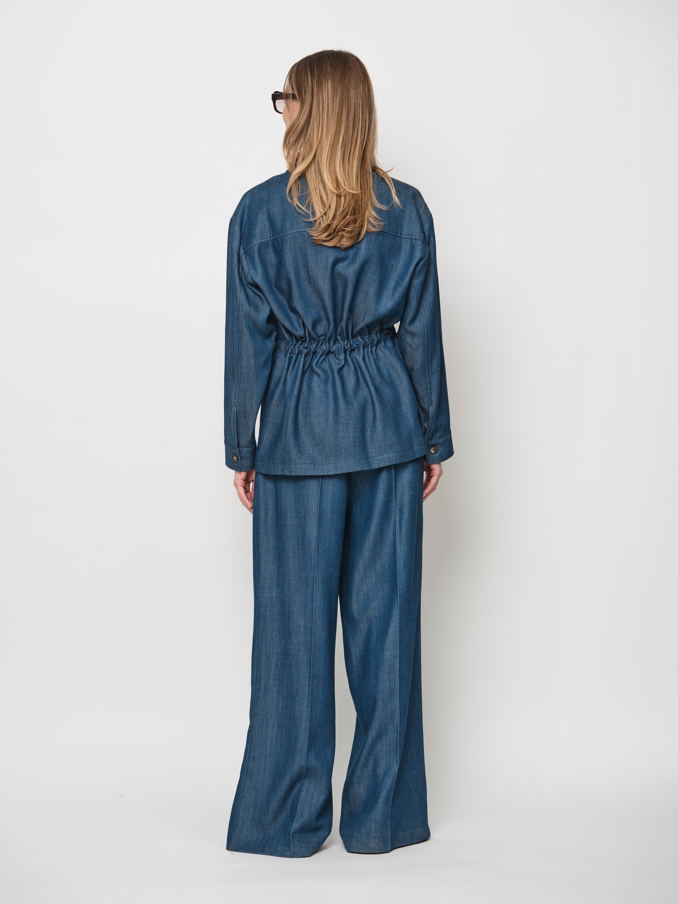 Crafted from soft, breathable, flowy Tencel denim, these high-waisted trousers feature a relaxed fit with a wide-leg silhouette and flowing pleats. Designed with a side zip and slanted side pockets. Pair with matching tops for a coordinated, statement-making look.