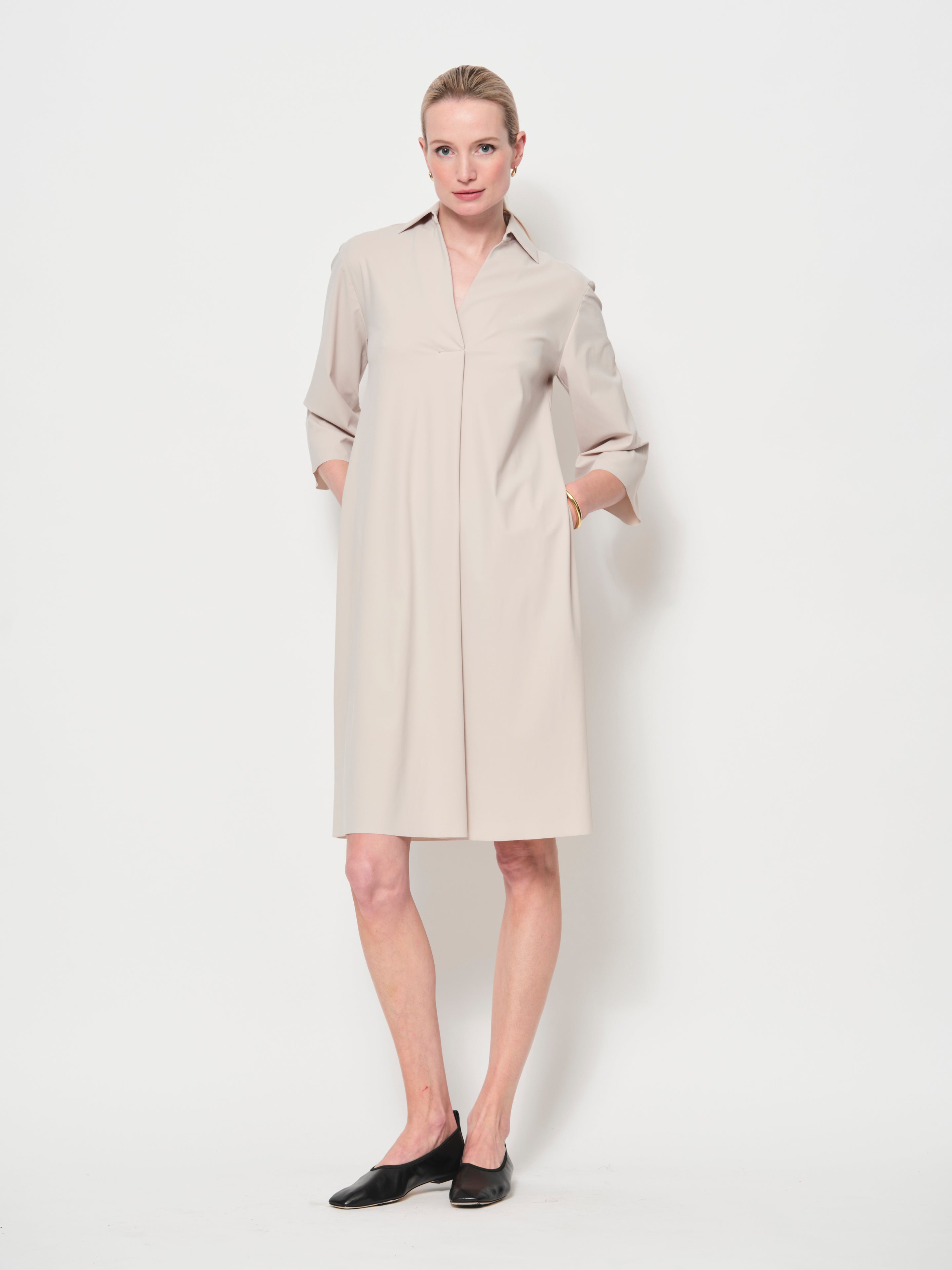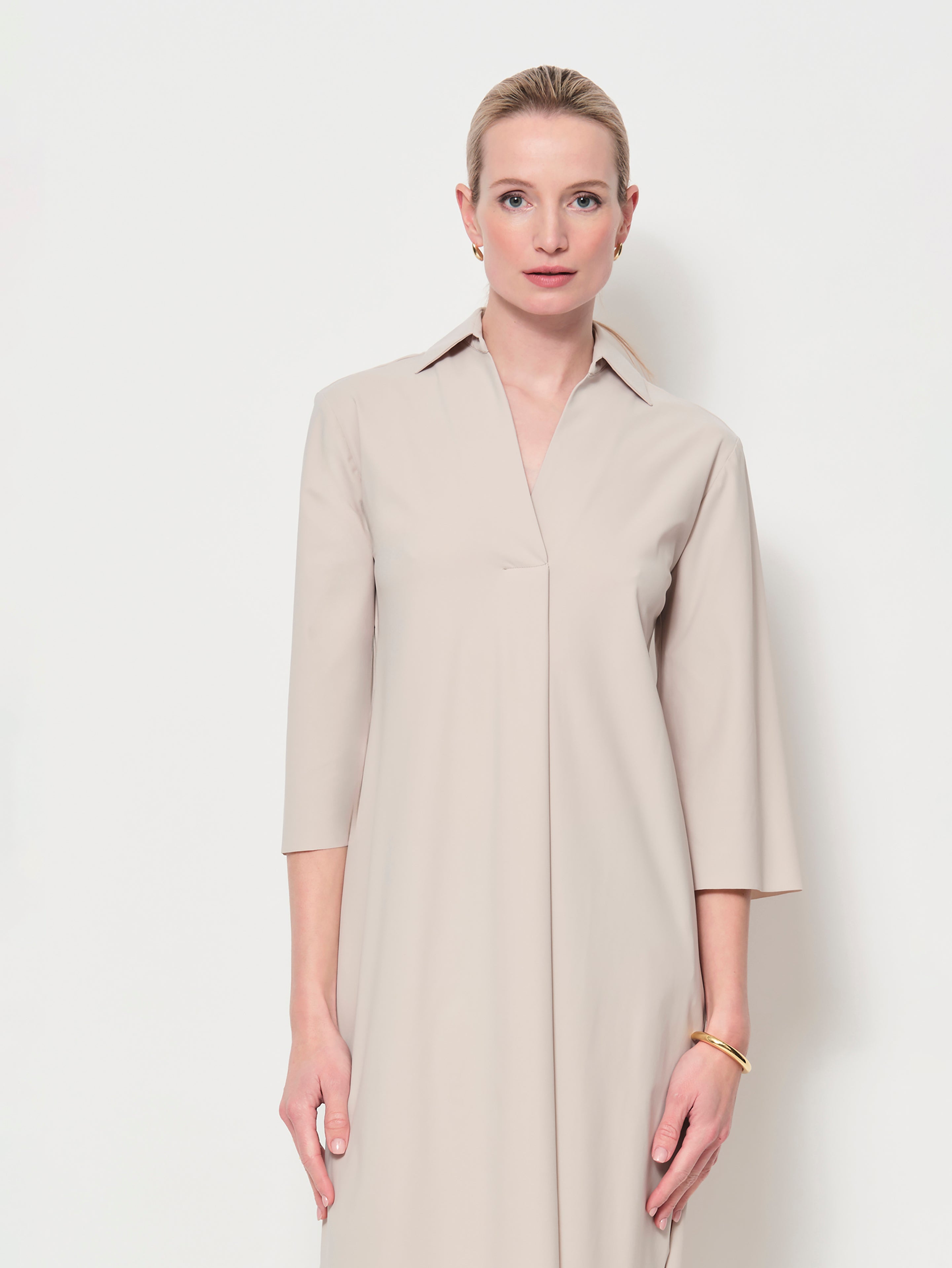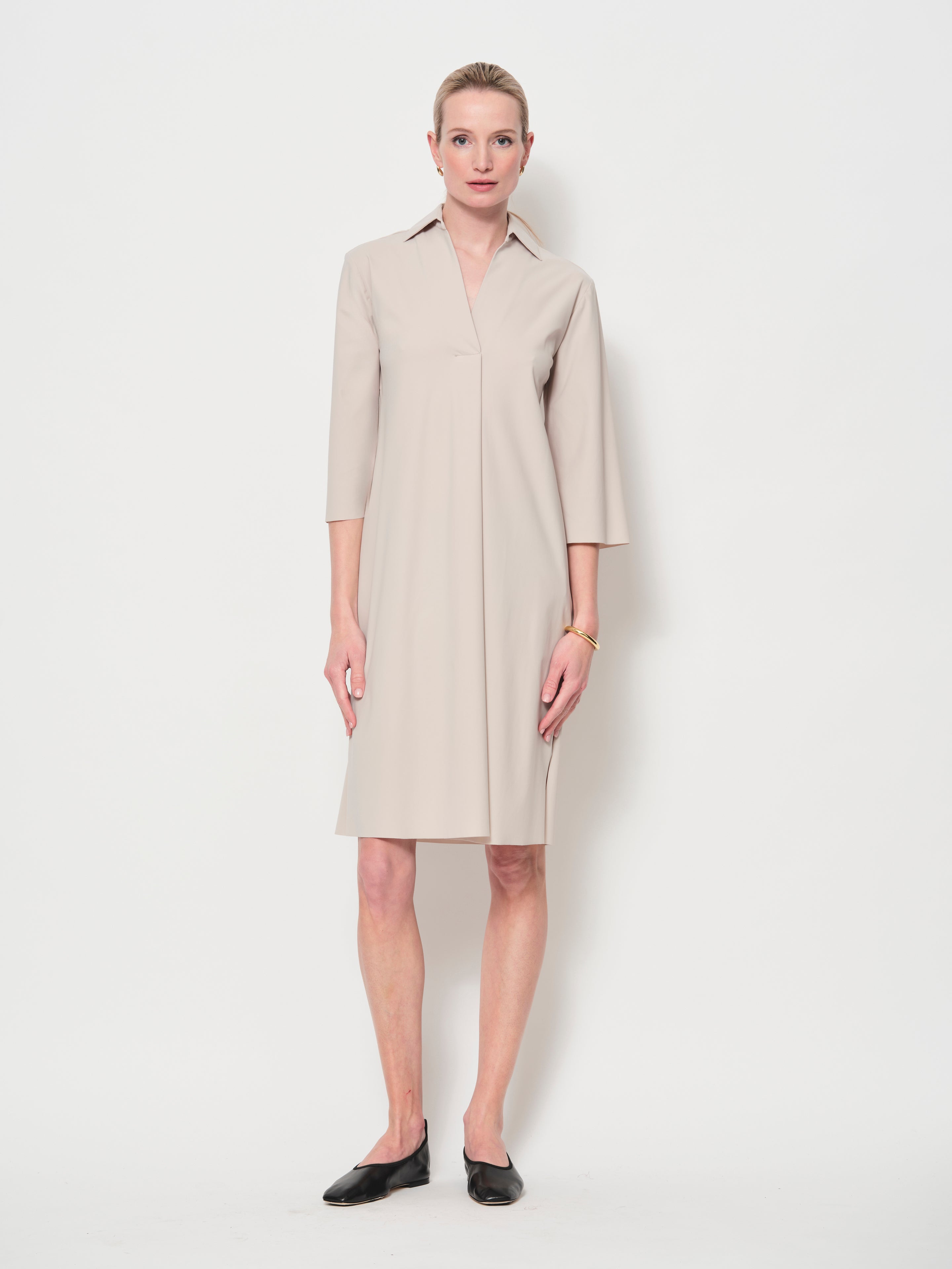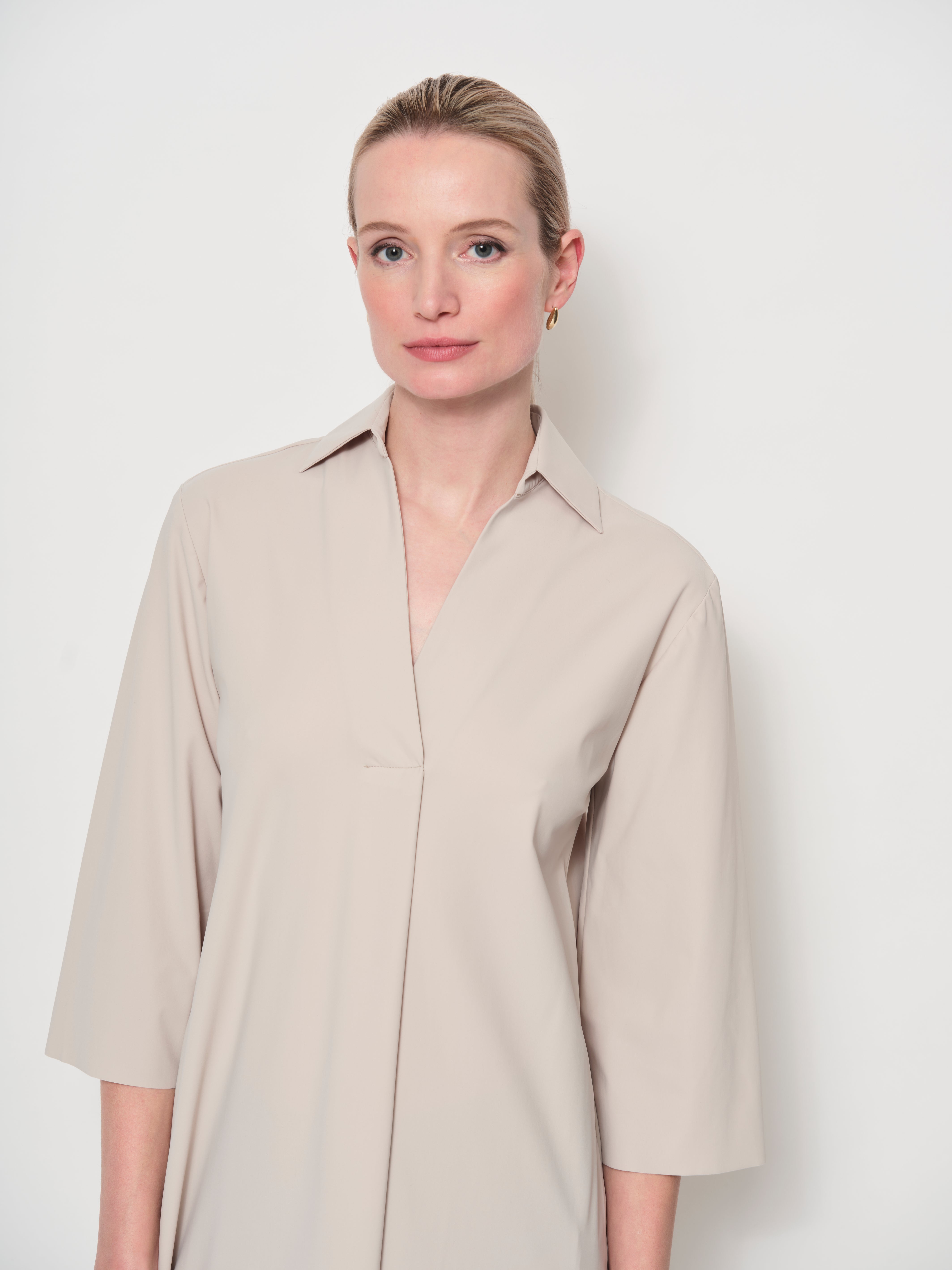 This pop-over dress is crafted in a breathable stretch jersey. It features a clean shirt collar, three-quarter sleeves, and a fluid silhouette enhanced by side splits.