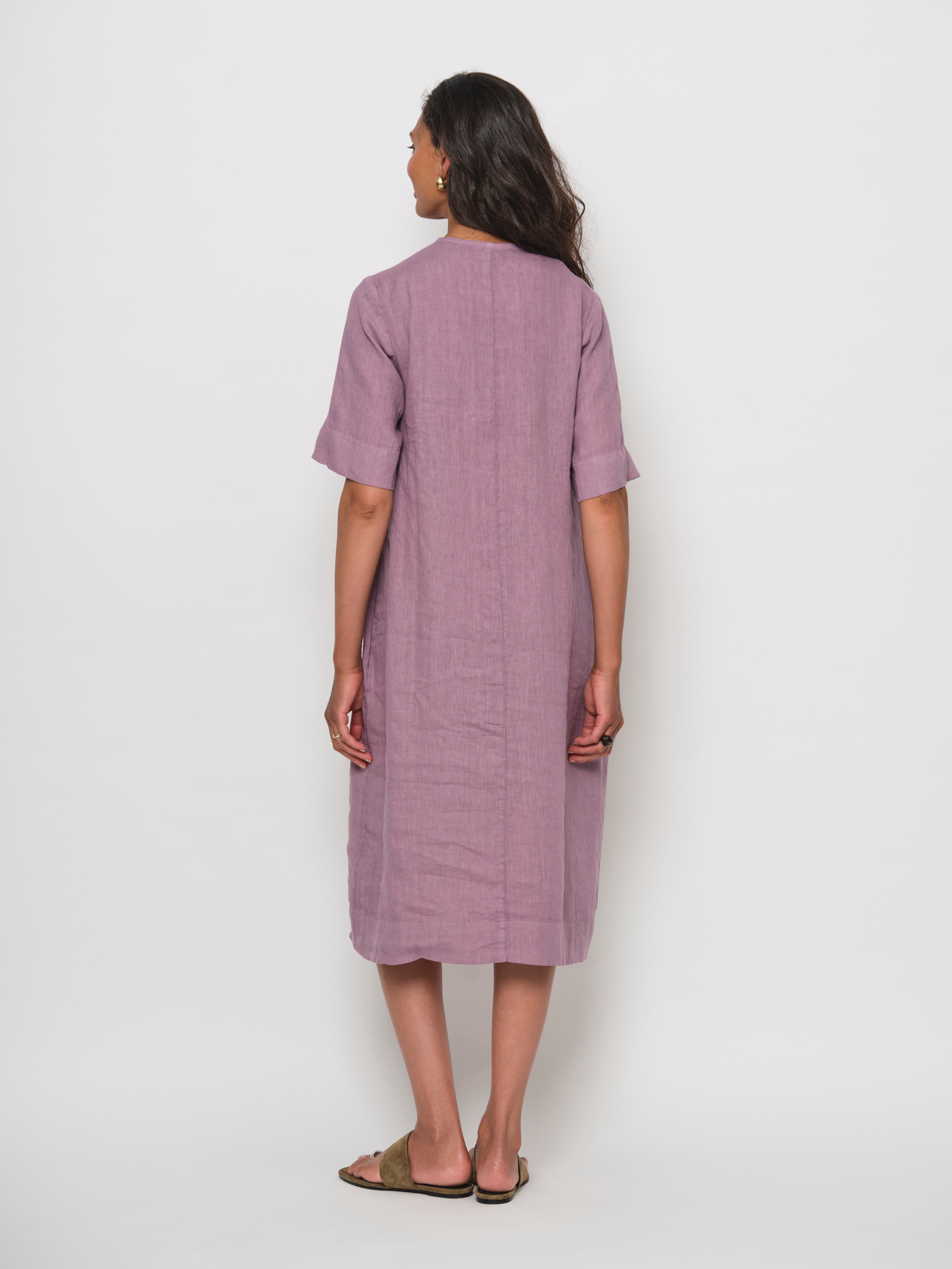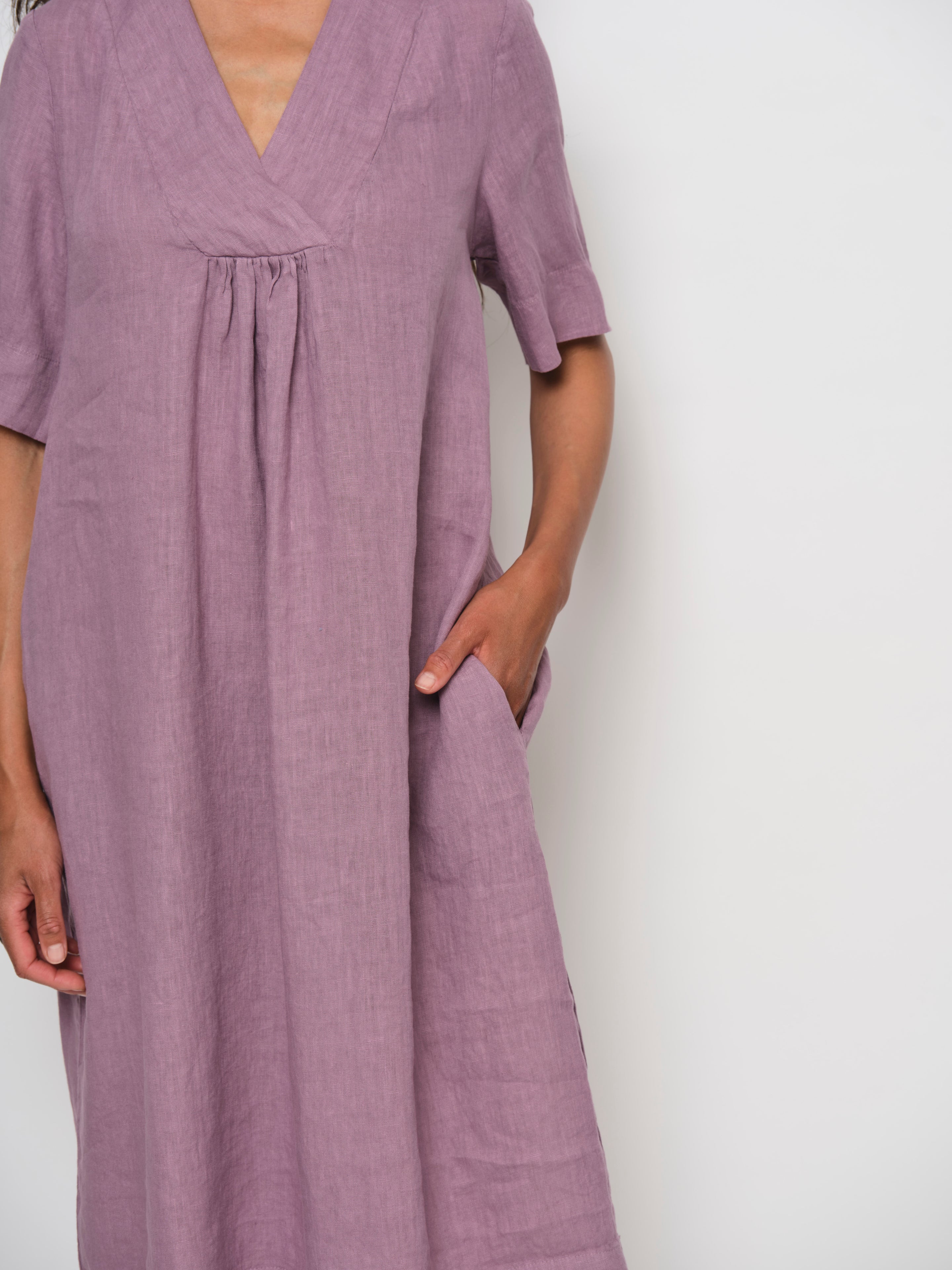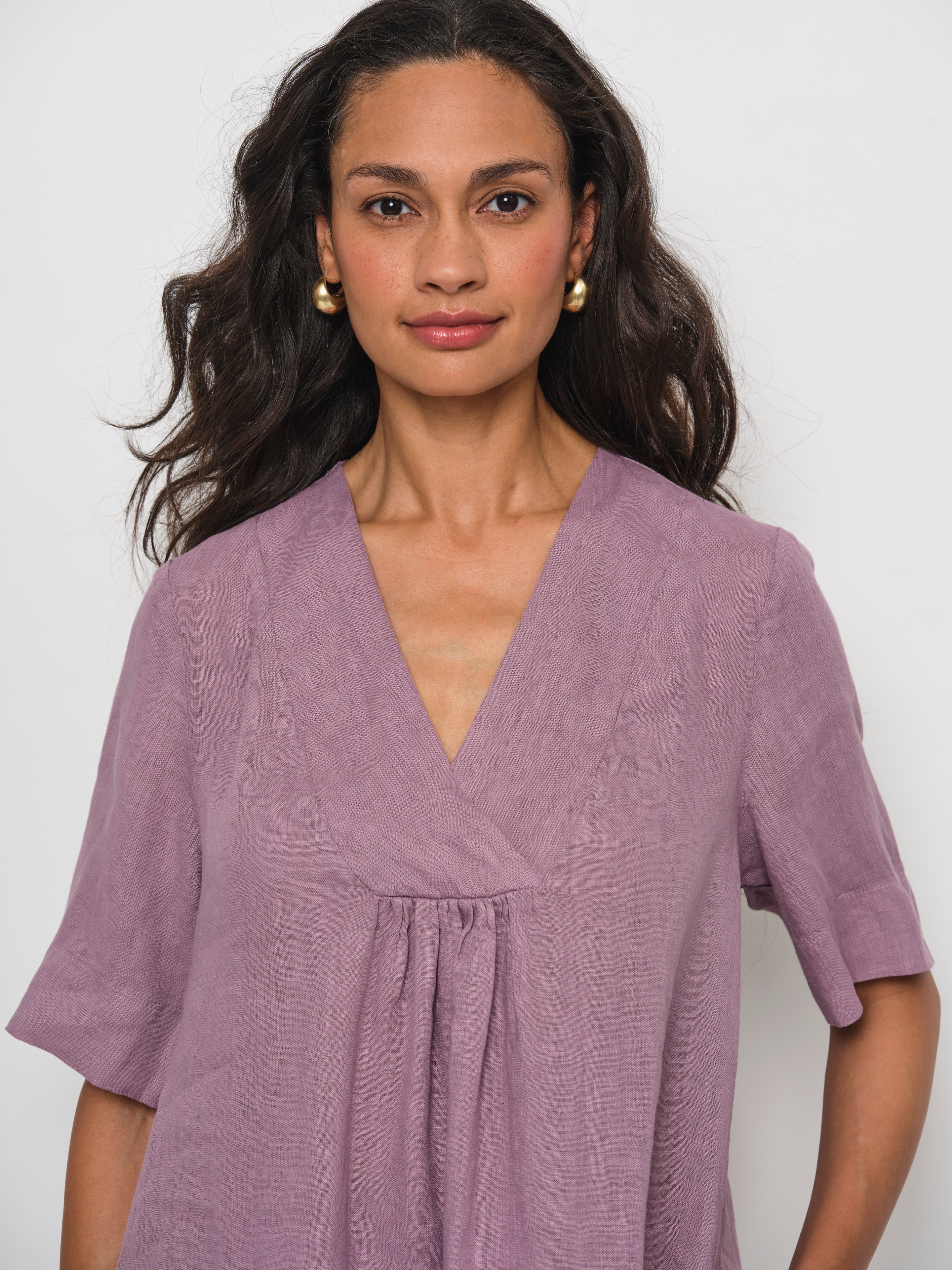 This relaxed midi dress is crafted from soft, breathable linen for easy, all-day wear. Featuring a flattering V-neckline with subtle gathering below, short sleeves, and a relaxed silhouette.