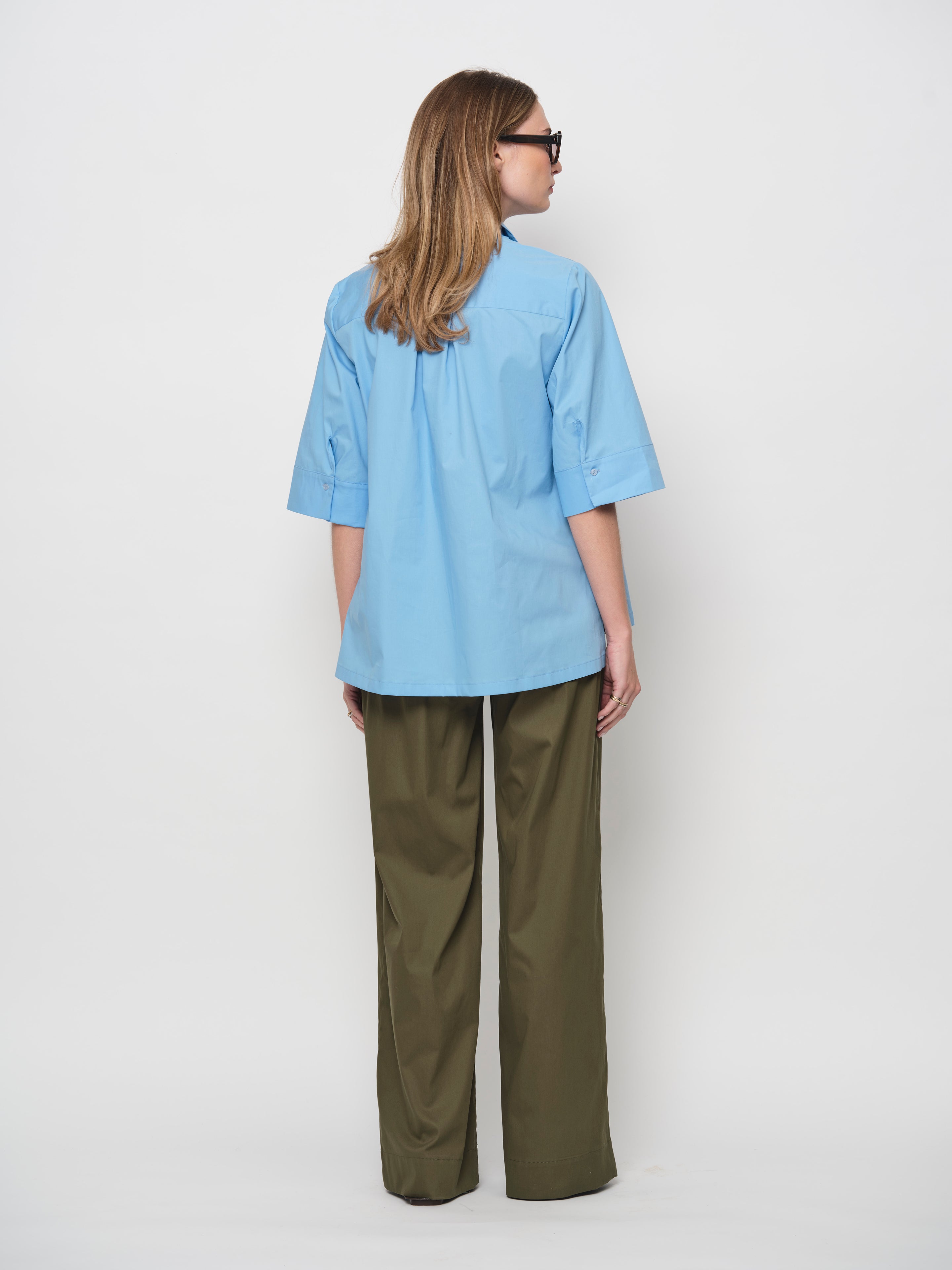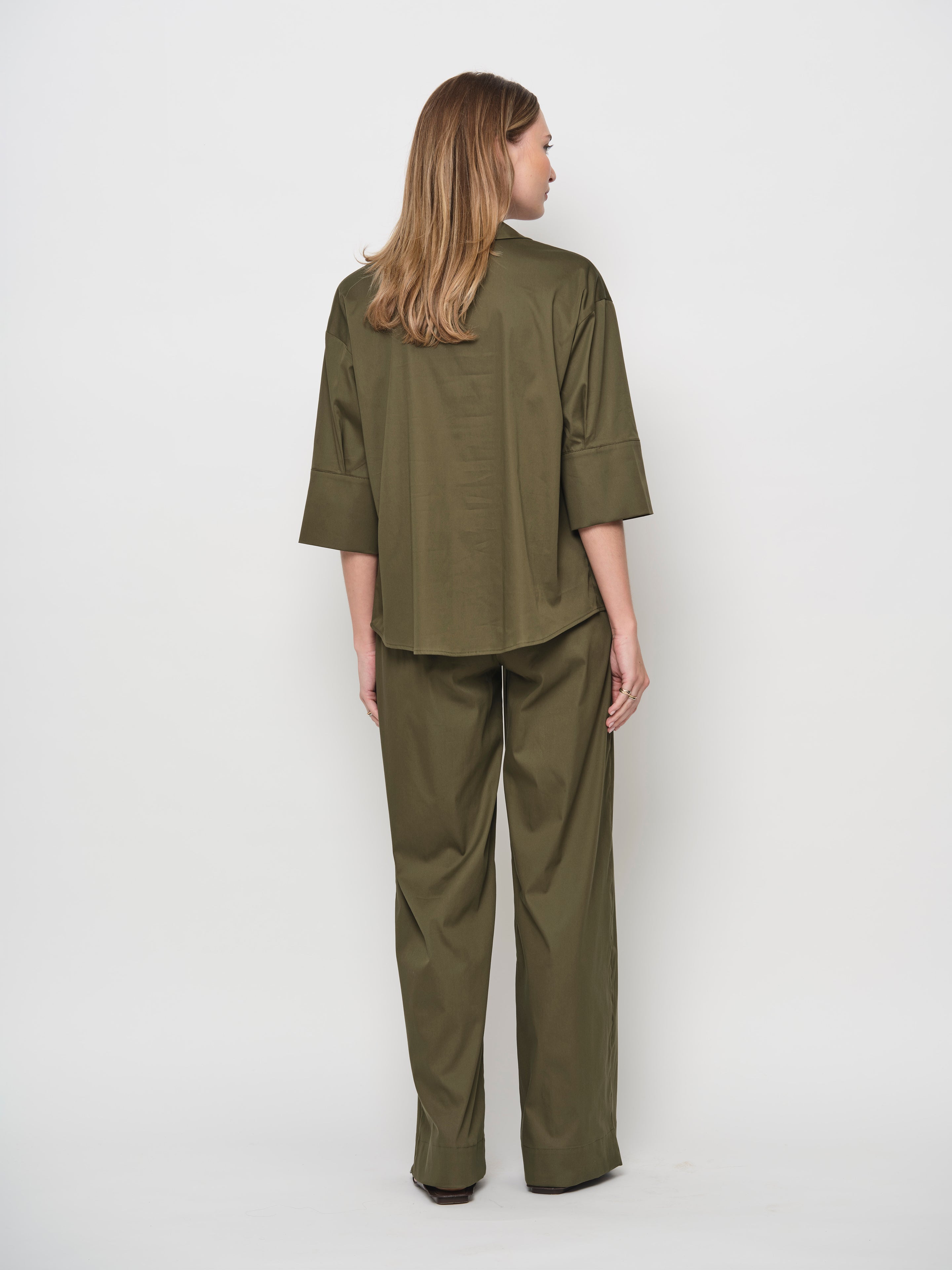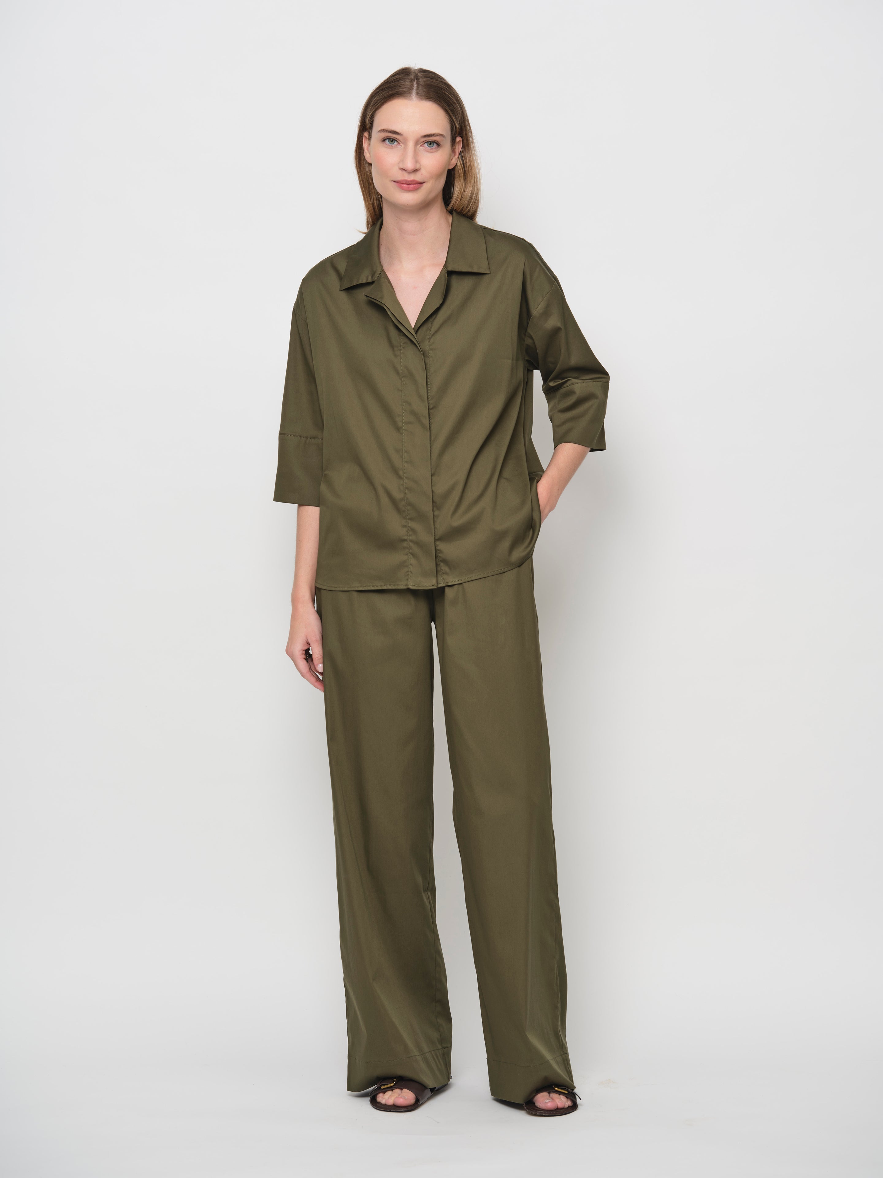 This the perfect casual trouser - super comfortable, elasticated waist made from a stretch cotton with a slight sheen.   Pockets in side seam.  Wear with anything! Falls large, choose a smaller size for a slimmer fit.