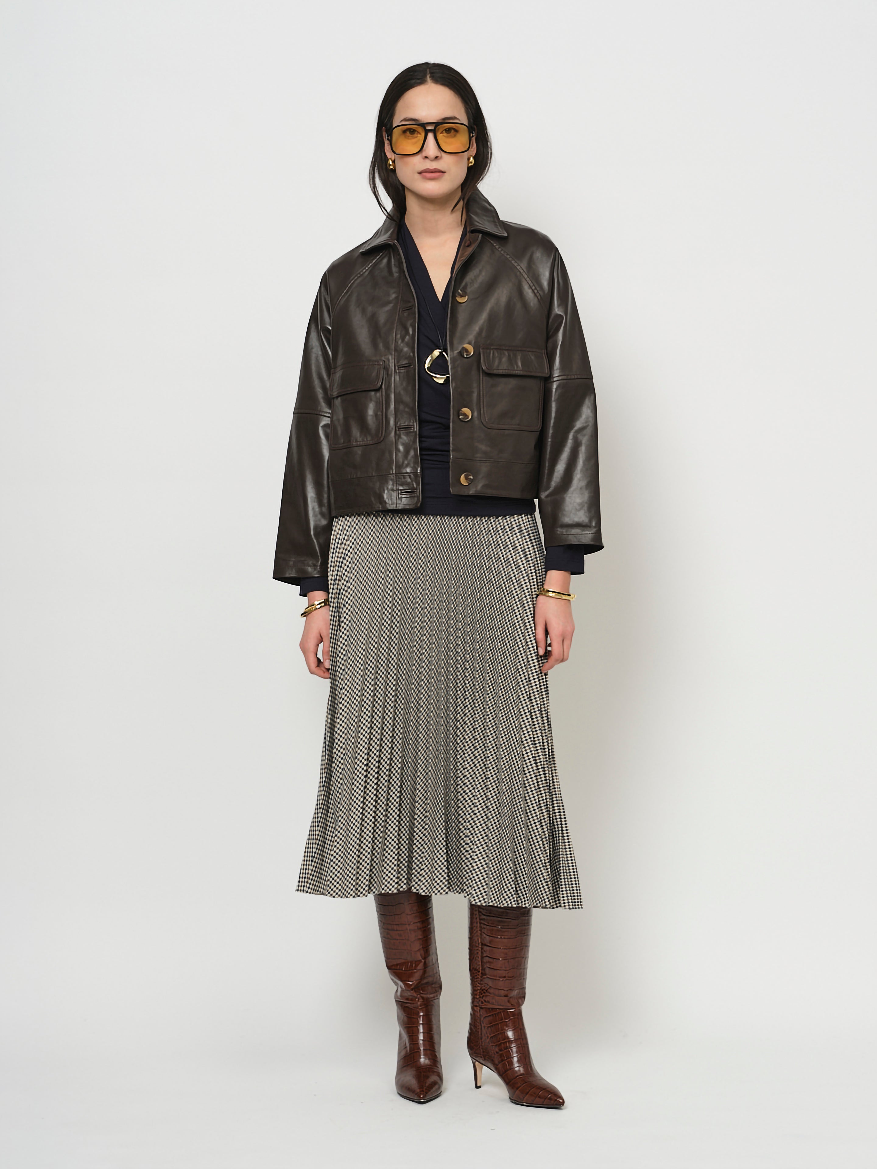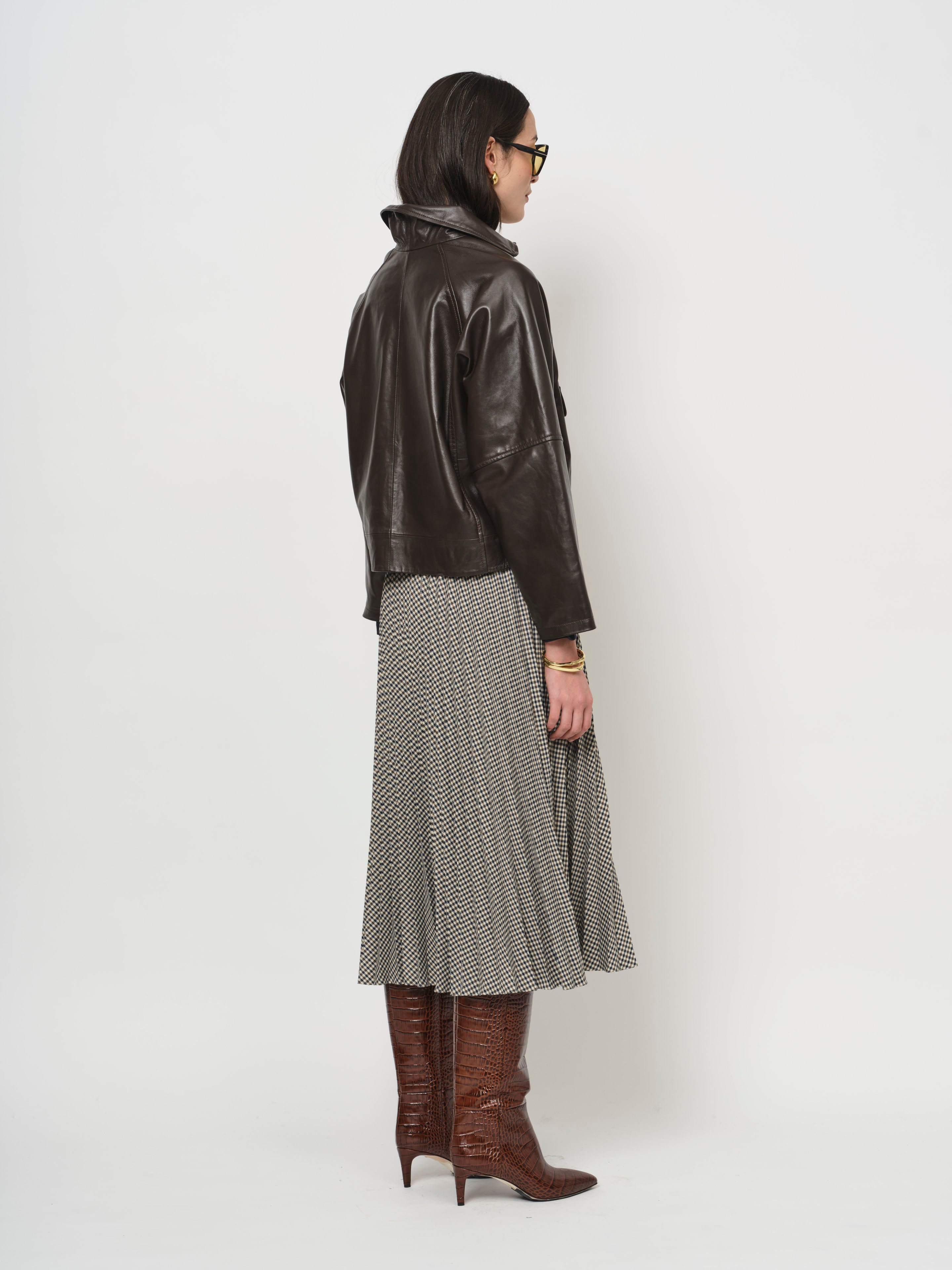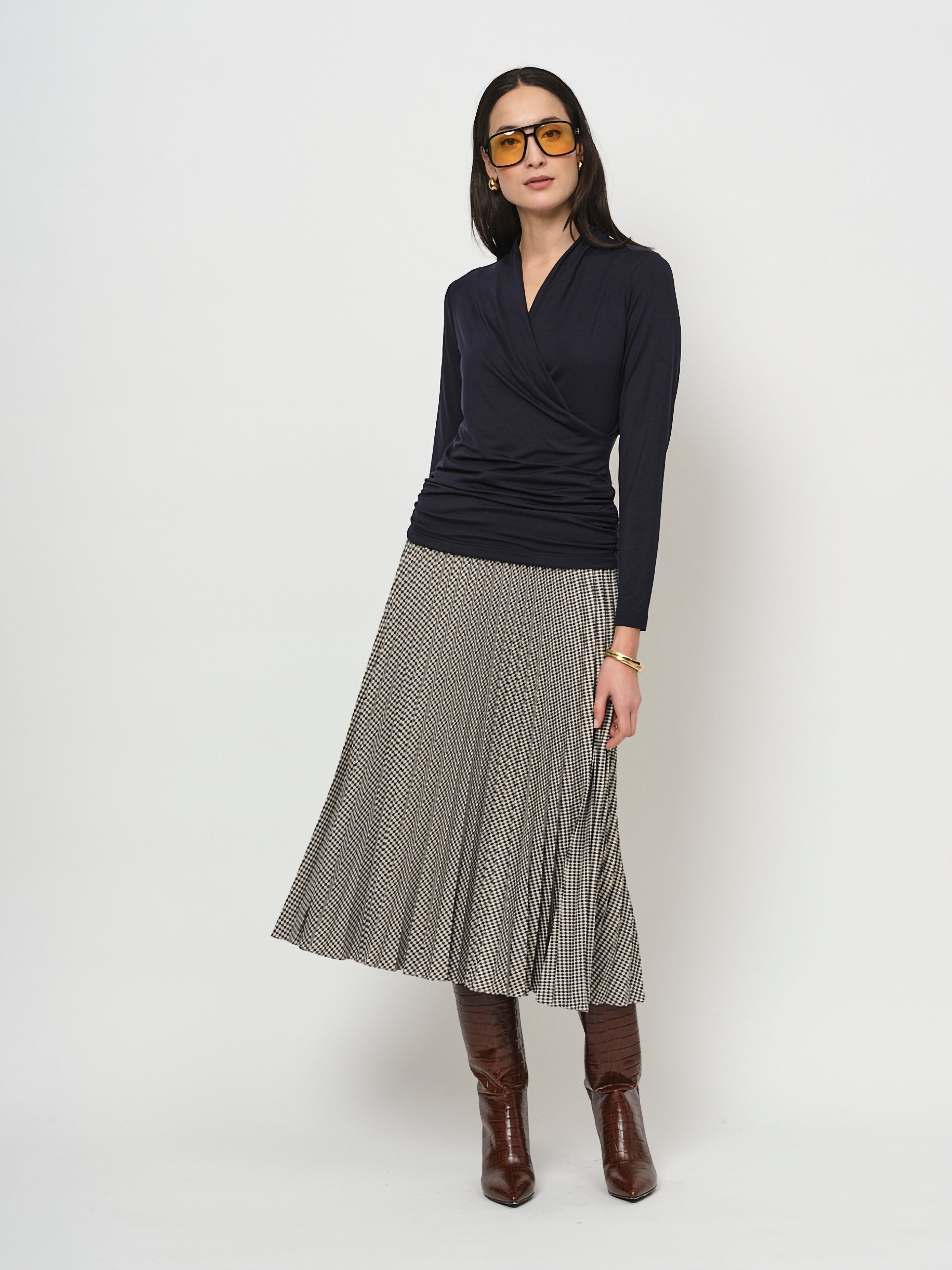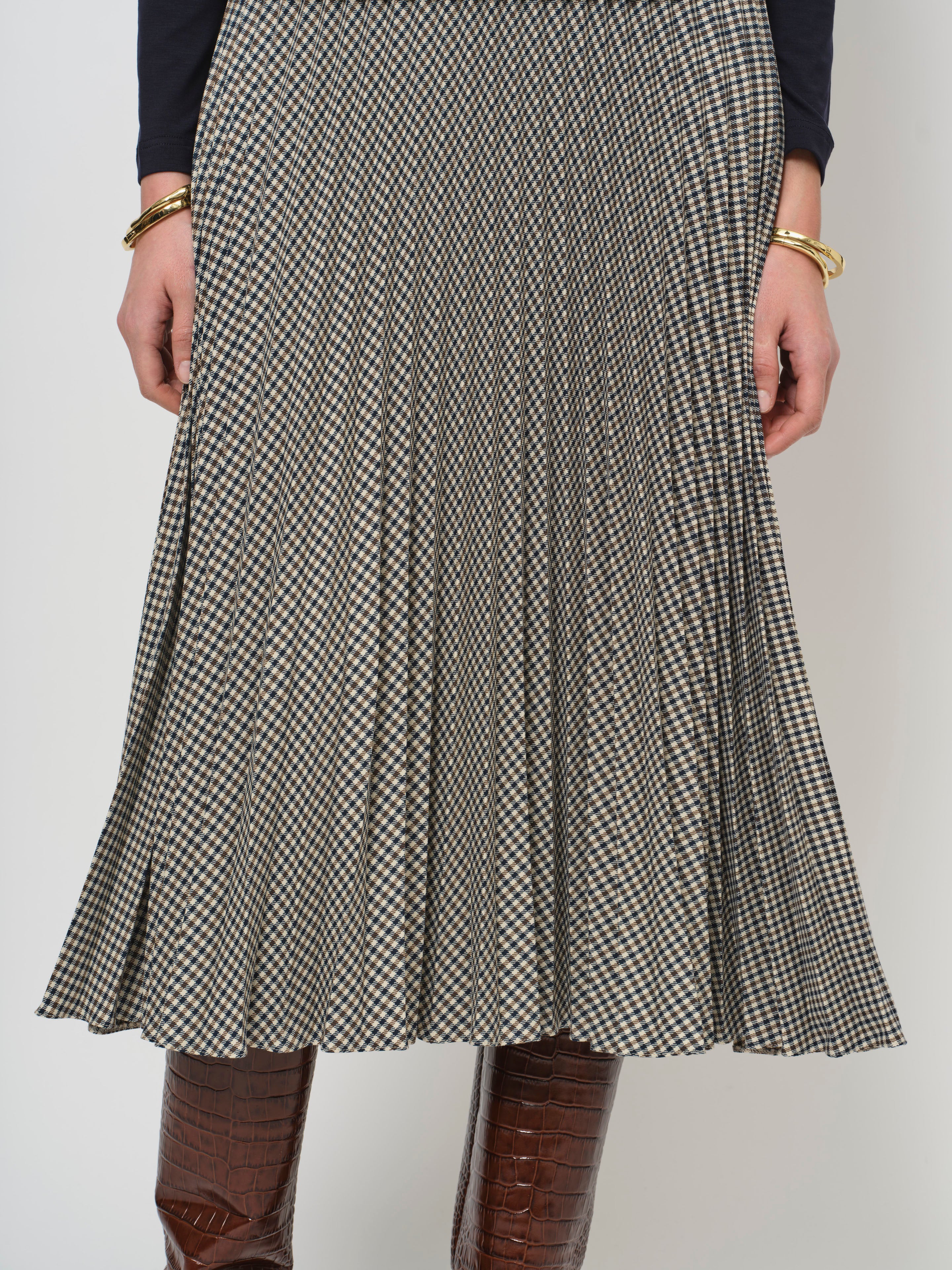 Introducing our pleated skirt in small check pattern. The skirt falls mid calf and pleats add volume to the skirt. Suits most body shapes. Pair it with a sweater for a casual outfit.
