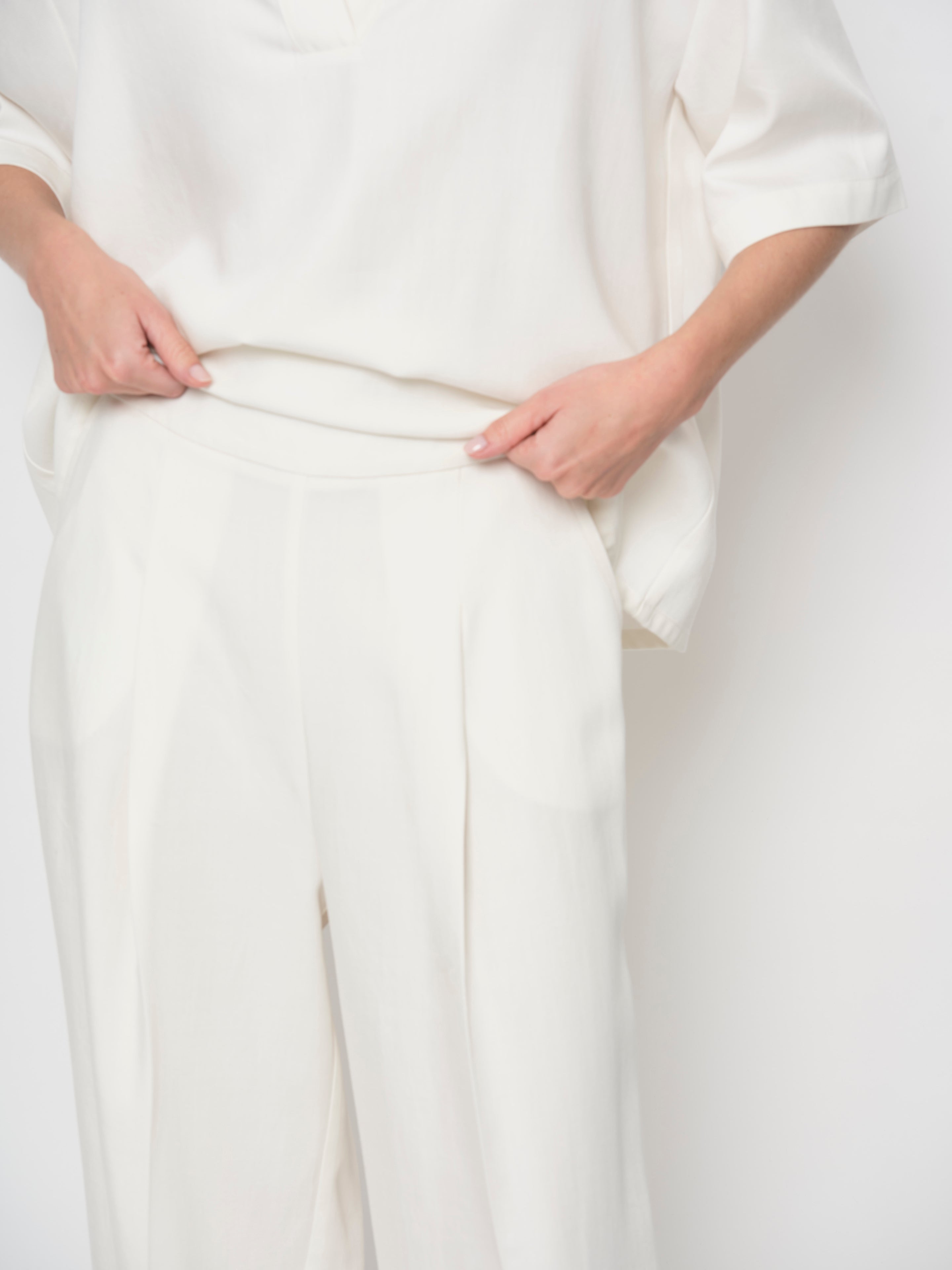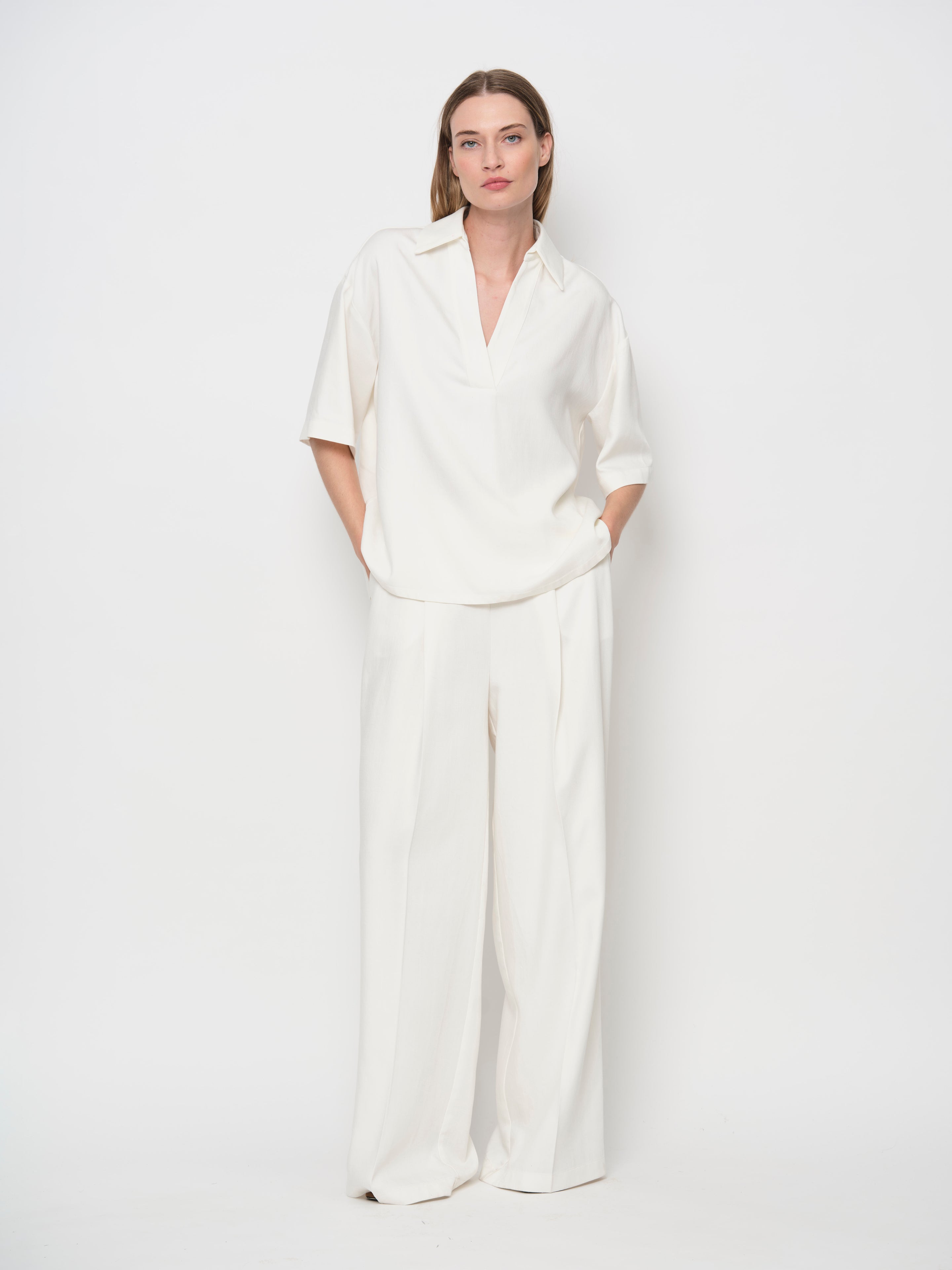 Crafted from soft, breathable, flowy Tencel denim, these high-waisted trousers feature a relaxed fit with a wide-leg silhouette and flowing pleats. Designed with a side zip and slanted side pockets. Pair with matching tops for a coordinated, statement-making look.