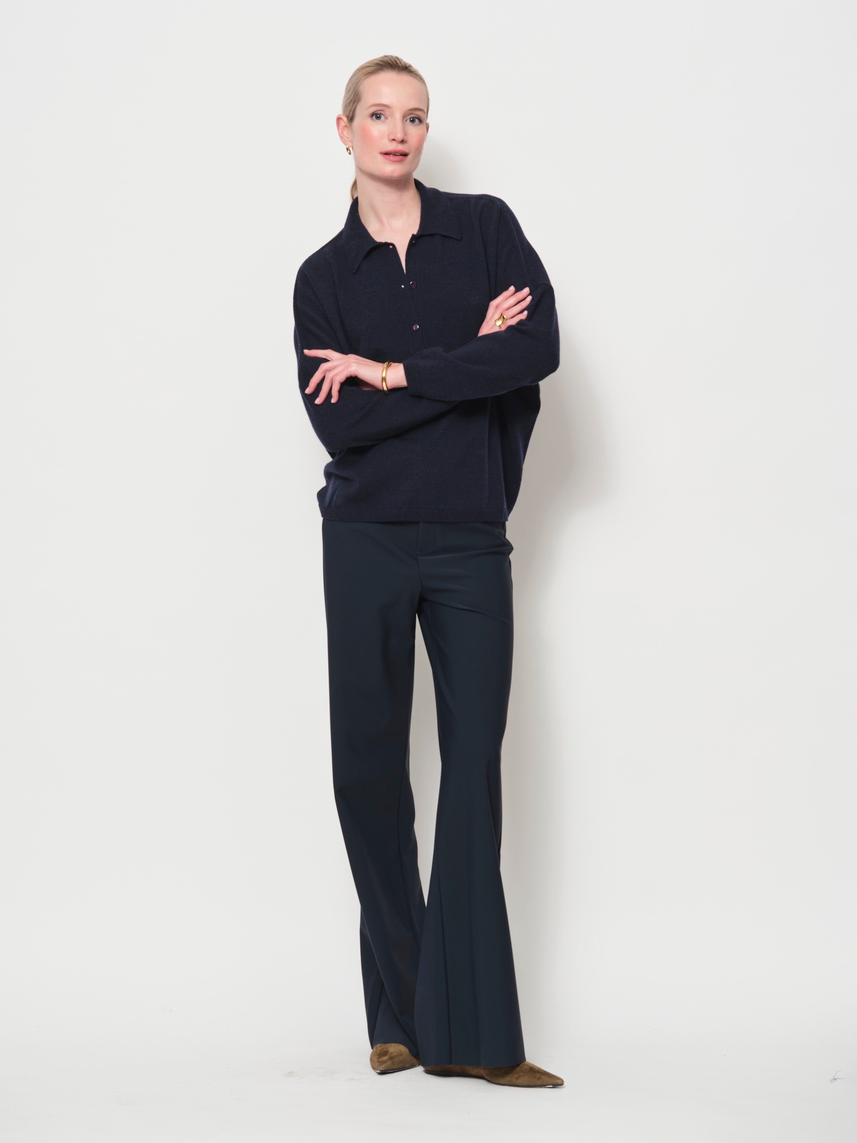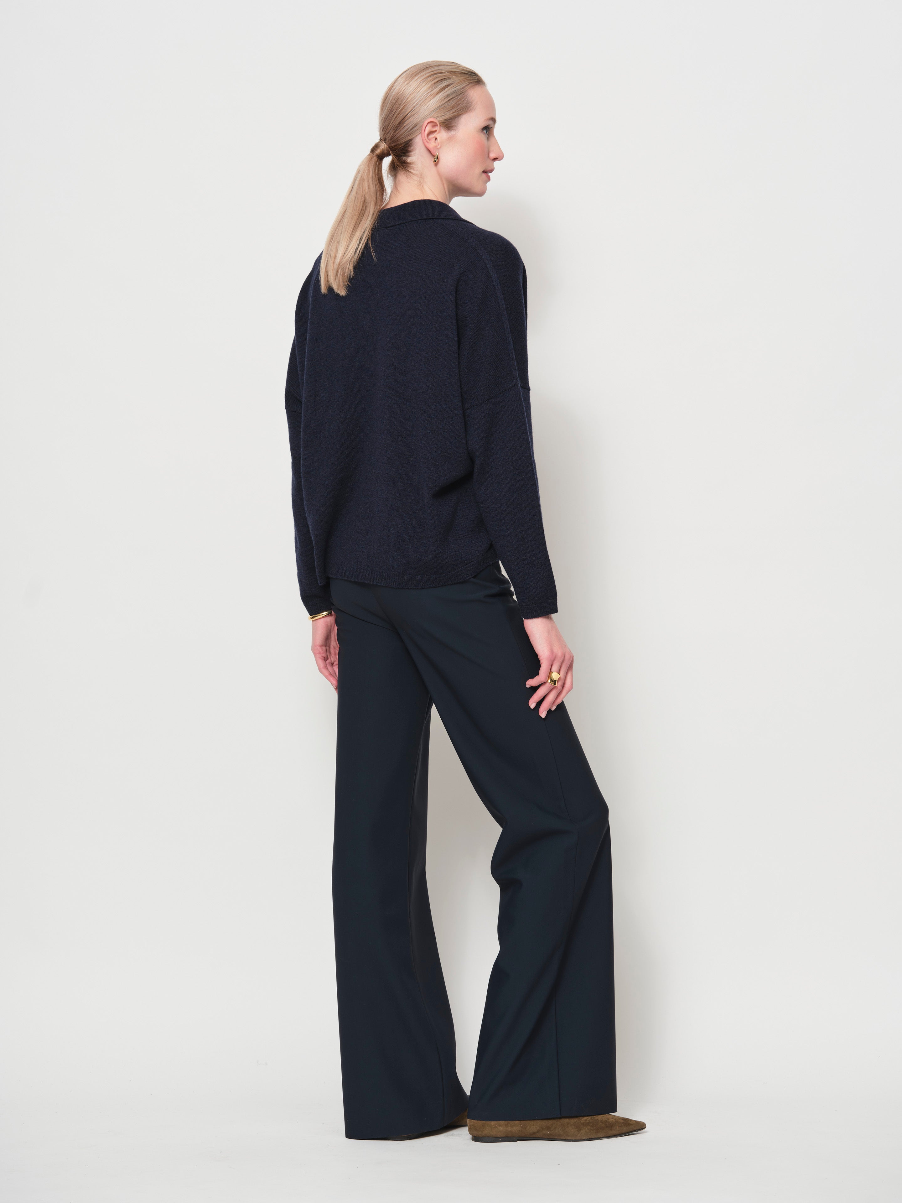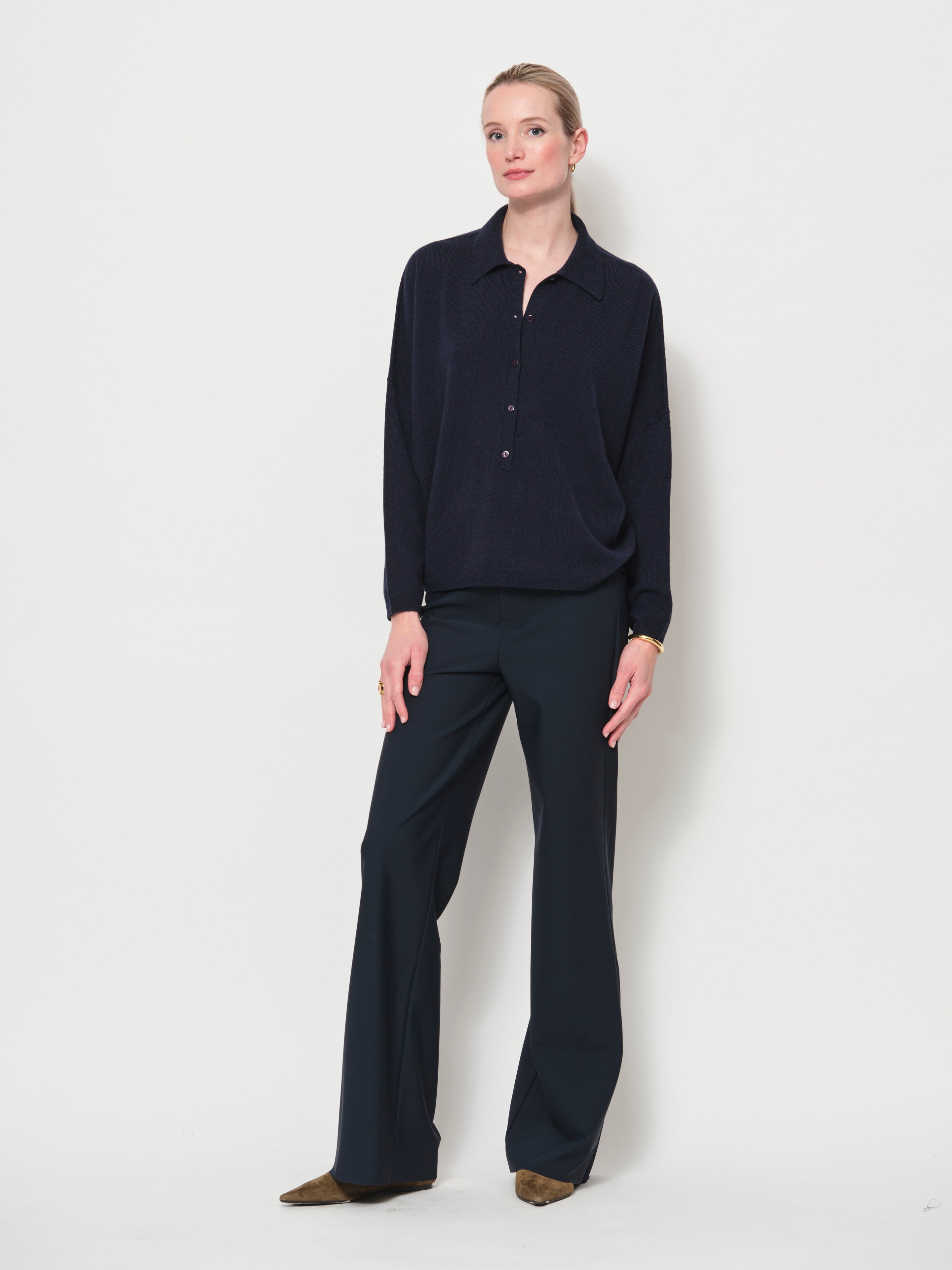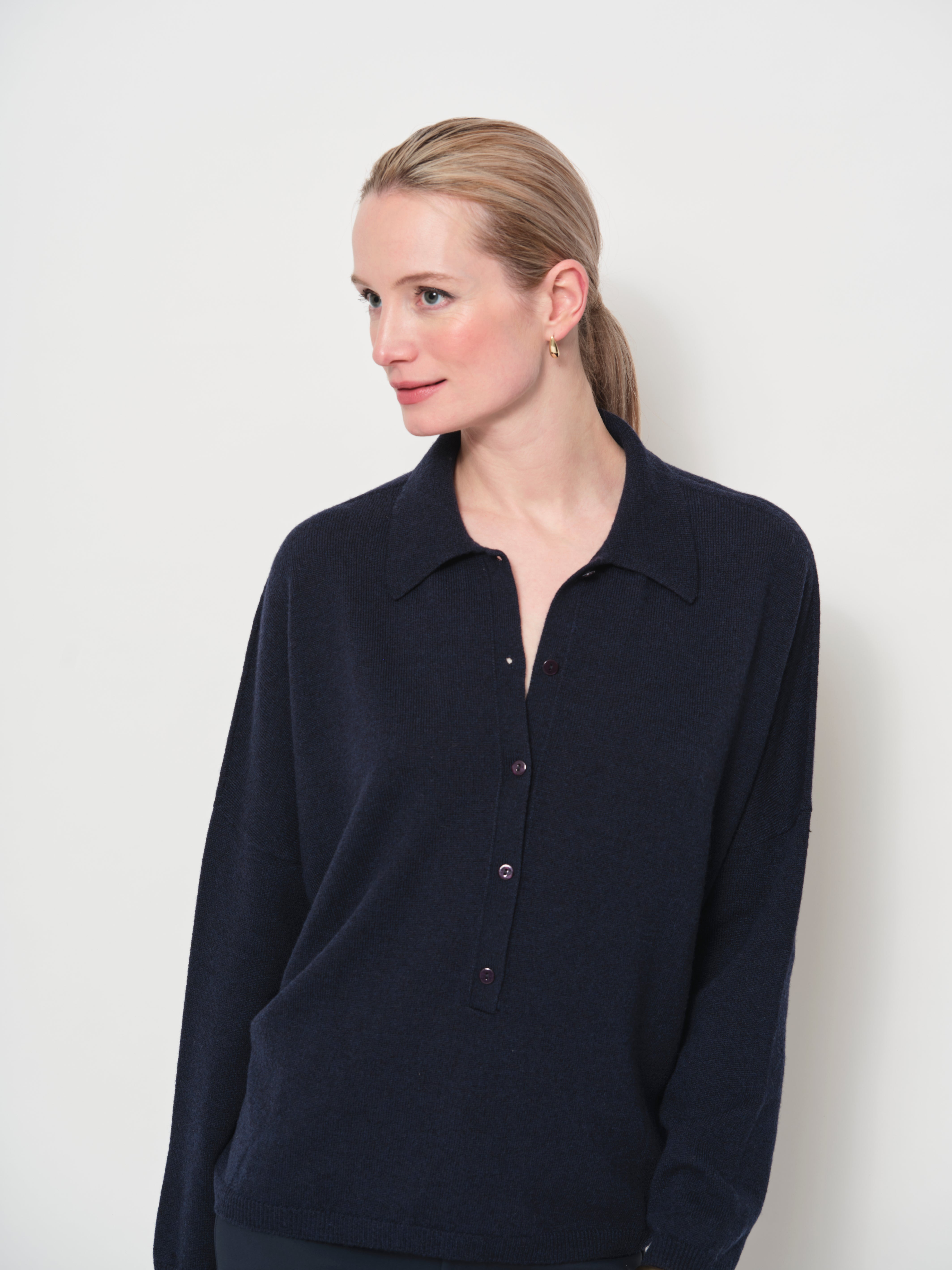 An easy-to-wear sweater with a relaxed silhouette and subtle drape. Crafted from a luxurious Italian yarn, it features a collared neckline with a half-button placket and long sleeves, creating an effortlessly casual look.