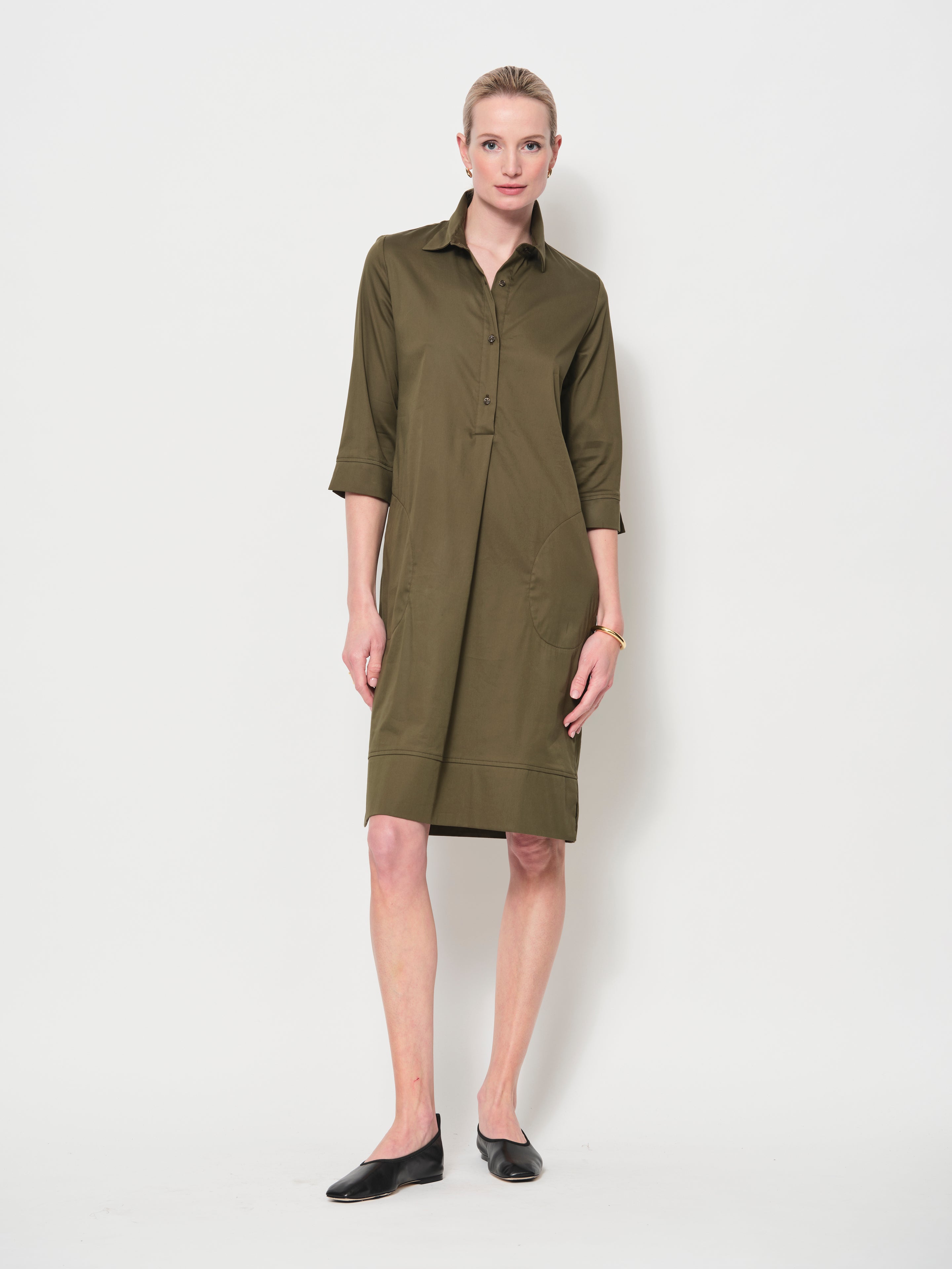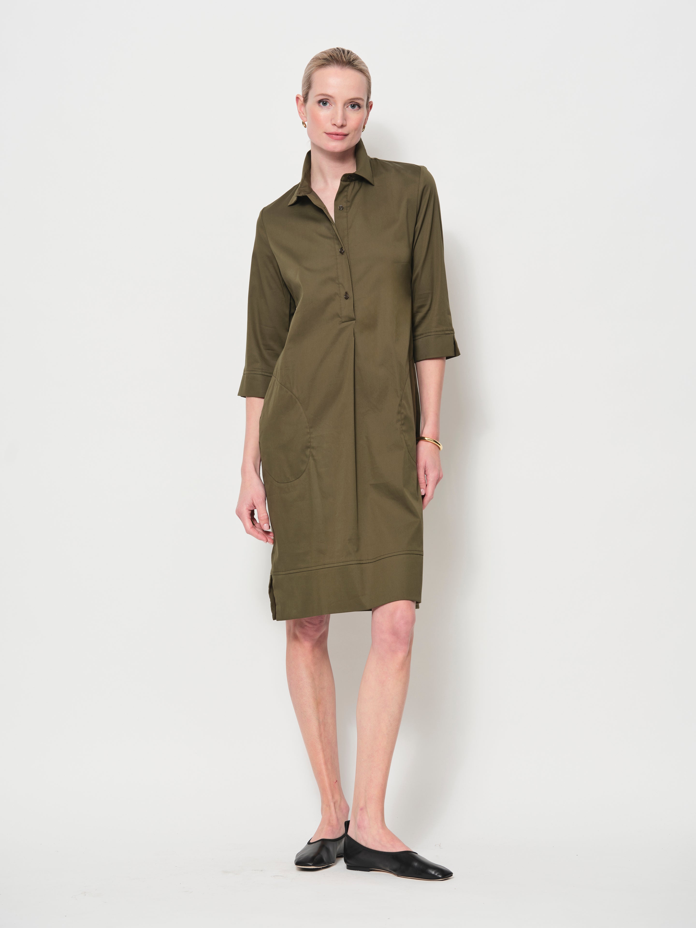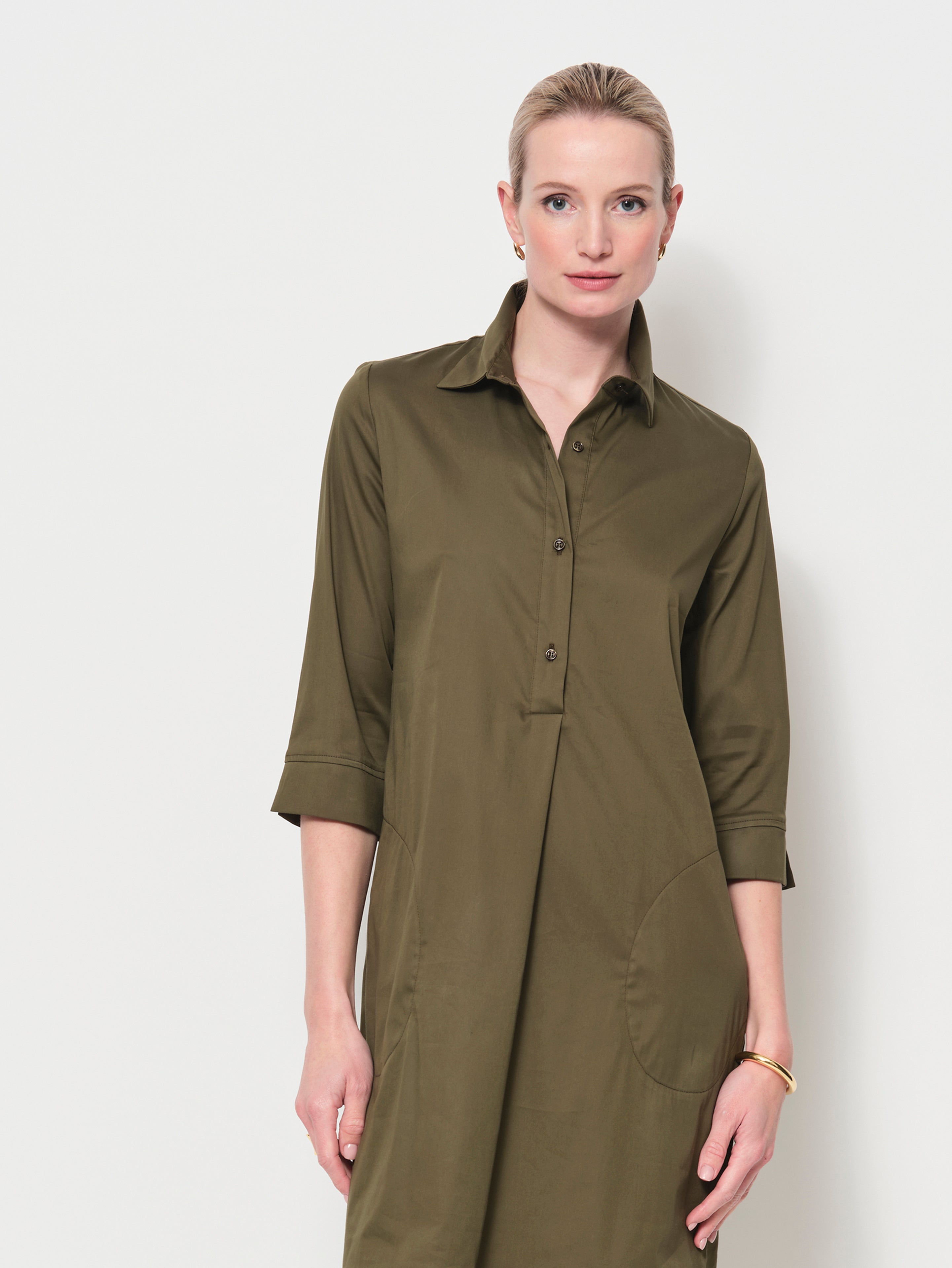 The Iconic LaSalle shirt dress that you will reach for again and again. The fabric is a soft, luxurious cotton with a satin finish. The fabric has a lot of stretch for extra comfort. This shape fits almost every body shape, try it!