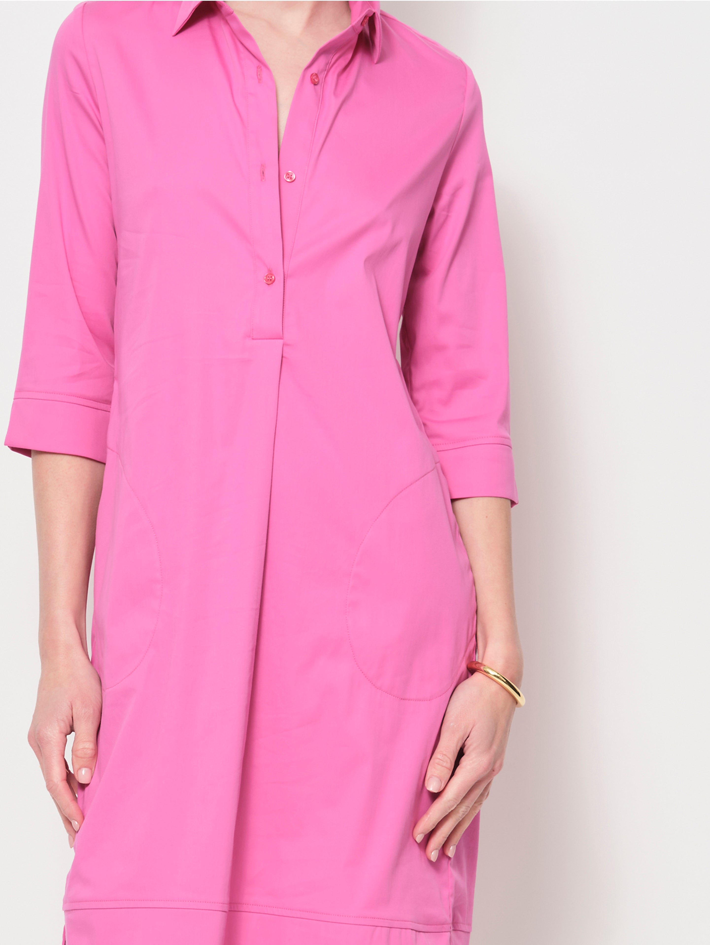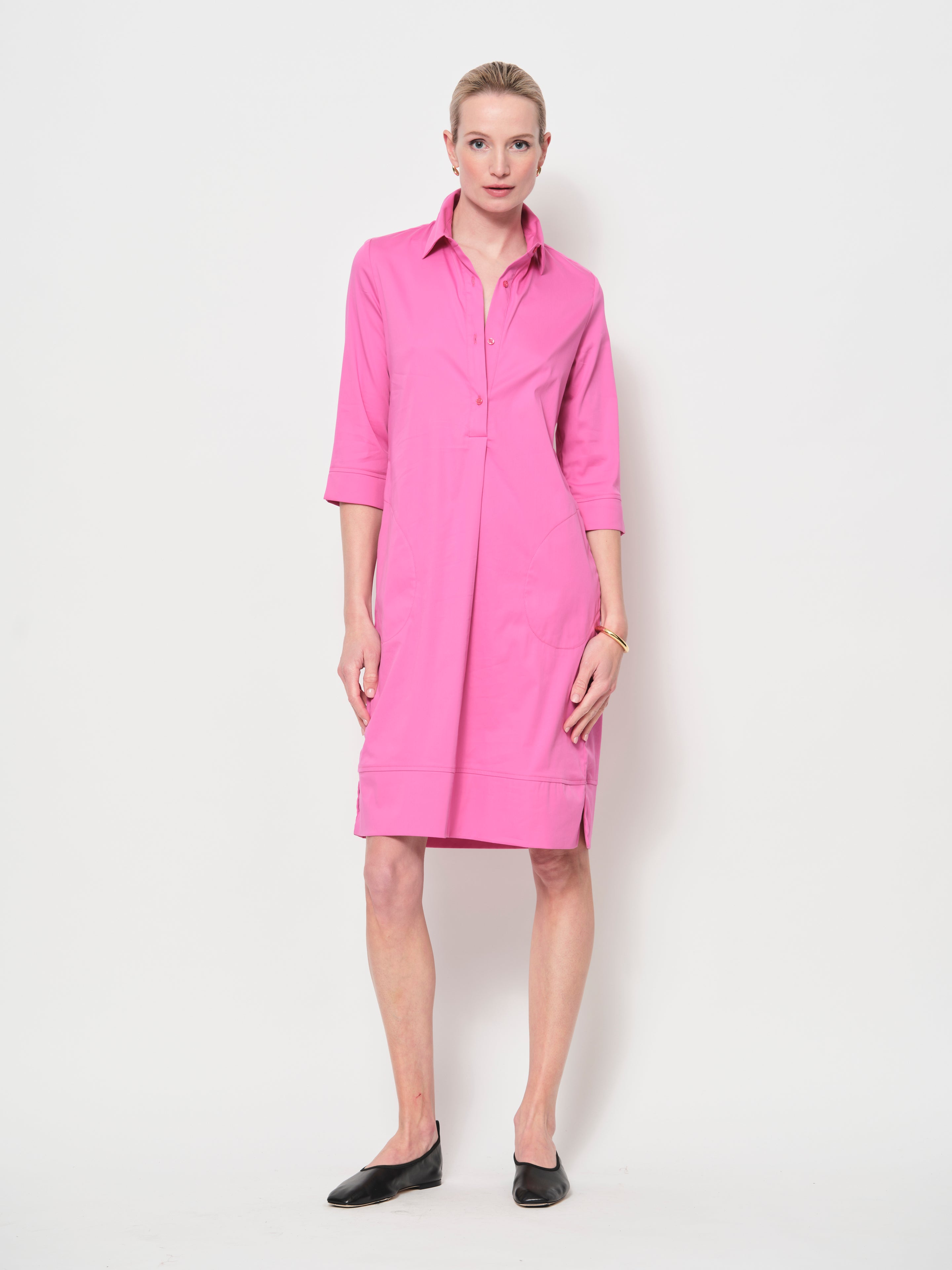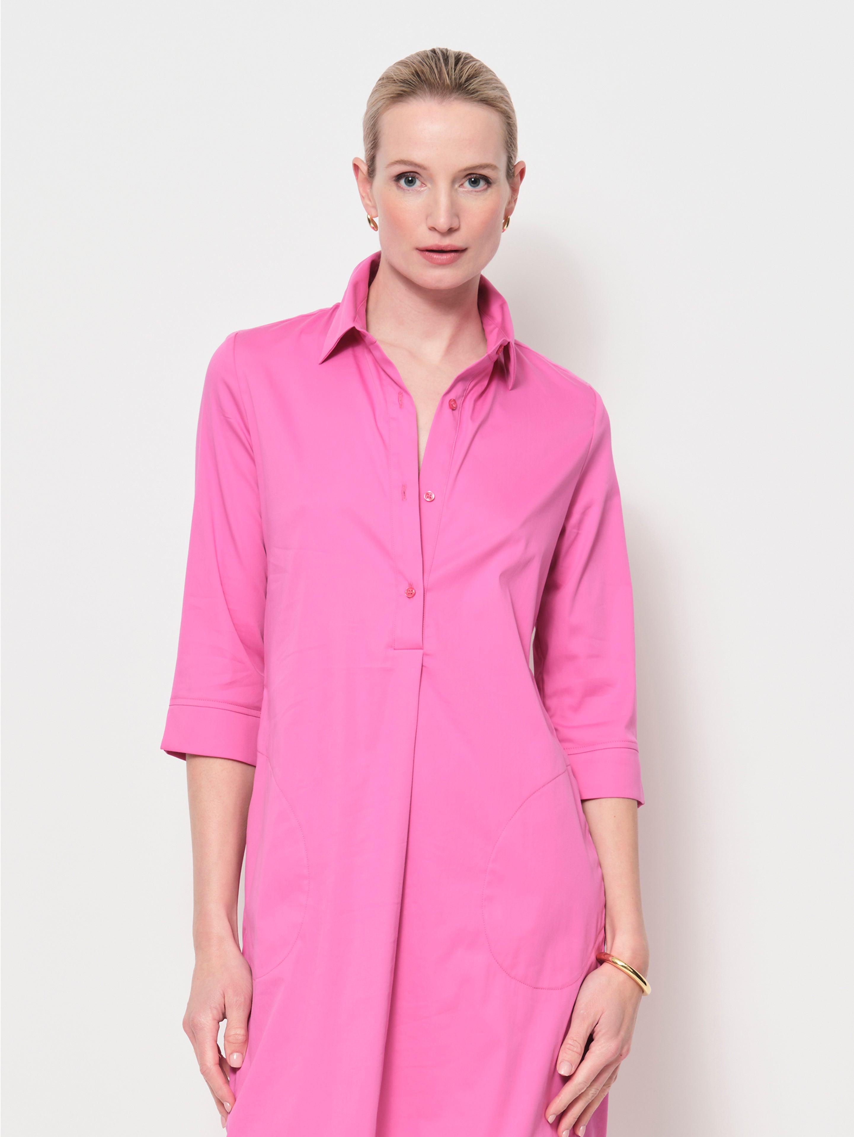 The Iconic LaSalle shirt dress that you will reach for again and again. The fabric is a soft, luxurious cotton with a satin finish. The fabric has a lot of stretch for extra comfort. This shape fits almost every body shape, try it! Wear with sneakers or sandal for most any occasion.