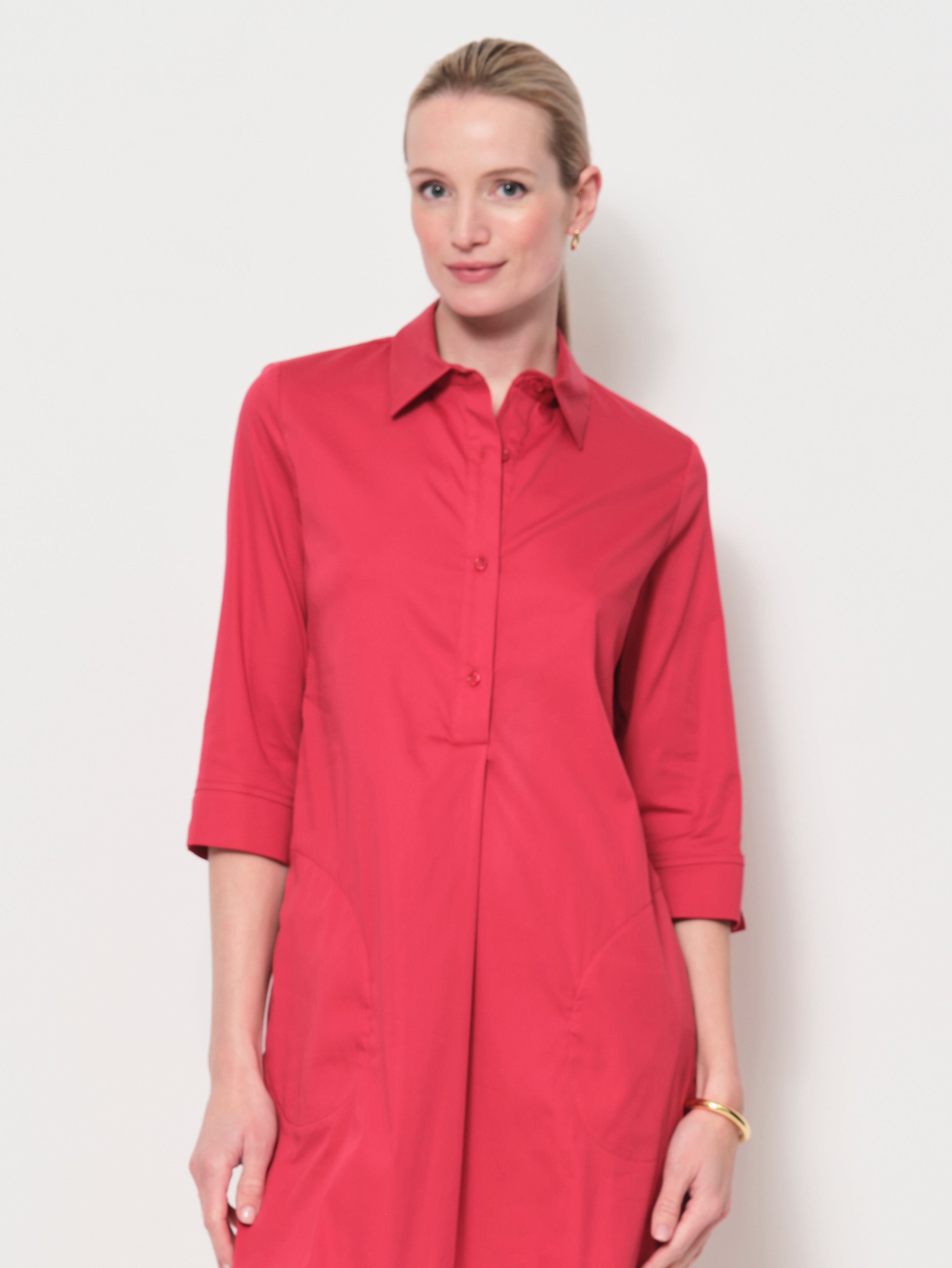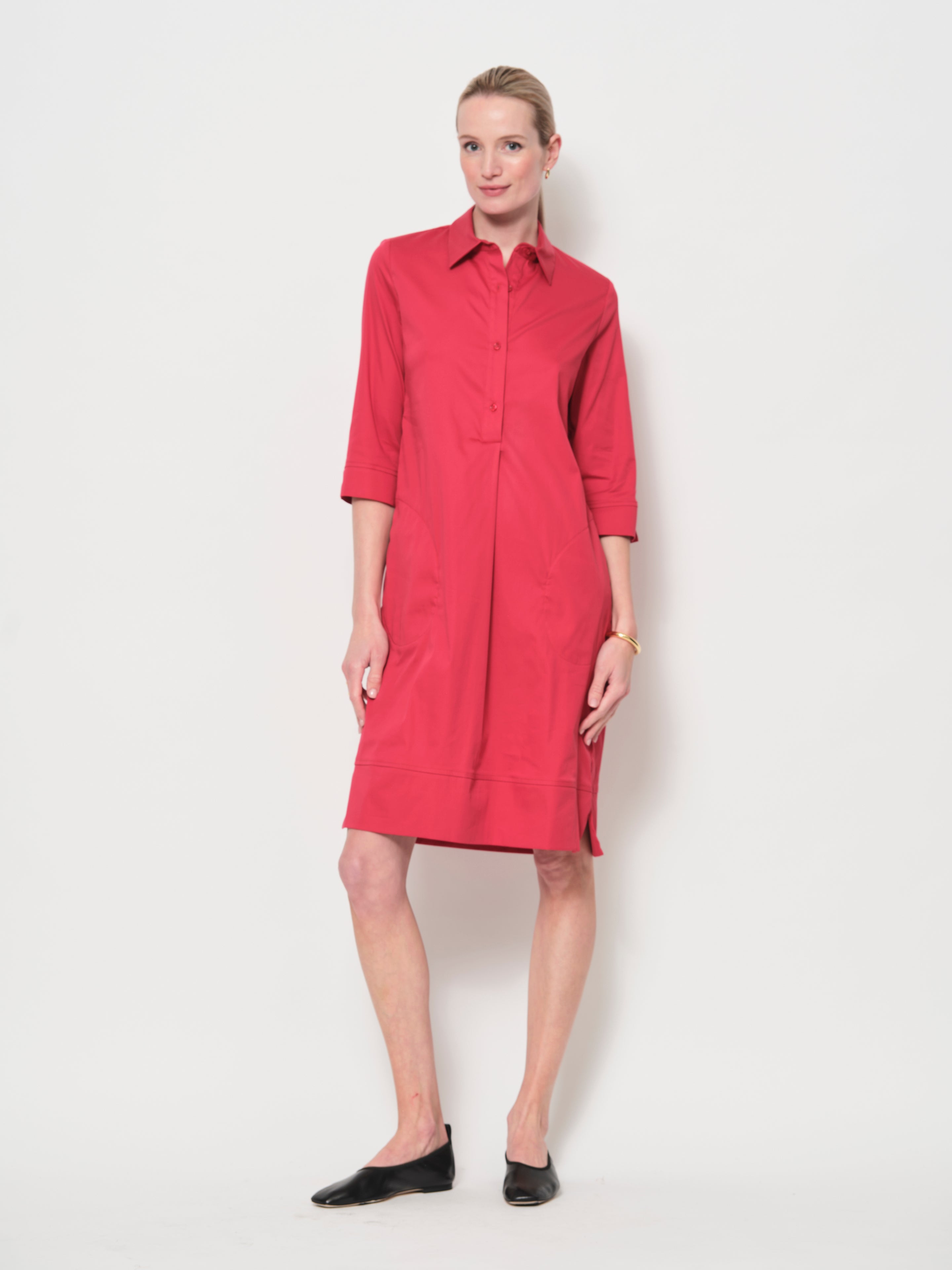 The Iconic LaSalle shirt dress that you will reach for again and again. The fabric is a soft, luxurious cotton with a satin finish.  The fabric has a lot of stretch for extra comfort.  This shape fits almost every body shape, try it!