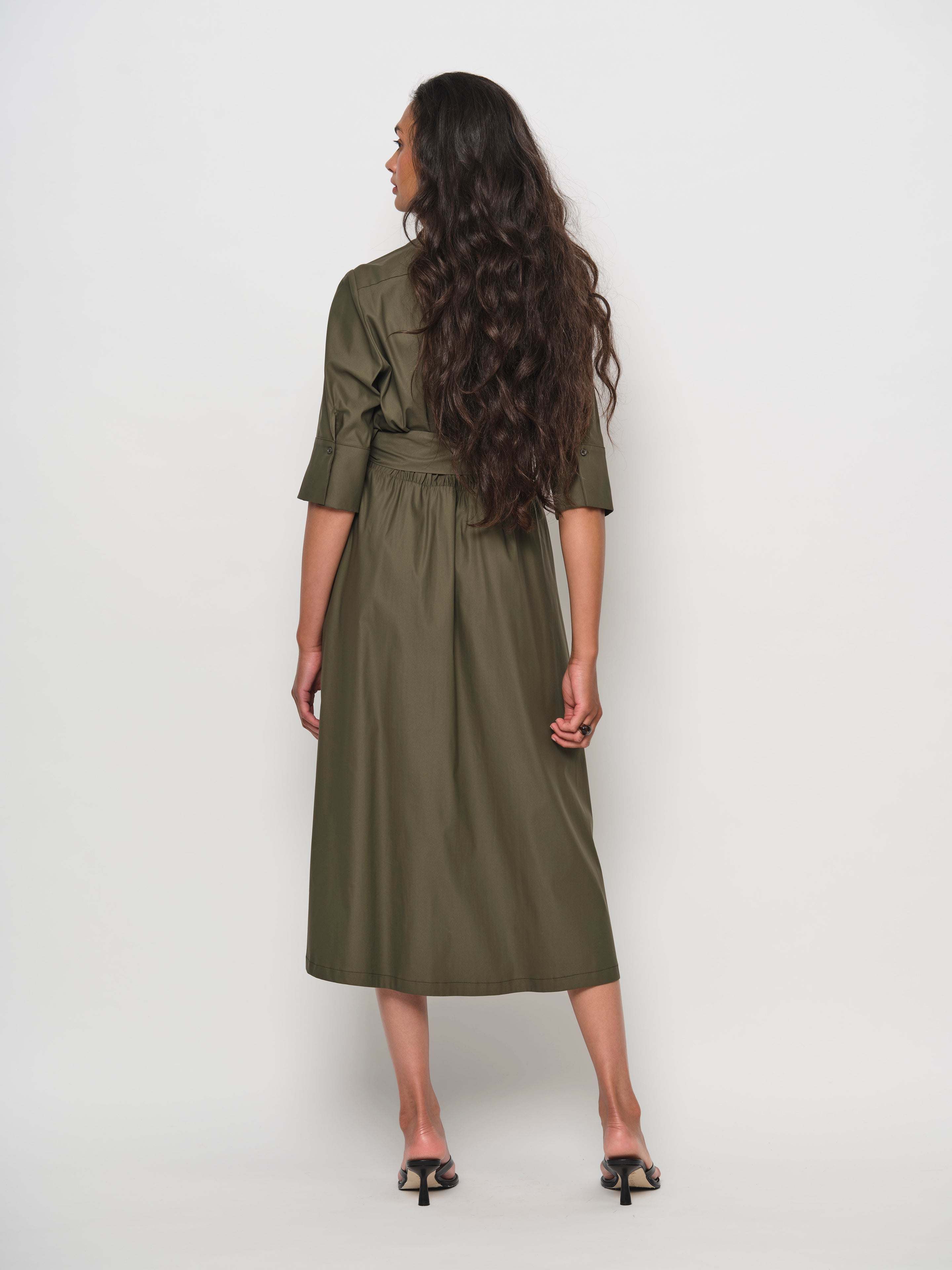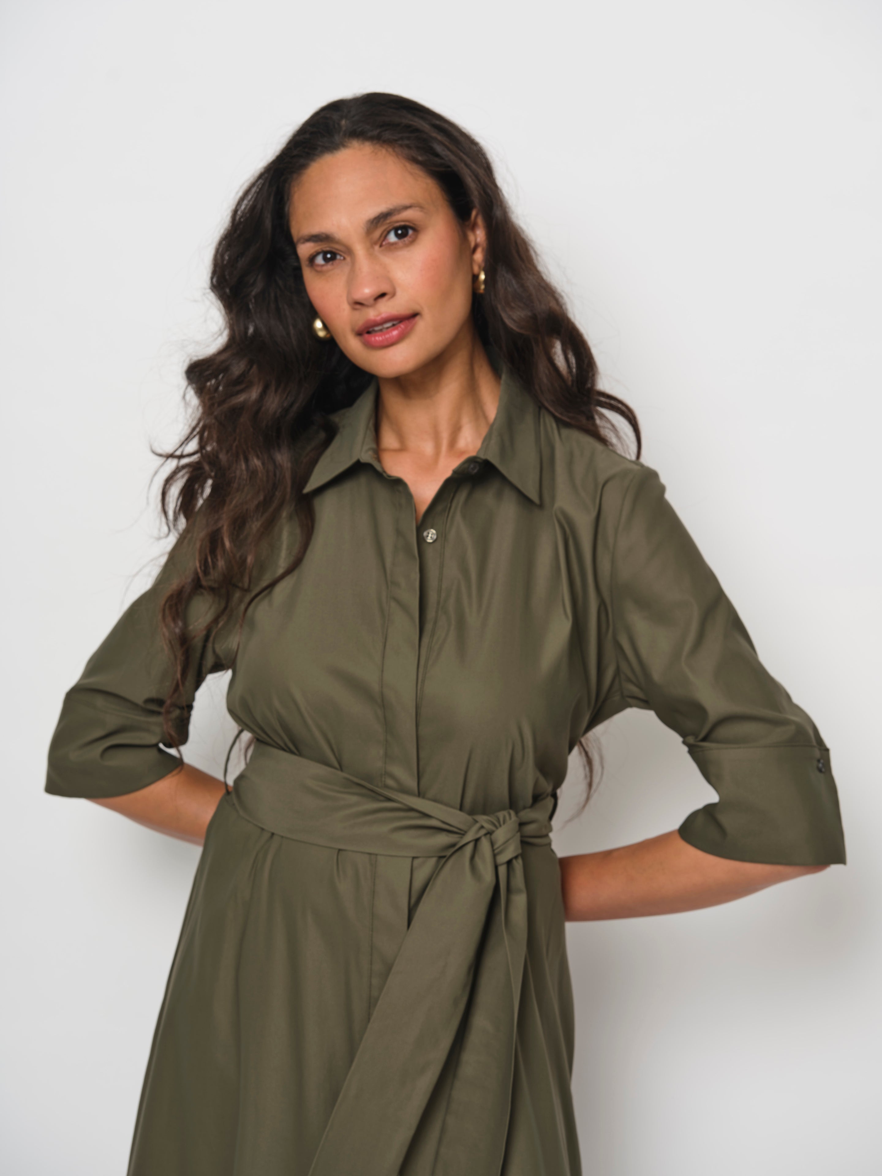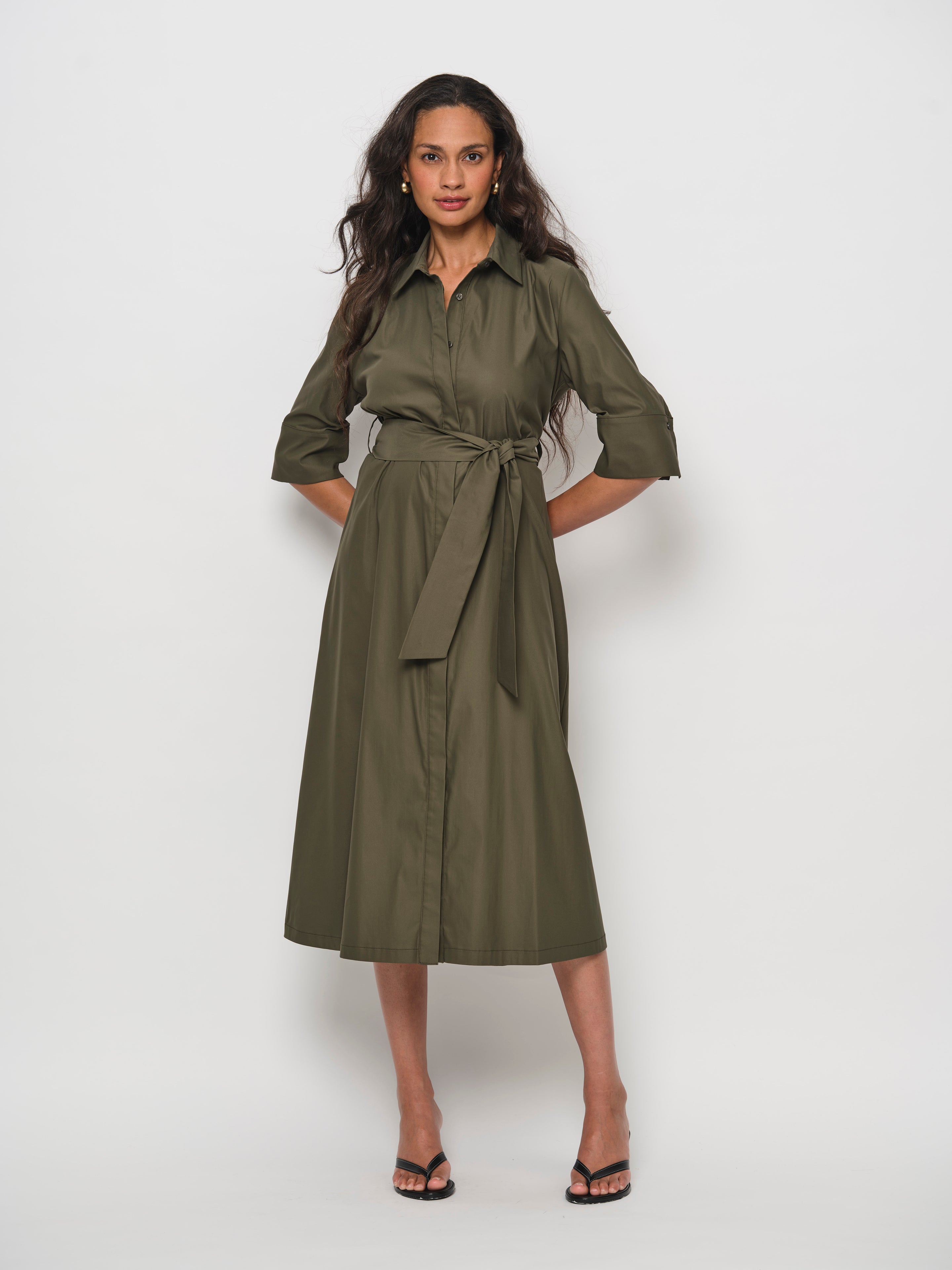 Embrace effortless femininity with this season’s A-Line Shirt Dress, designed with a shirt collar and full button-down front. A fabric waist belt adds a touch of sophistication while flattering the silhouette, and side seam pockets bring practicality to style. Crafted from a premium cotton blend with a subtle satin finish, the fabric is soft, luxurious, and offers generous stretch for all-day comfort and ease of movement.