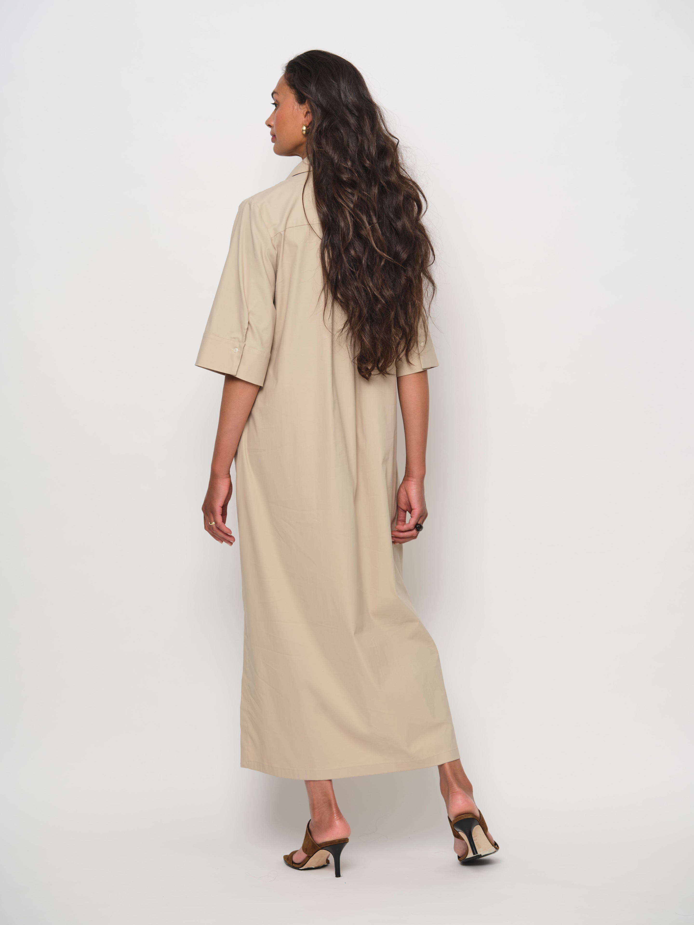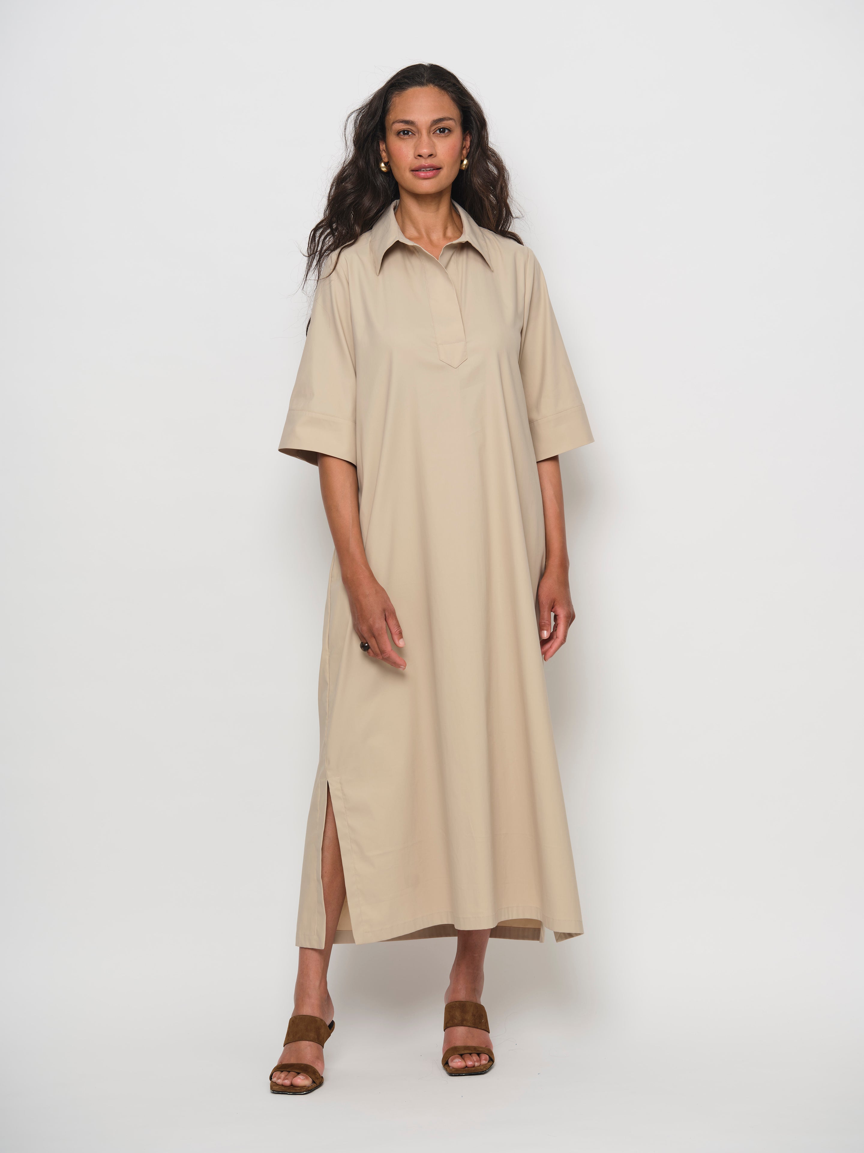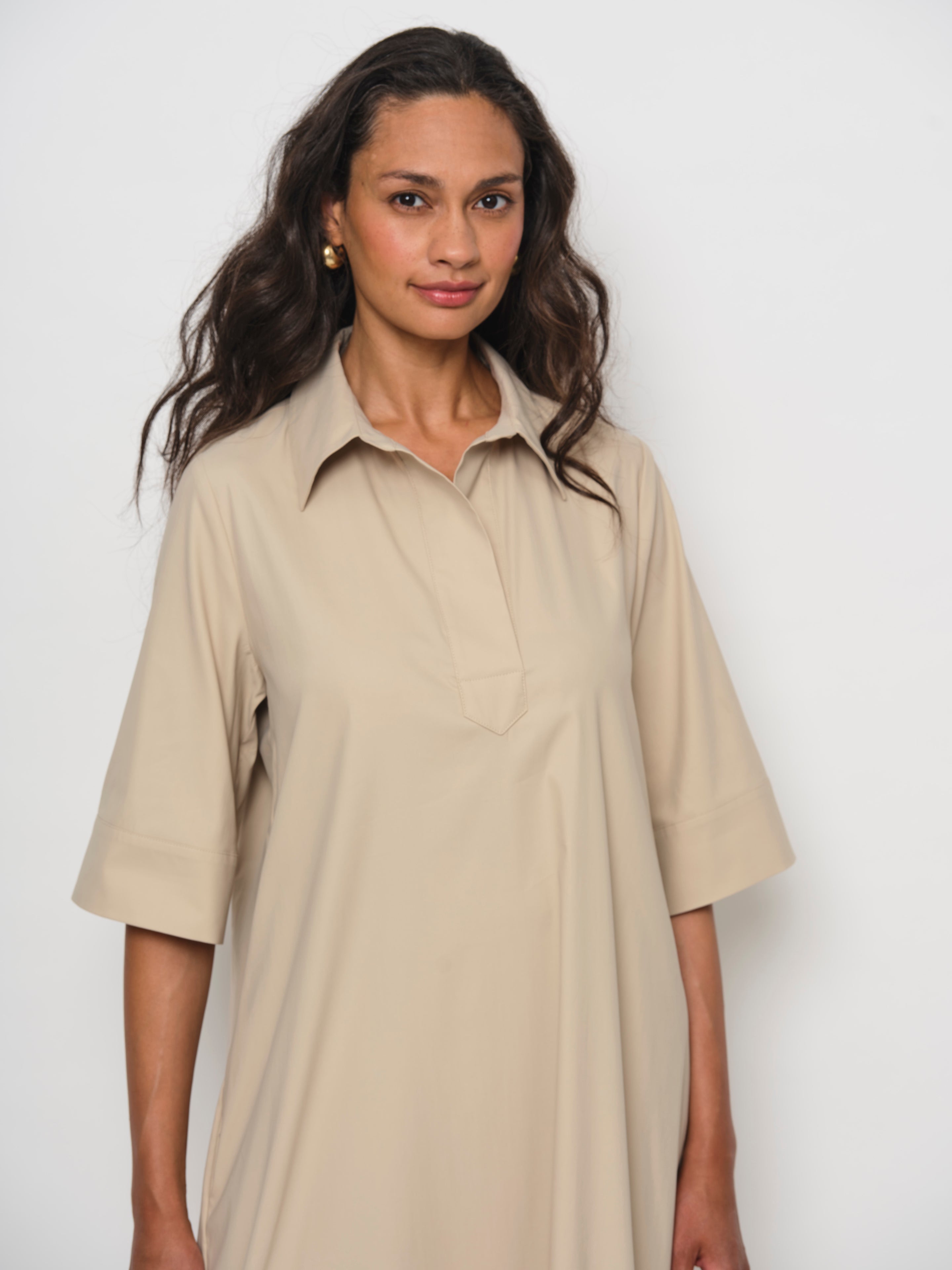 A pop-over dress crafted from a premium cotton blend, offering a soft, luxurious hand feel with a subtle satin finish. The fabric provides generous stretch for all-day comfort and effortless movement. Perfect for versatile styling—pair it with sneakers for a casual day out or sandals for an elevated look.