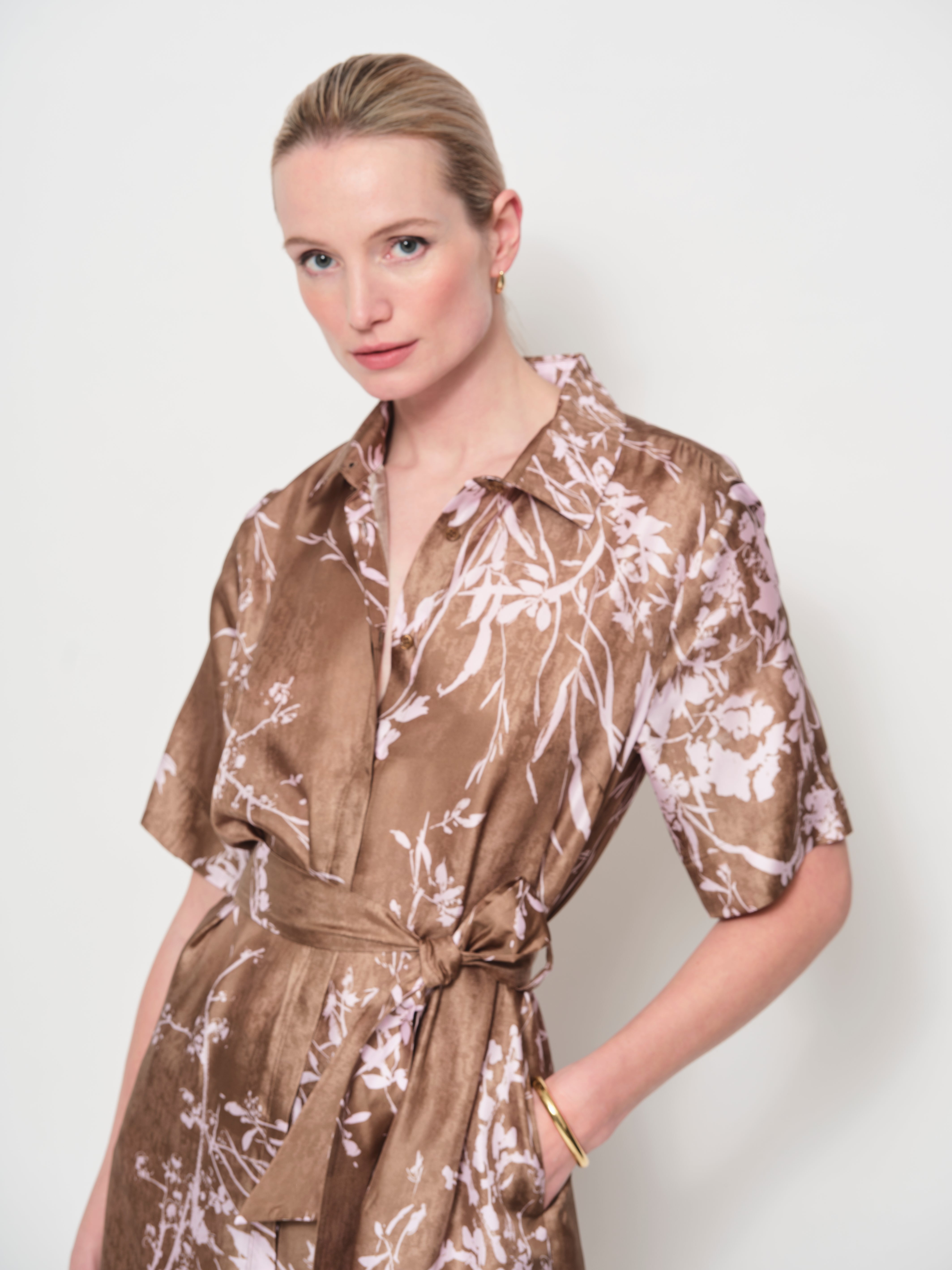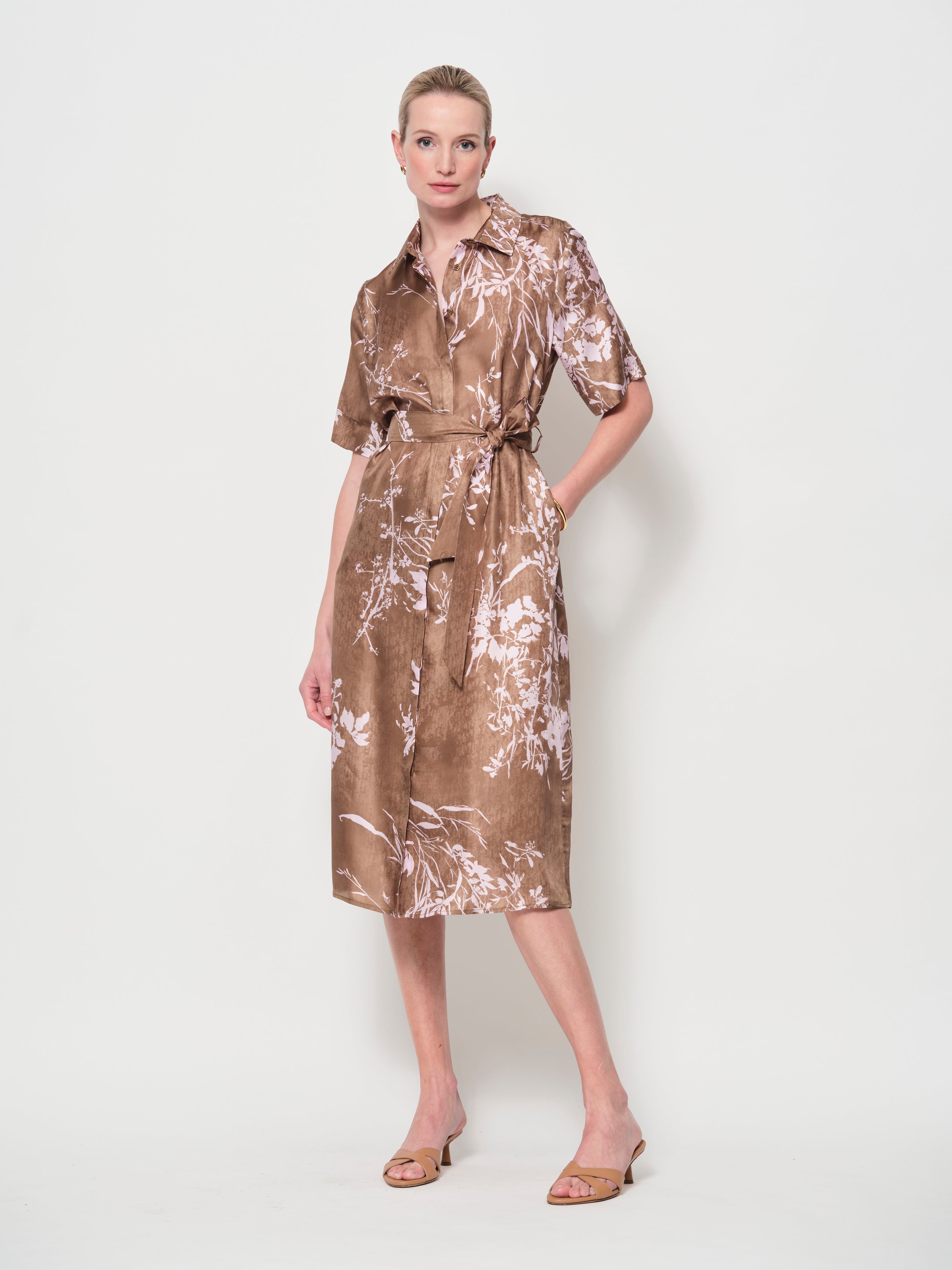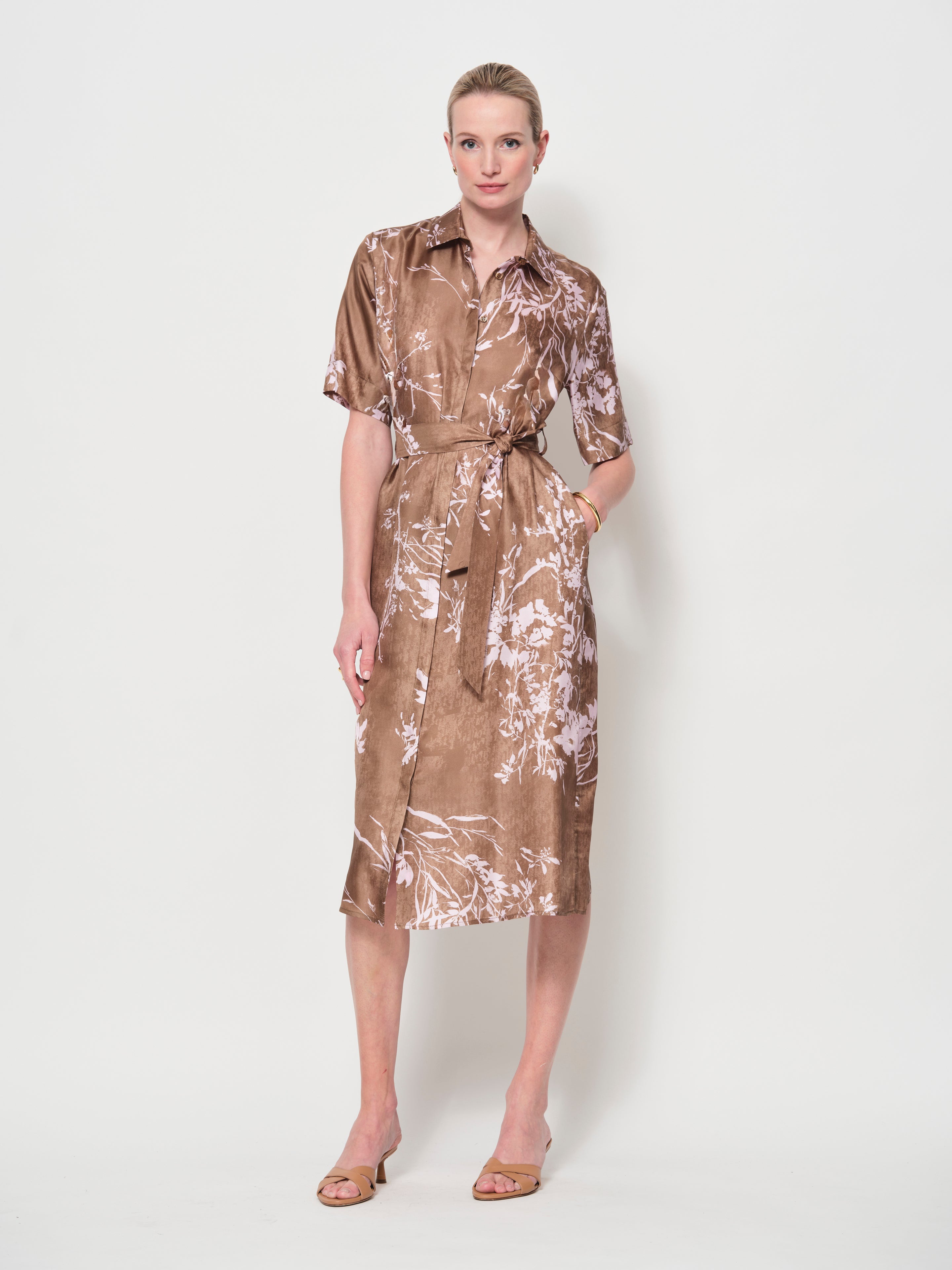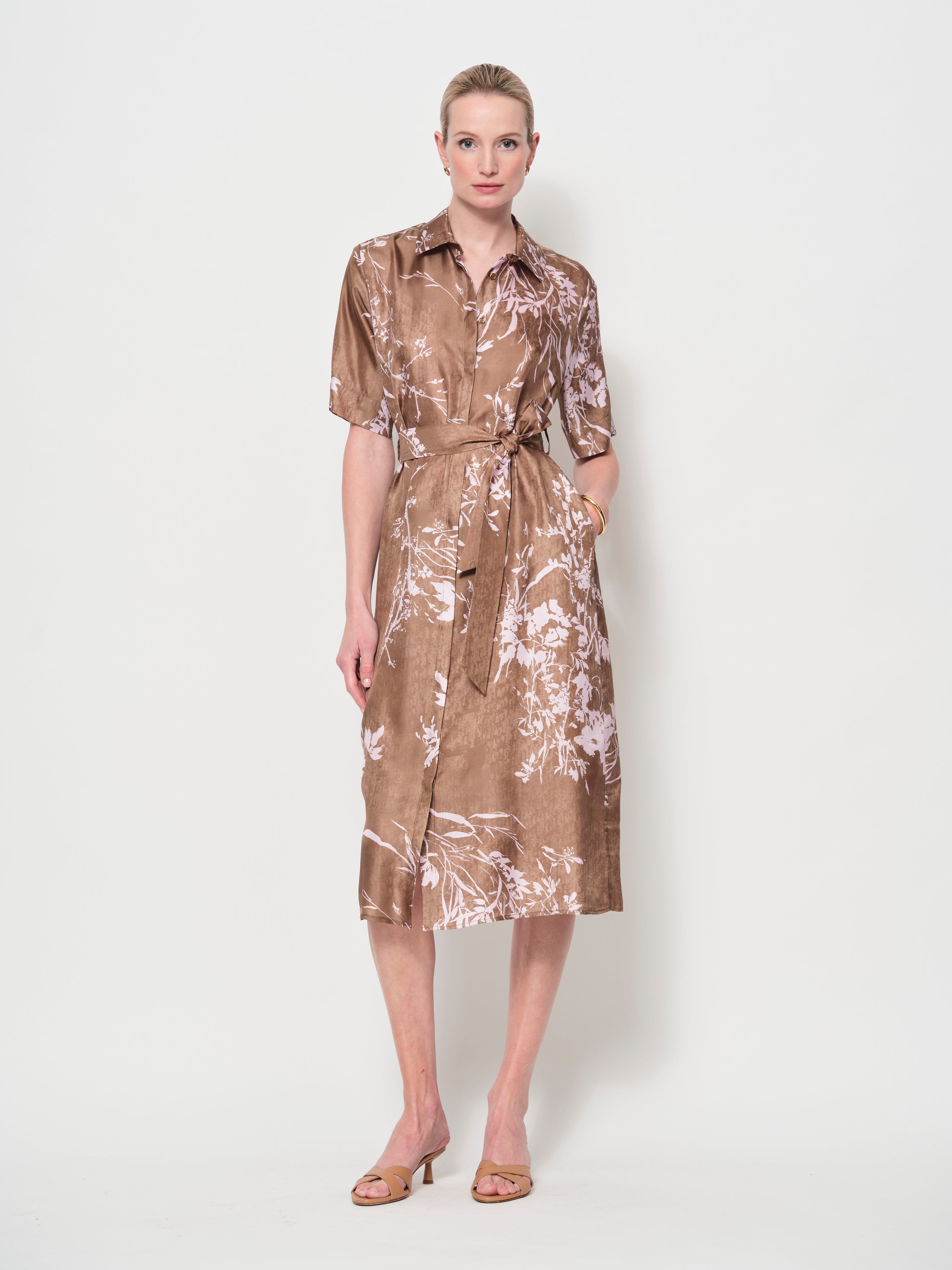 A timeless shirt dress in luxurious Italian silk twill. Designed with a relaxed fit, it features a removable belt to define the waist, short sleeves with wide hems, and side seam pockets. The midi length and classic shirt collar create a versatile silhouette.