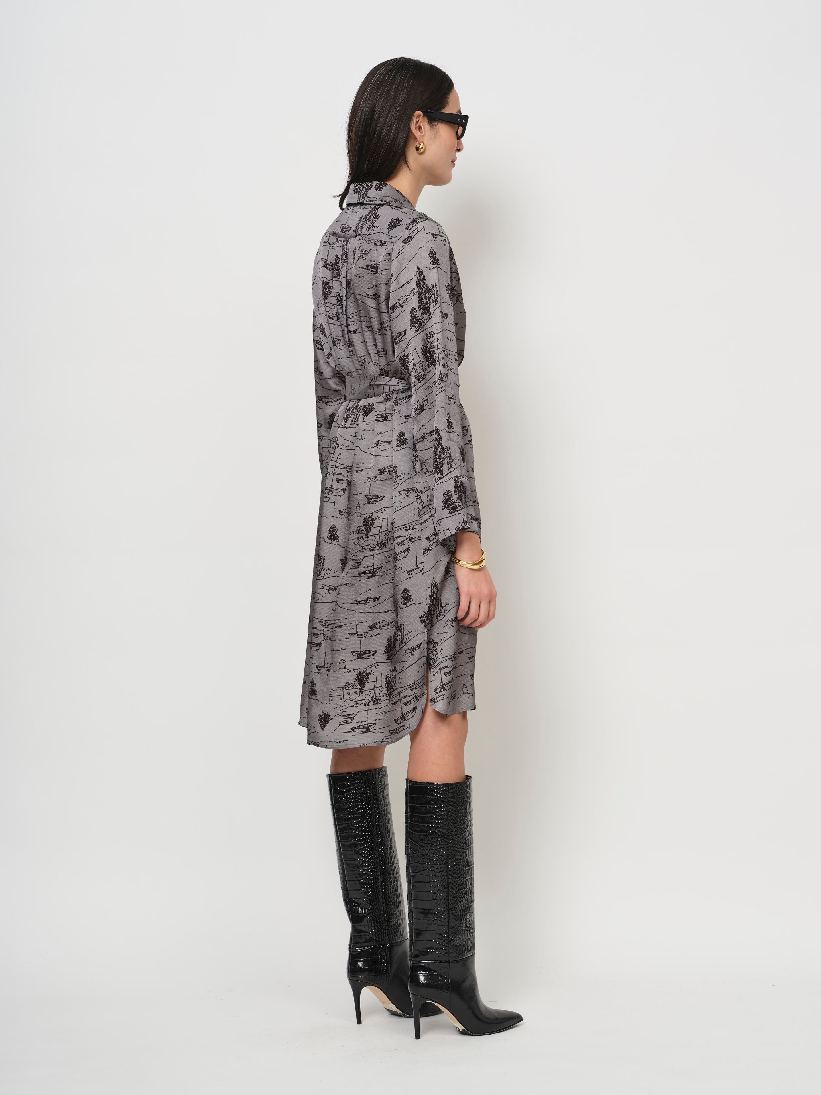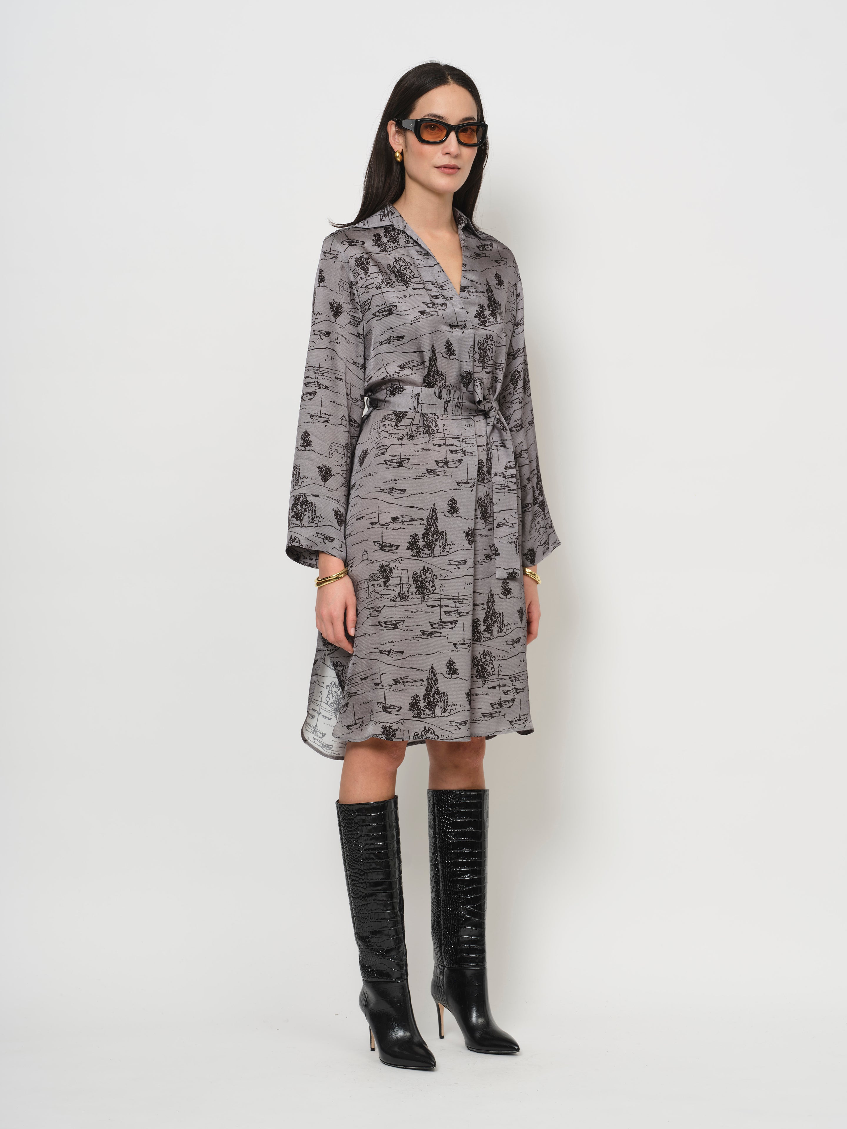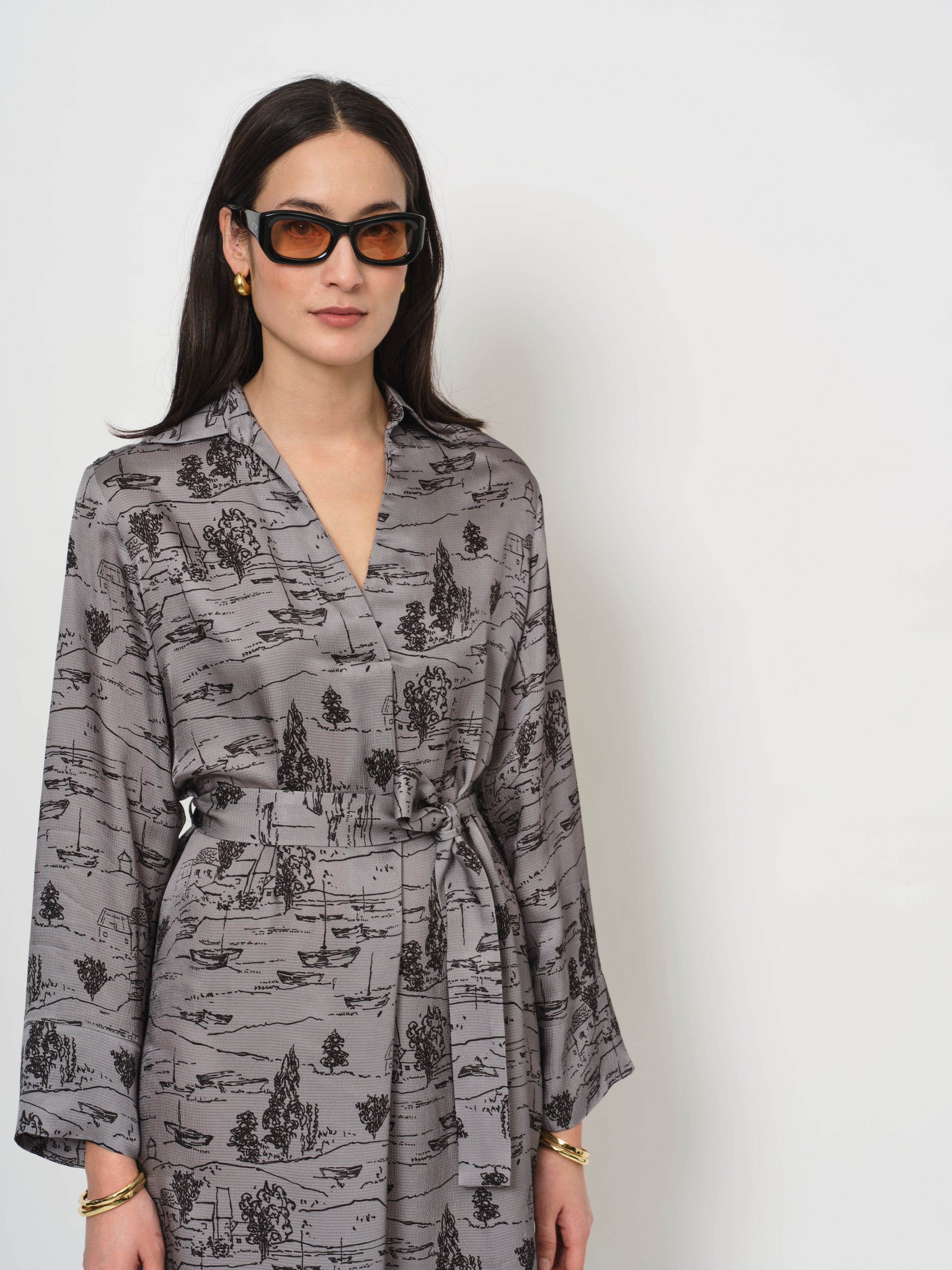 A pop-over dress with wide sleeves, a shirt collar, and a belt that emphasizes natural curves. The print is subtle, the background color elevated. The fabric is light and fluid, with a visible structure (called hammered viscose).