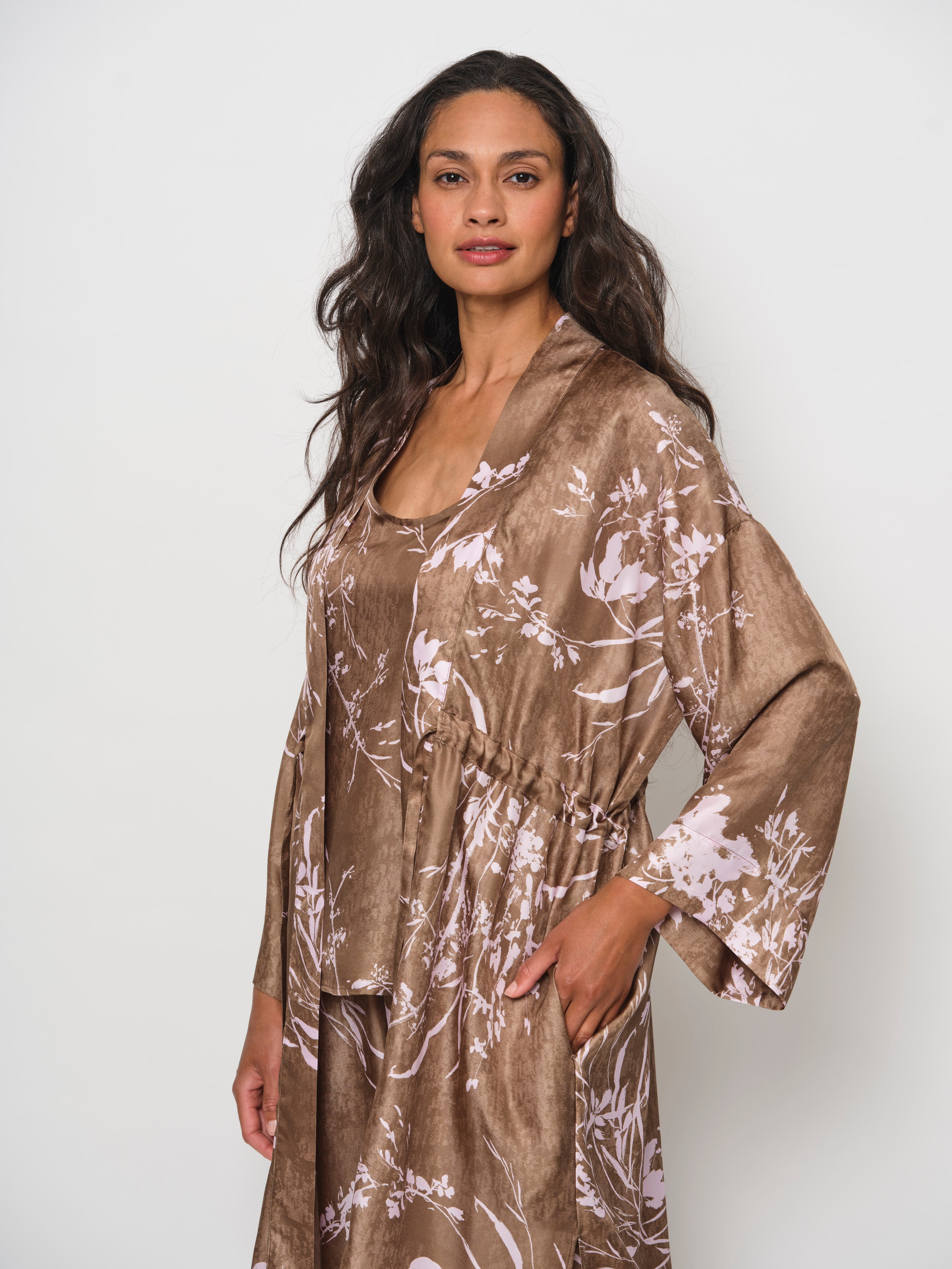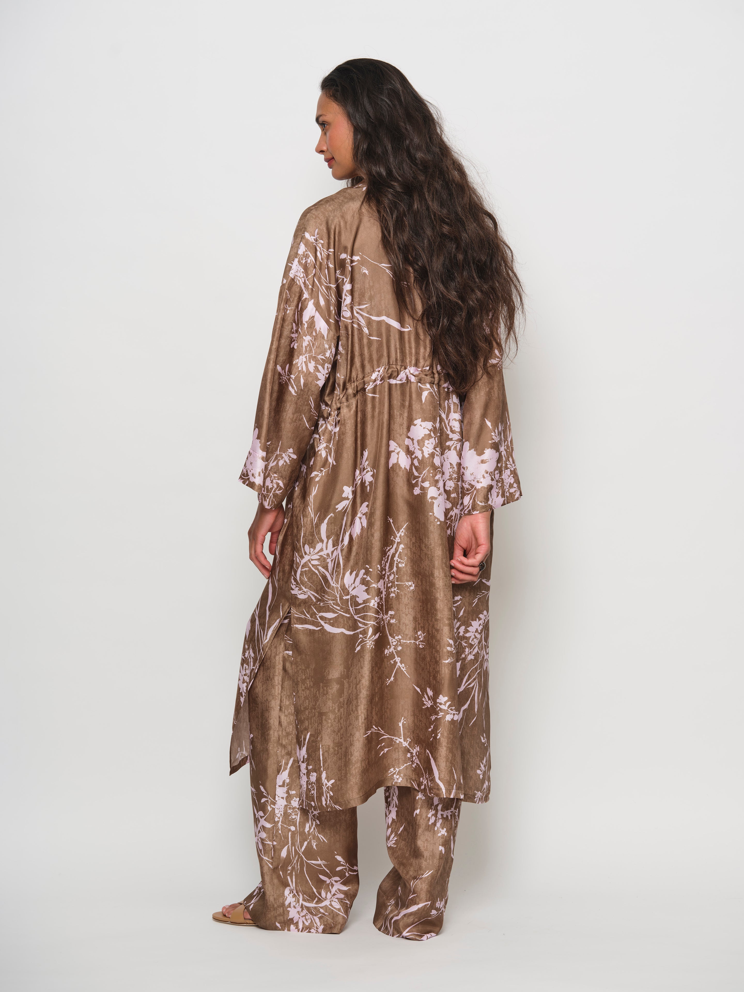A long silk kimono jacket with a stunning print.  Featuring wide sleeves, side seam pockets, side slits, and a tie belt, it creates a relaxed, effortless silhouette. Crafted in an exclusive print, it’s perfect for evening outings, seaside escapes, or layering over dresses and jeans. Matching items are available for a coordinated look.