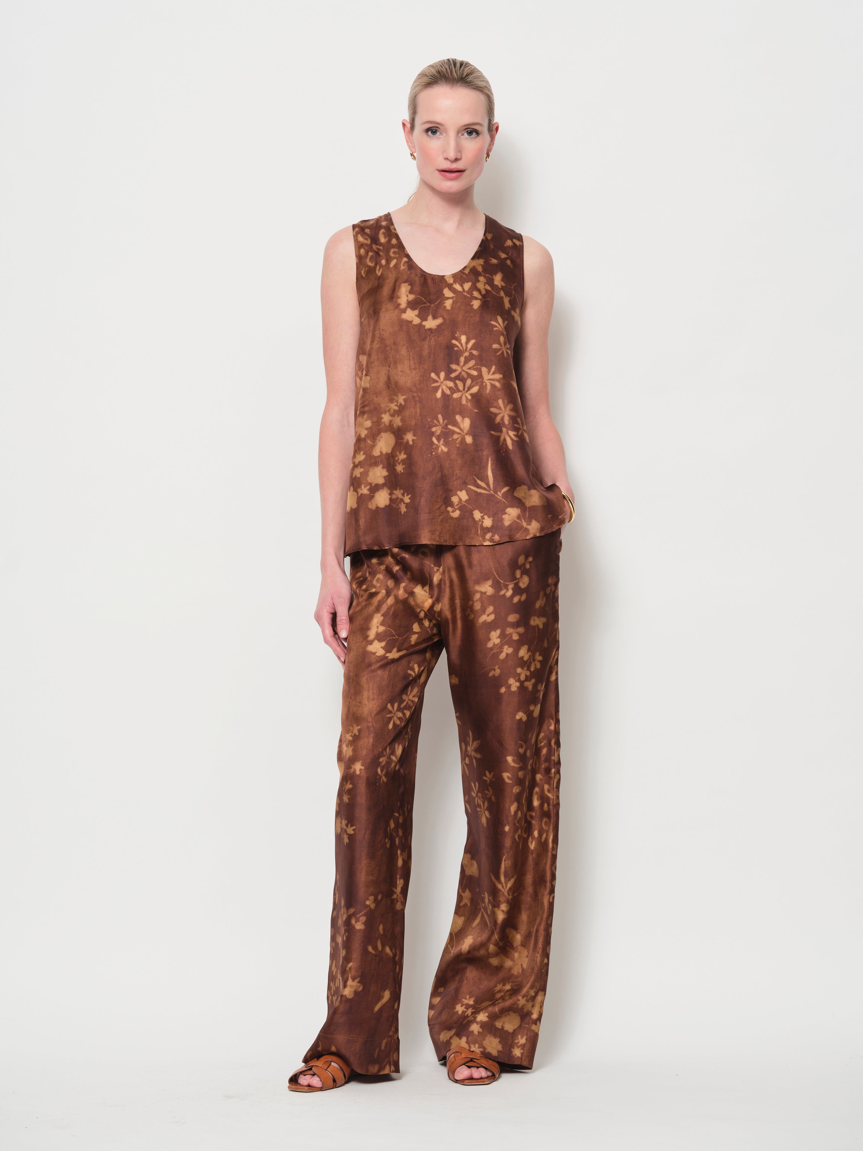 Crafted from Italian silk twill, these wide-leg trousers feature a soft, fluid fabric with a unique, striking summer print. An elasticated waistband and side pockets ensure comfort. Pair with matching silk tops for a coordinated outfit.
