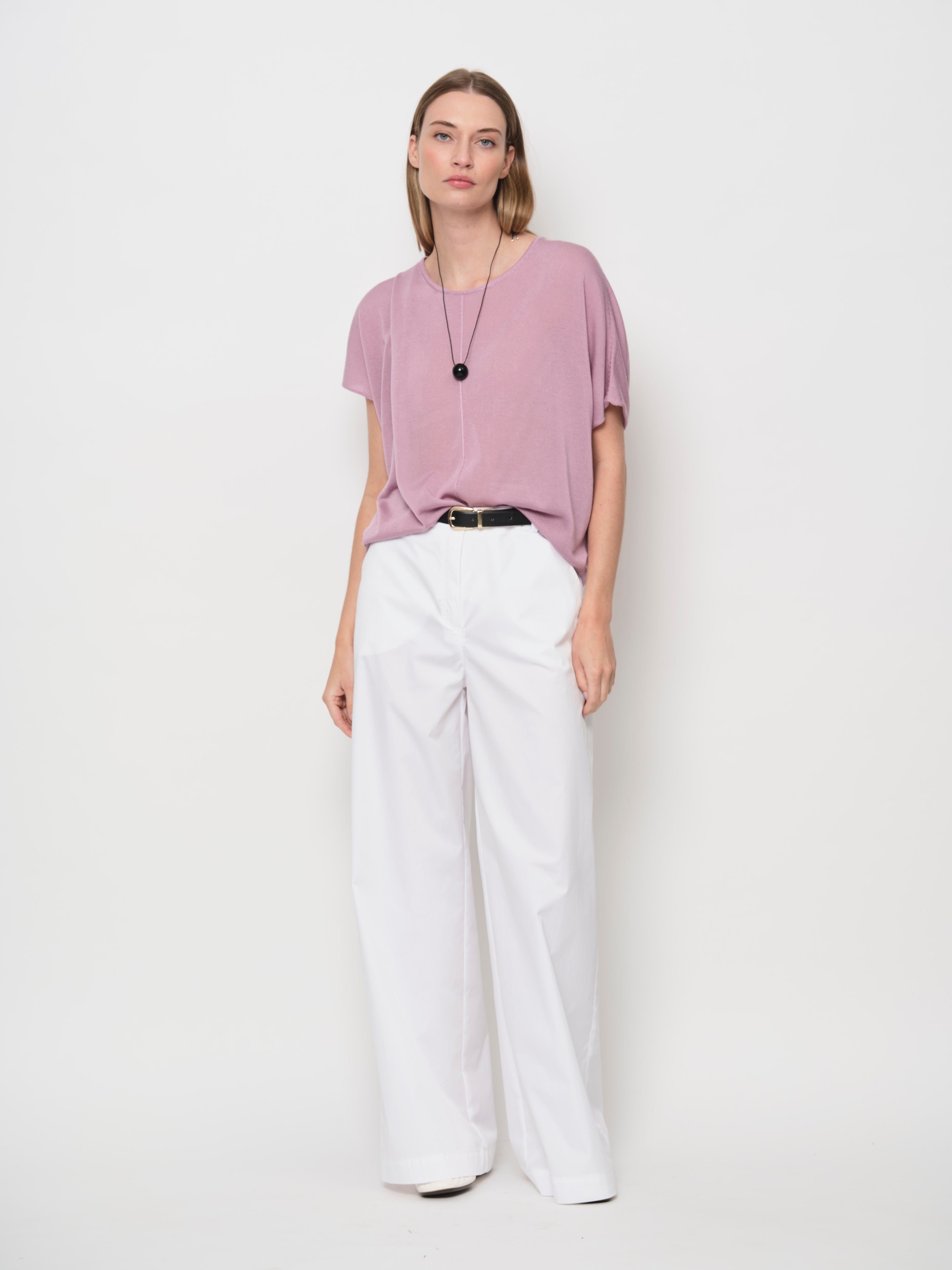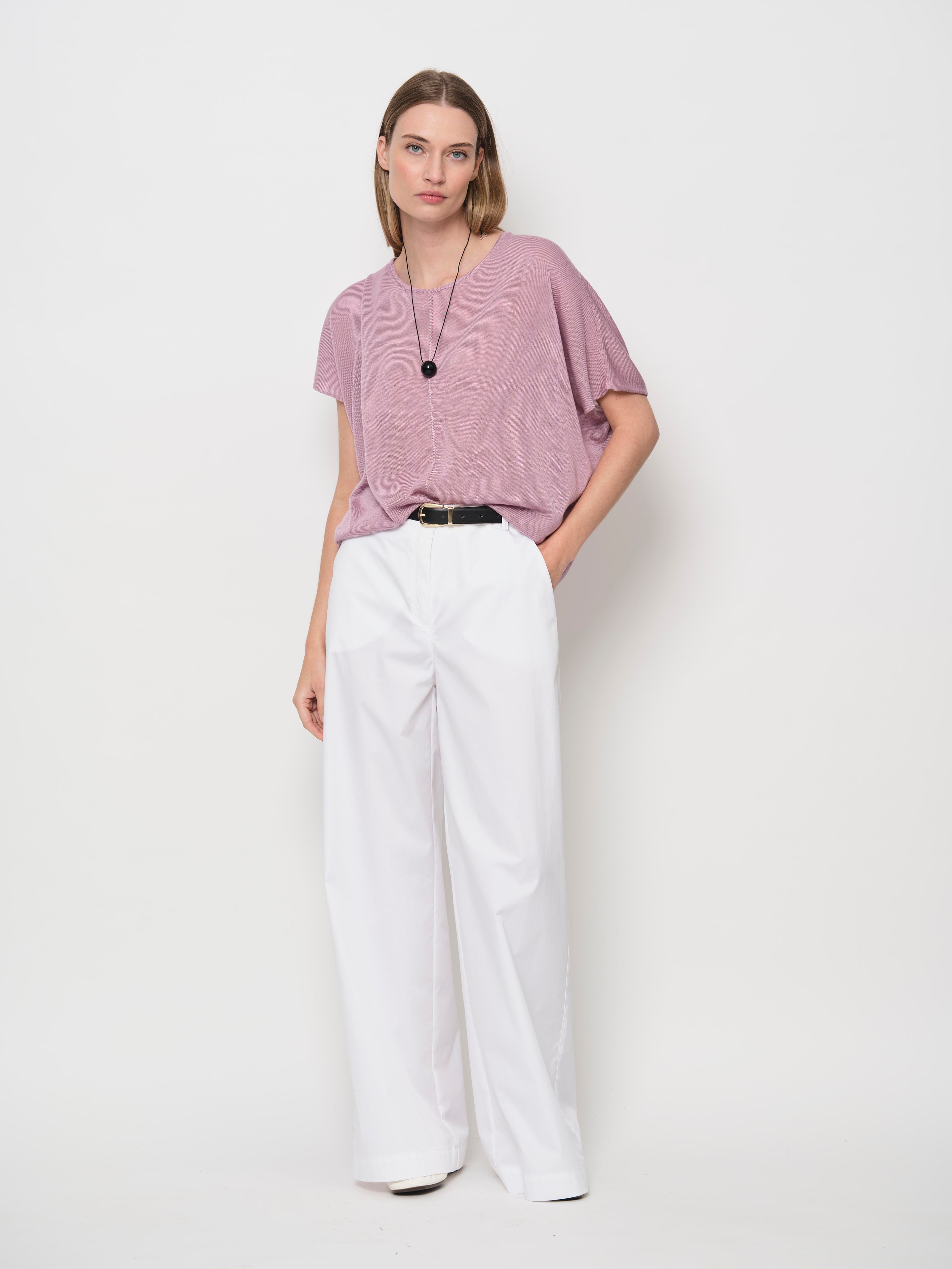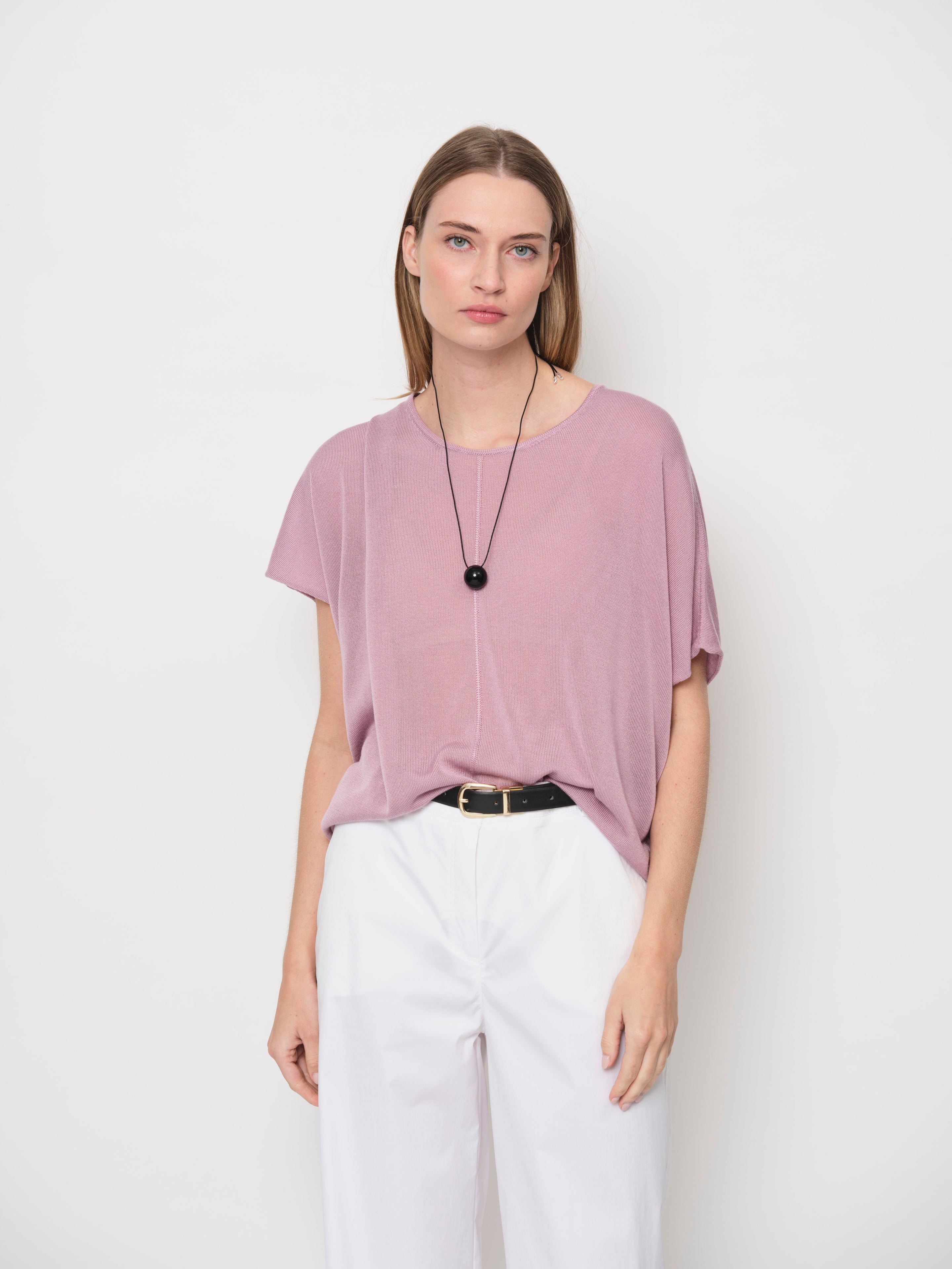 Introducing a new yarn for SS26 - a Tencel yarn that is soft, breathable, and luxuriously silky. This Tencel knit sweater features a crew neckline, batwing sleeves, and a center-front seam for subtle detail.