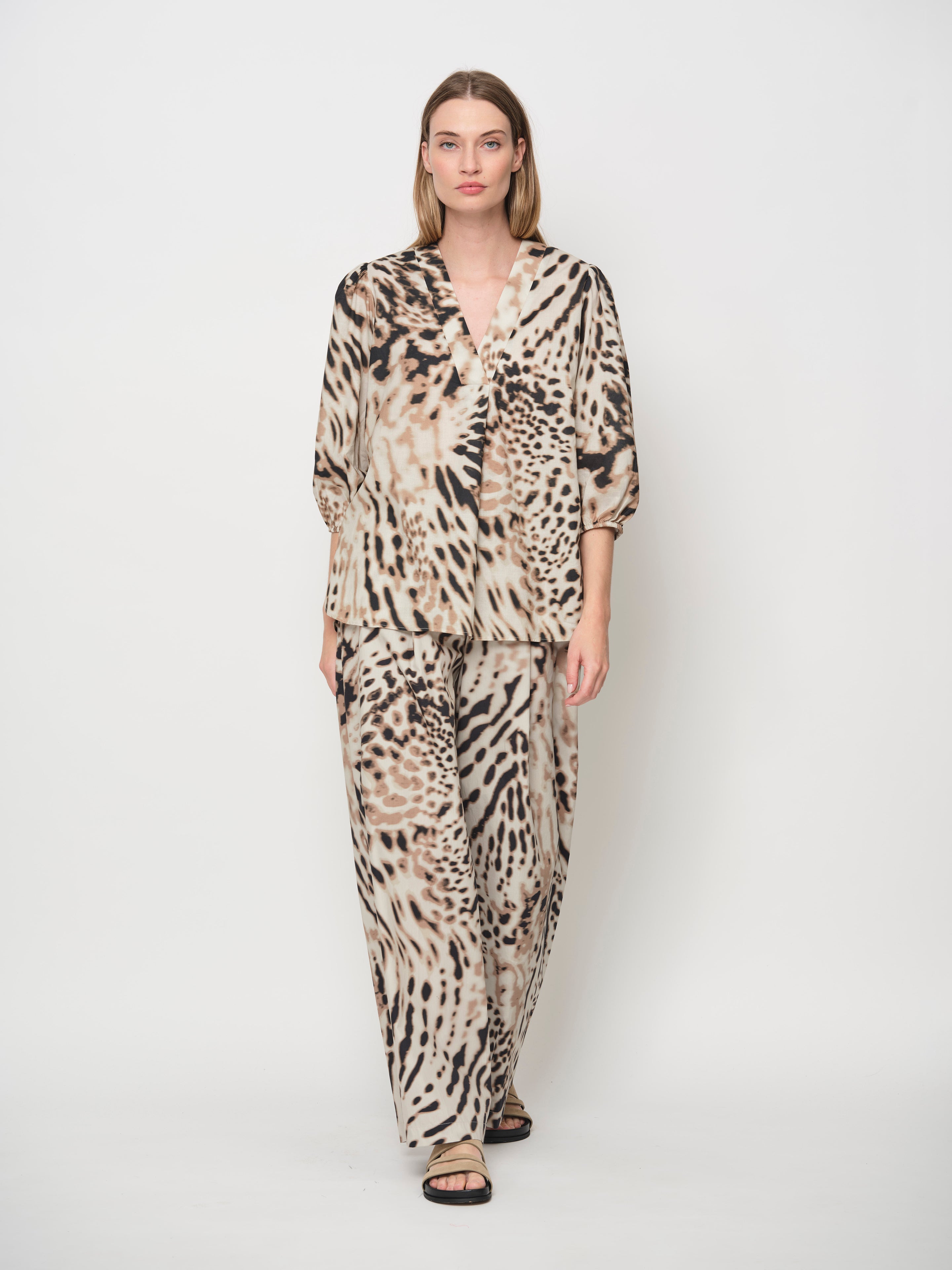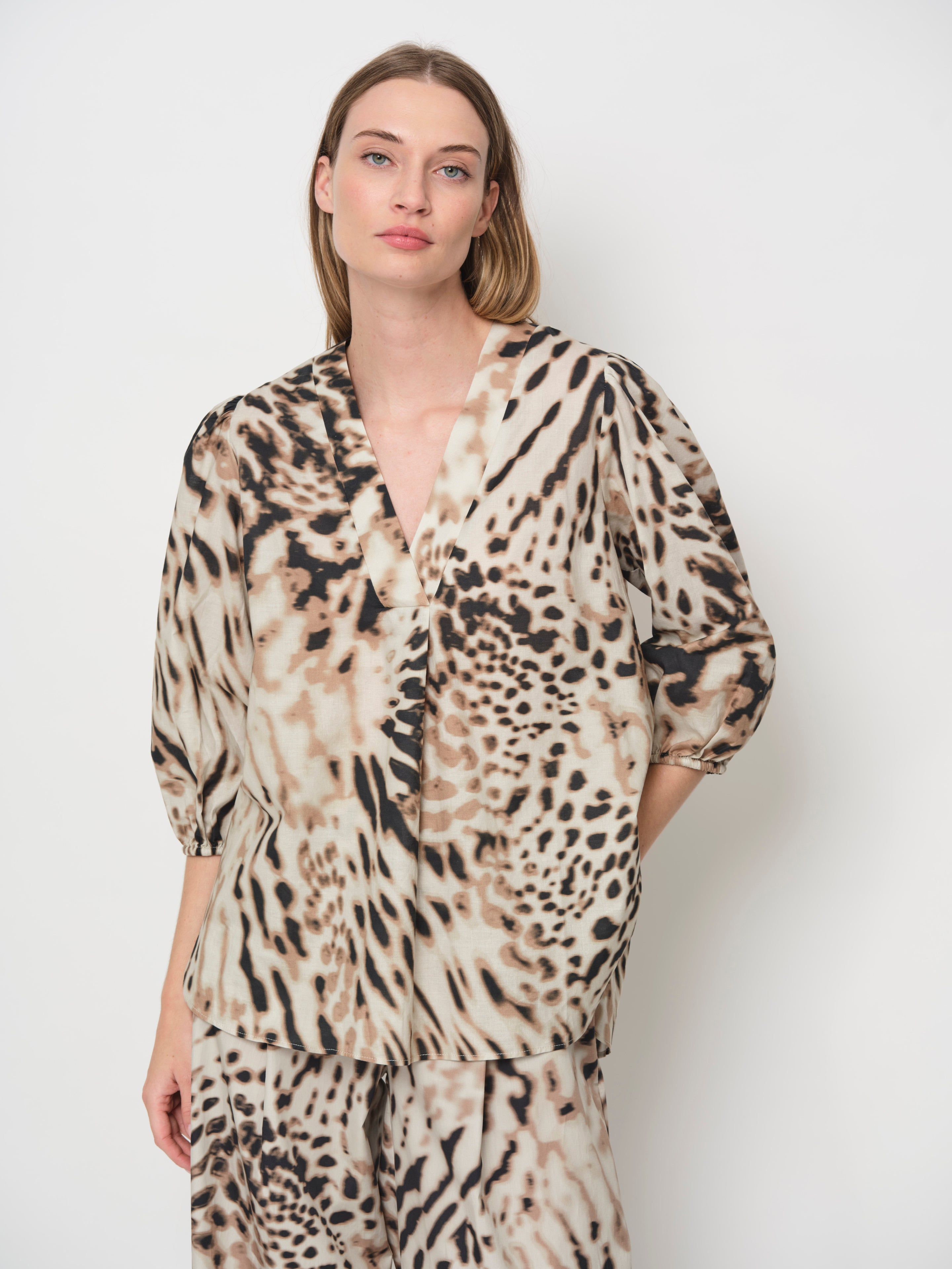 Featuring a V-neckline and three-quarter sleeves with elasticated cuffs and subtle gathering for a balloon effect, it offers a relaxed, effortlessly stylish look. Pair it with matching printed pants for a coordinated ensemble.