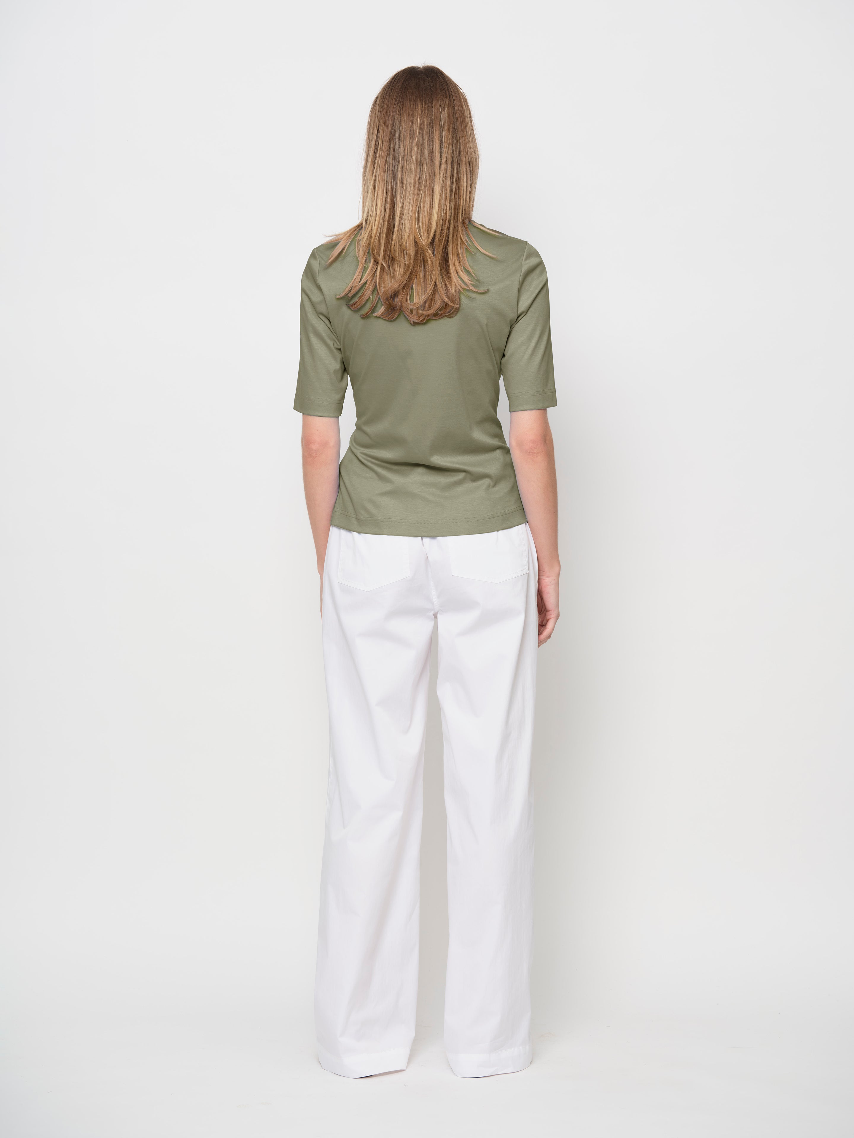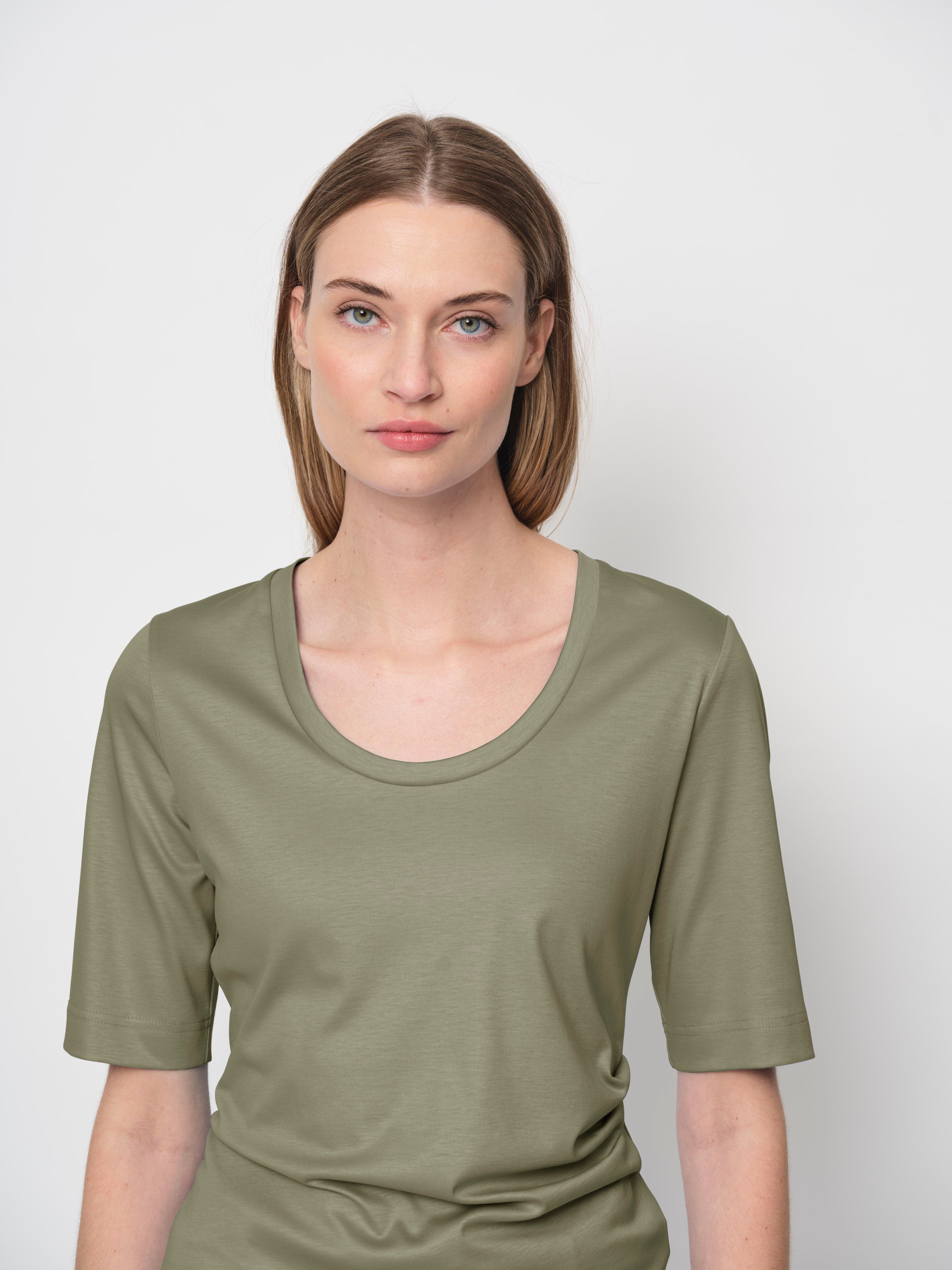 A basic made from a luxurious TENCEL™ Lyocell jersey, this fabric is soft, silky, breathable, and slightly stretchy, providing all-day comfort. The scoop neck top features elbow-length sleeves and a slim, semi-fitted shape.