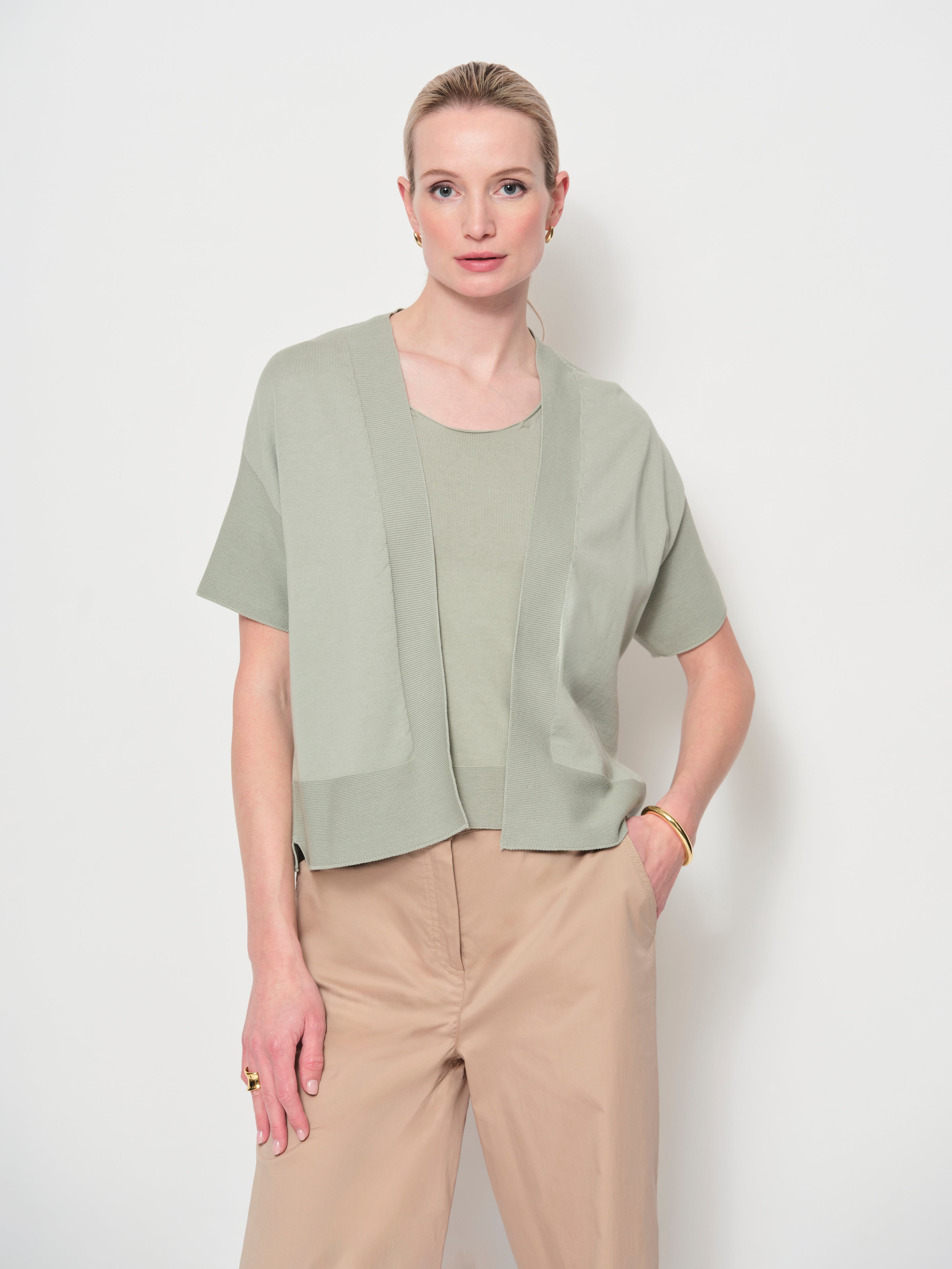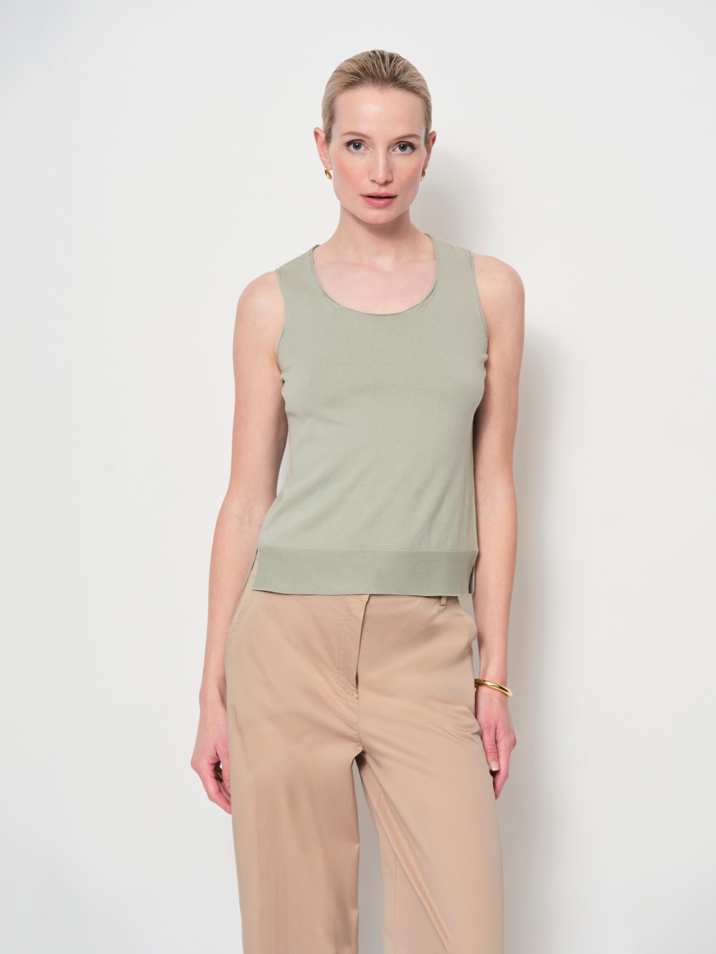 Relaxed, slightly loose-fit sleeveless top crafted from soft, breathable cotton knit. Features a sleeveless design with a classic scoop neckline. Its lightweight fabric makes it perfect for layering or wearing on its own. Matching cardigan available.