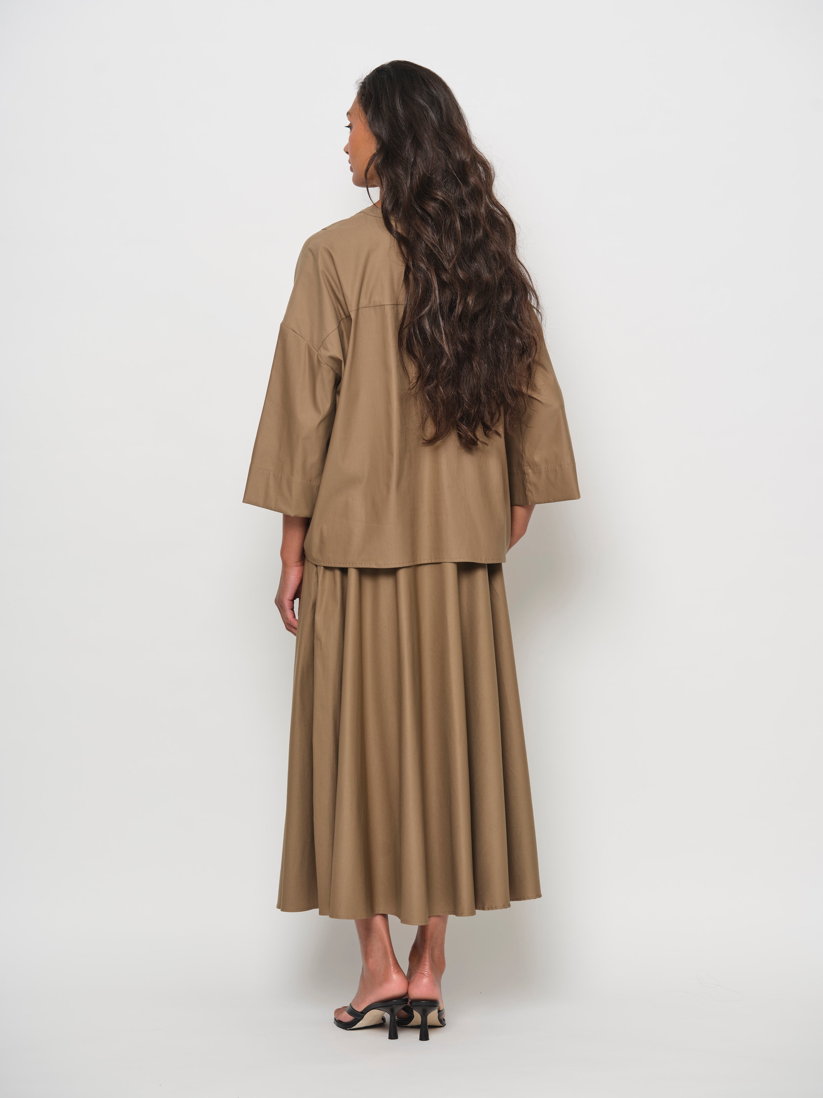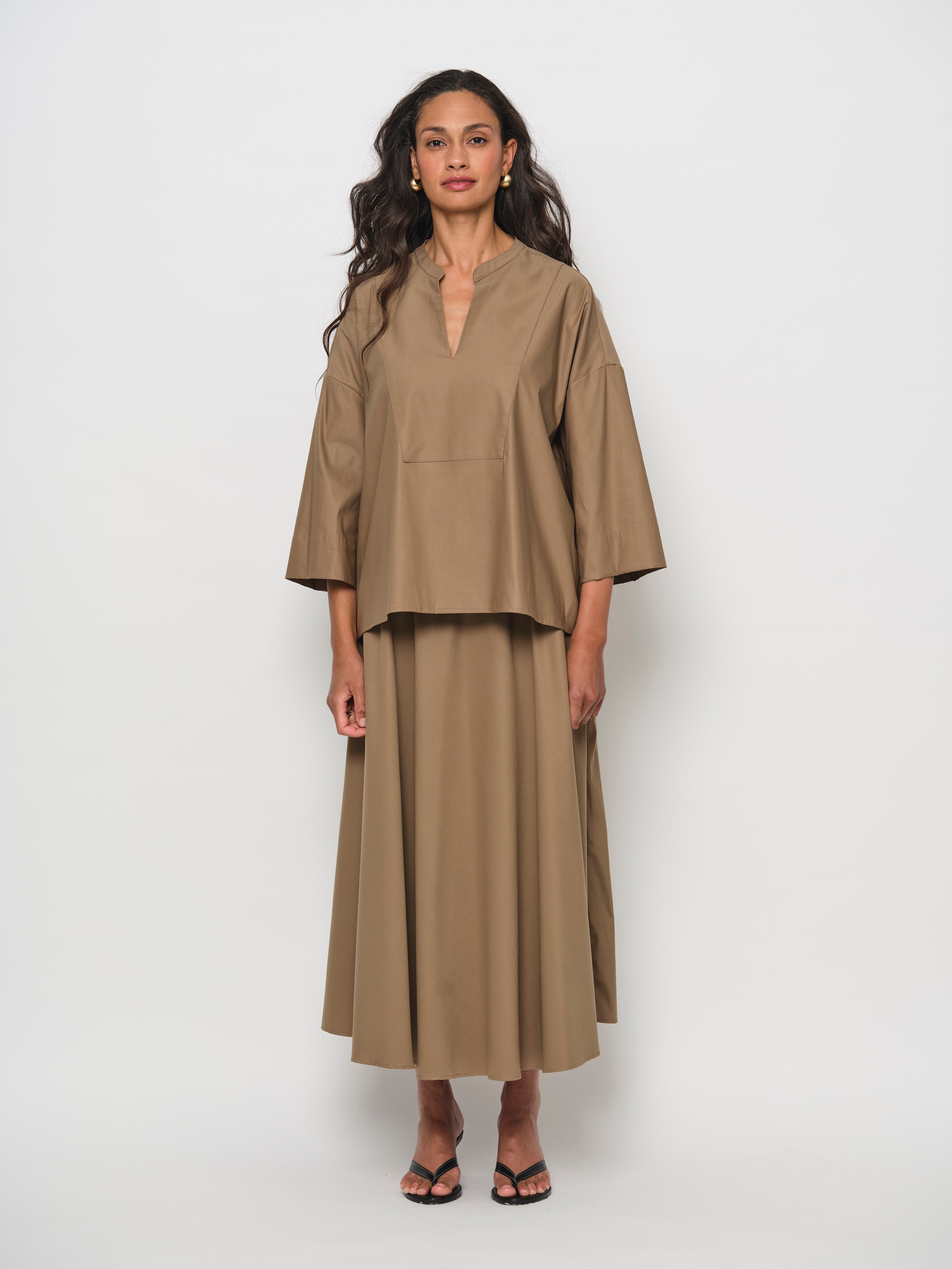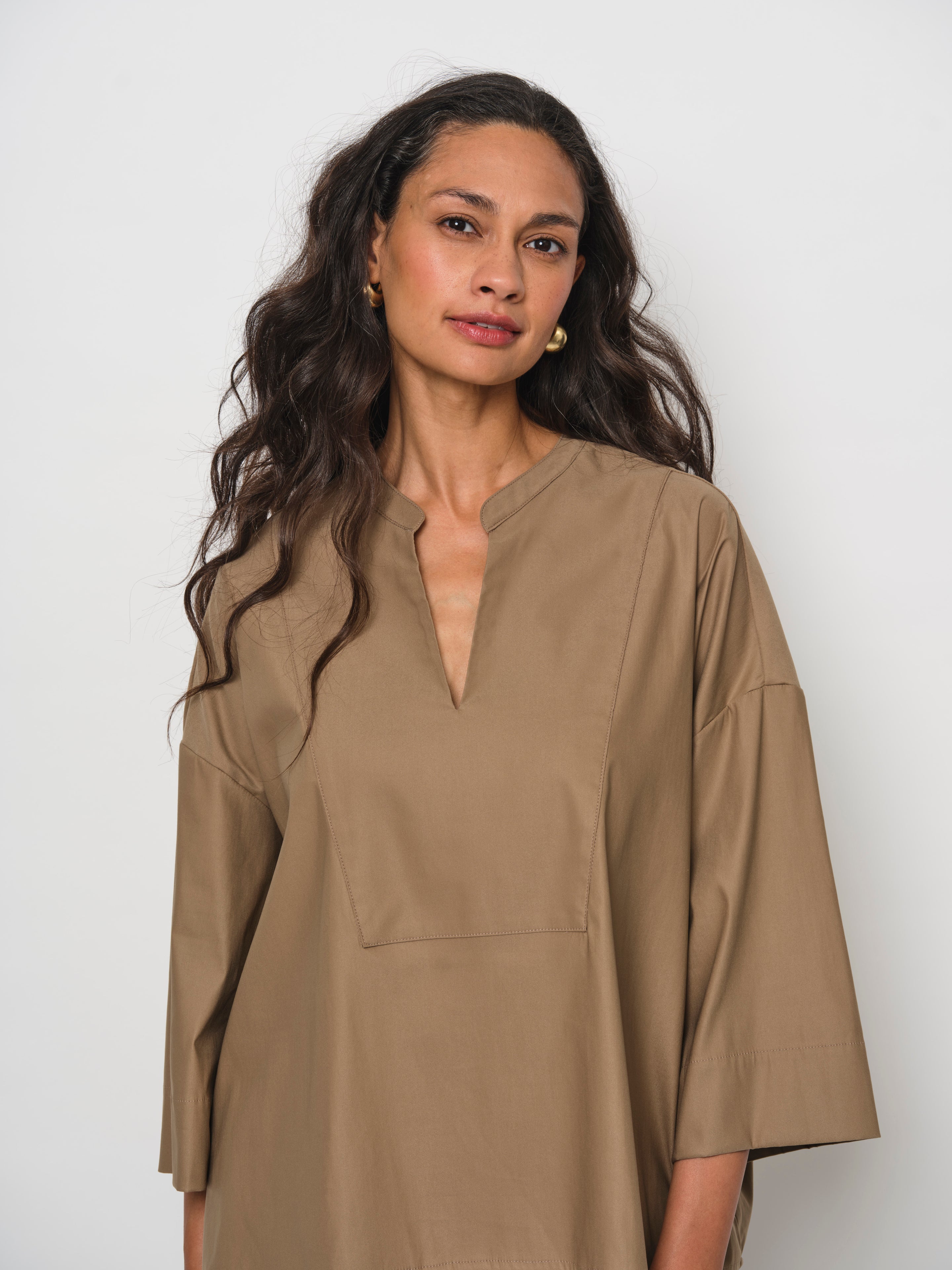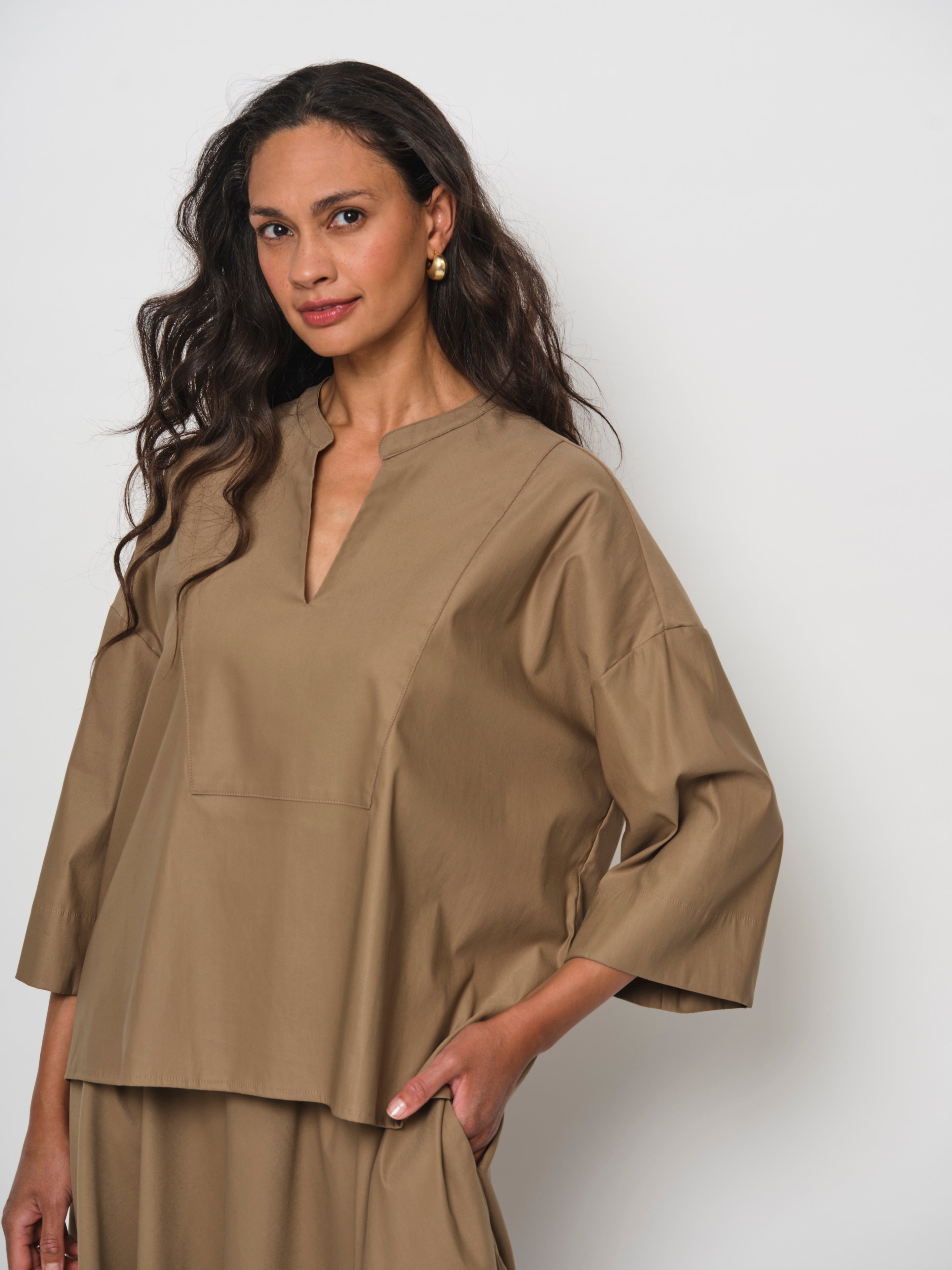 The Stand Collar V-Neck Blouse is crafted from luxuriously soft cotton with a satin finish. It features a subtle V-neck with bib detail and three-quarter sleeves with a drop shoulder.