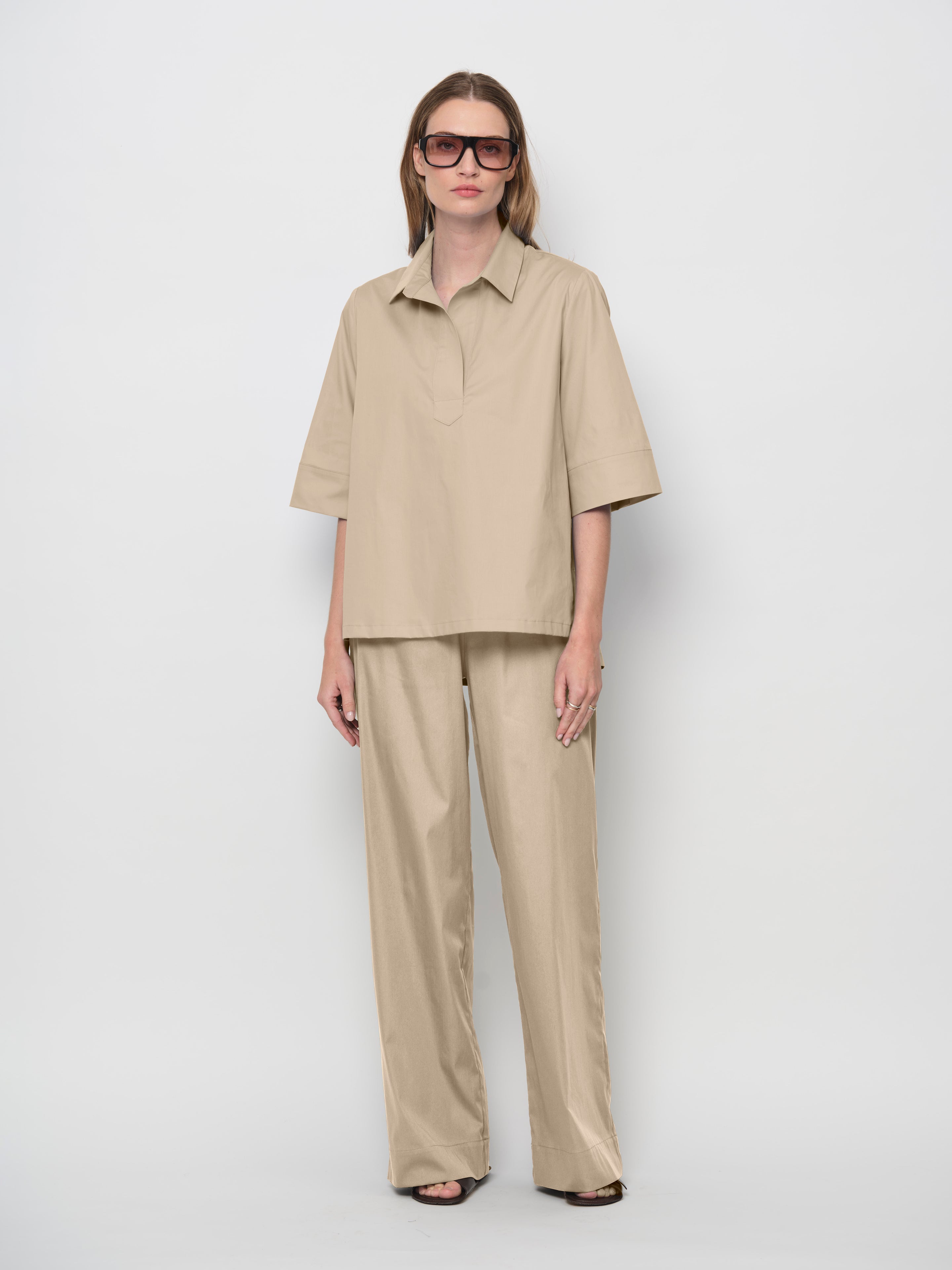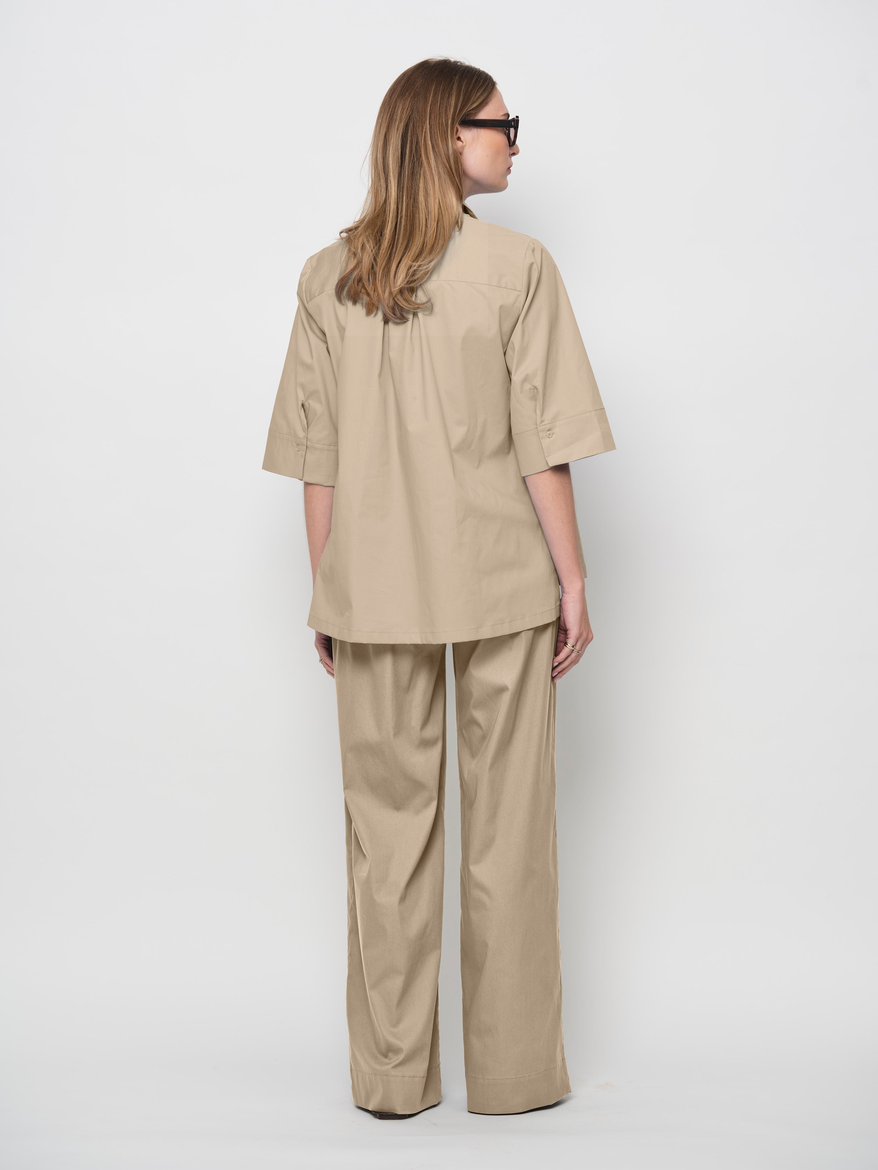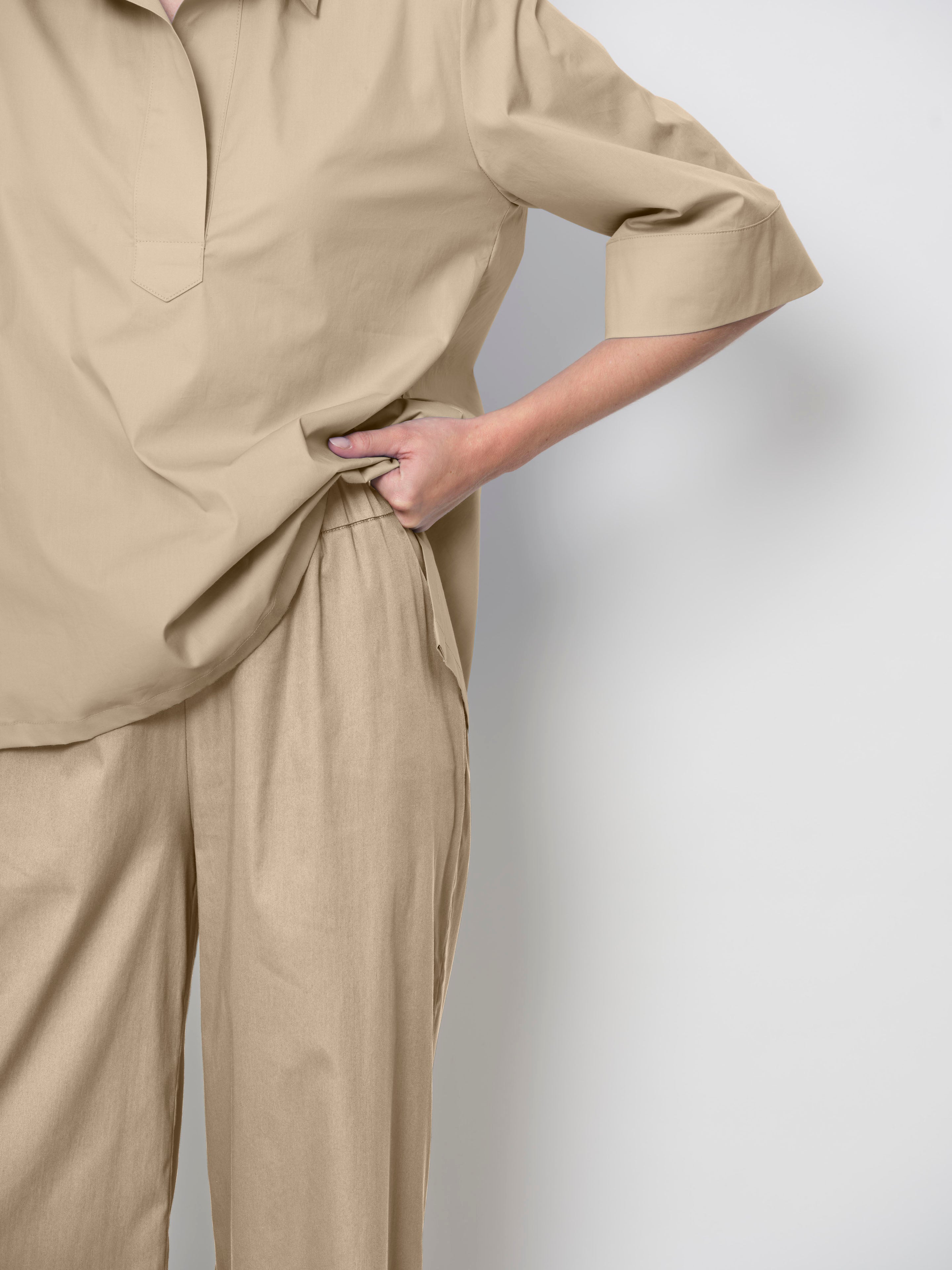 This the perfect casual trouser - super comfortable, elasticated waist made from a stretch cotton with a slight sheen. Pockets in side seam. Wear with anything! Falls large, choose a smaller size for a slimmer fit.